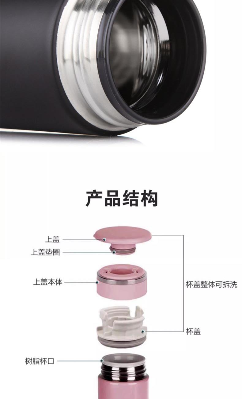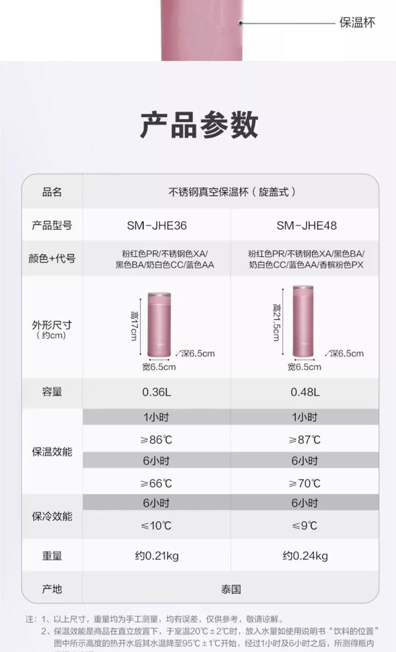 型号:SM-JHE48 颜色:粉红色PR、黑色BA、奶白色CC、蓝色AA、香槟粉色PX 容量:480ml 开盖方式:旋转开盖 涂层:无涂层 保温效率:87℃/1h、70℃/6h 保冷效率:9℃/6h 外形尺寸(宽深高):6.5×6.5×21.5cm 产地:泰国 经典旋盖,密封设计,保温保冷 宽口径设计,瓶口宽约4cm,方便杯内清洁,同时杯身整体也可清洗 光洁加工内胆,内壁光滑,容易清洗,同时杯盖整体可拆洗