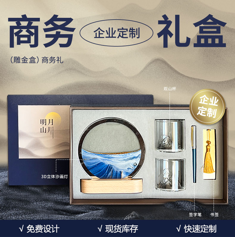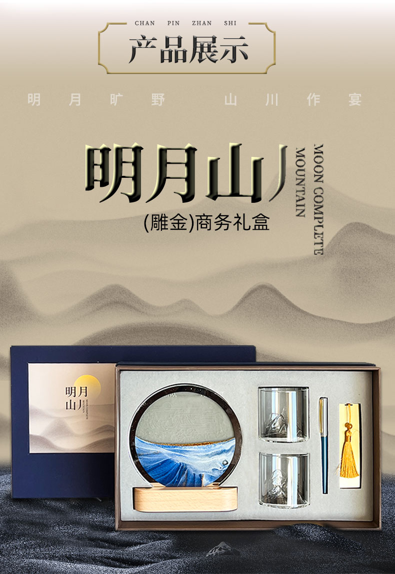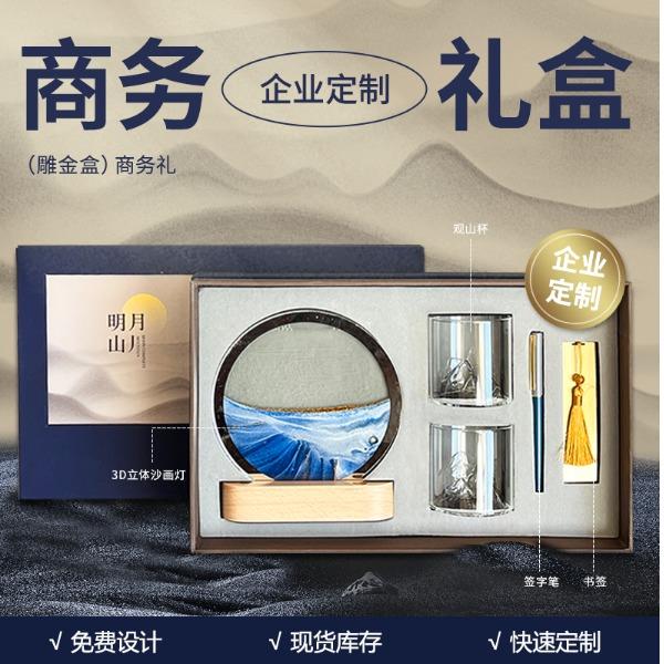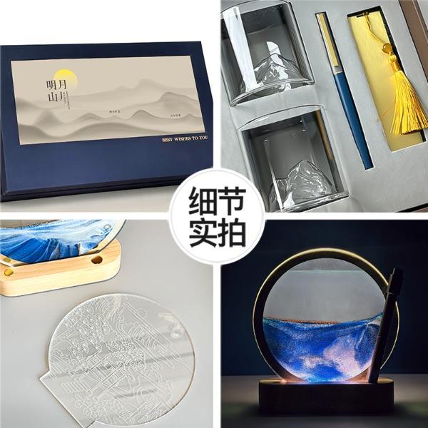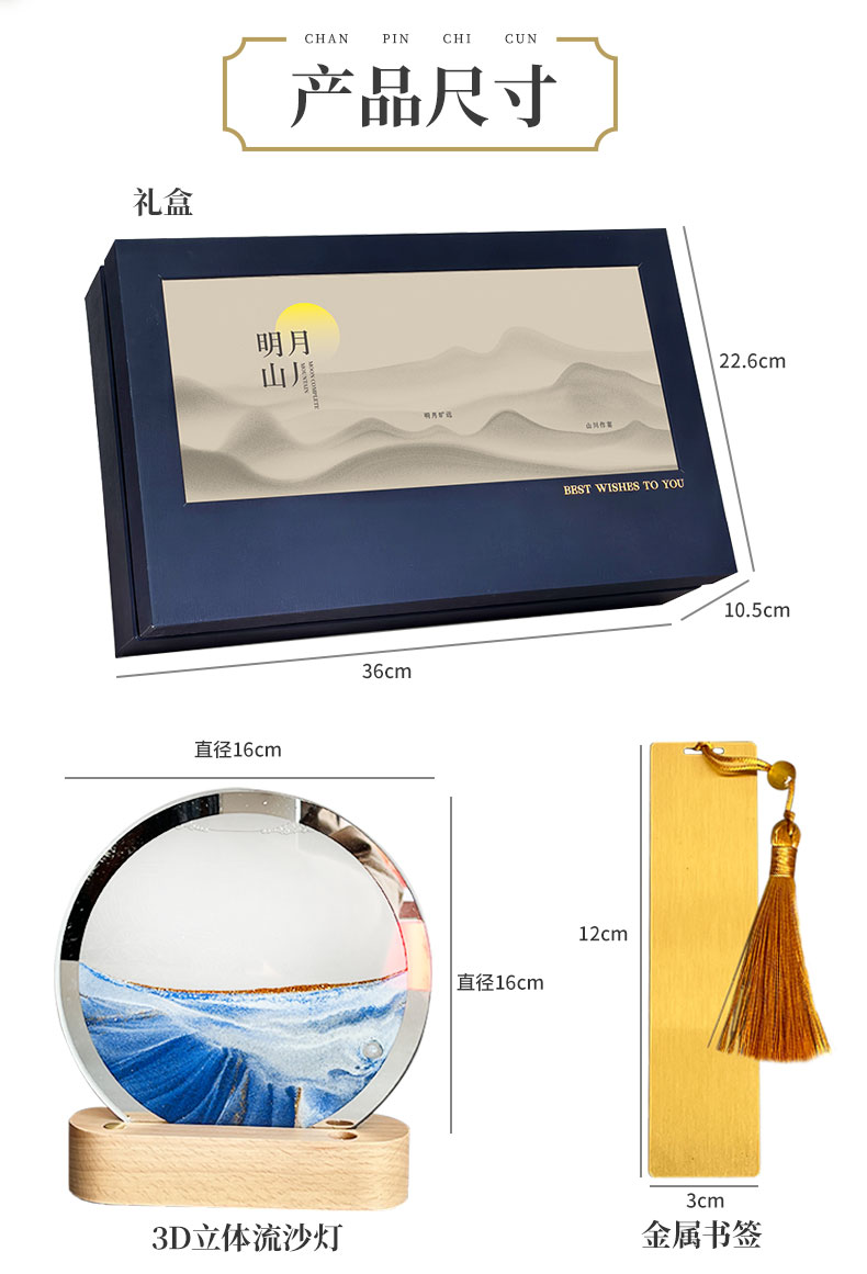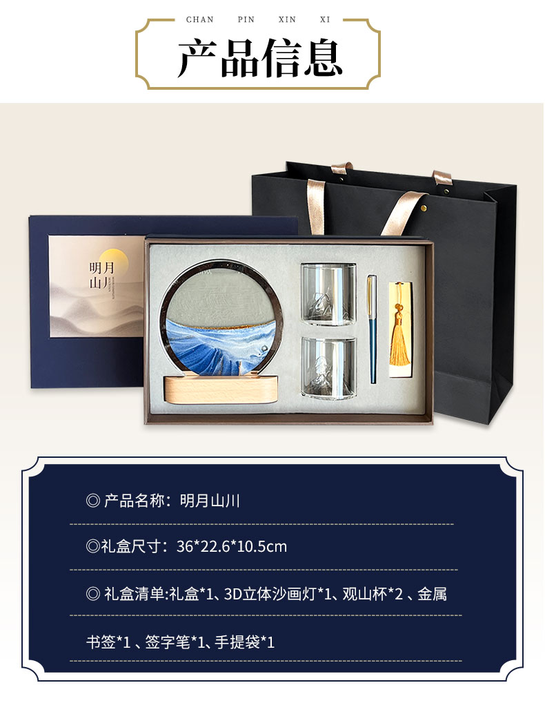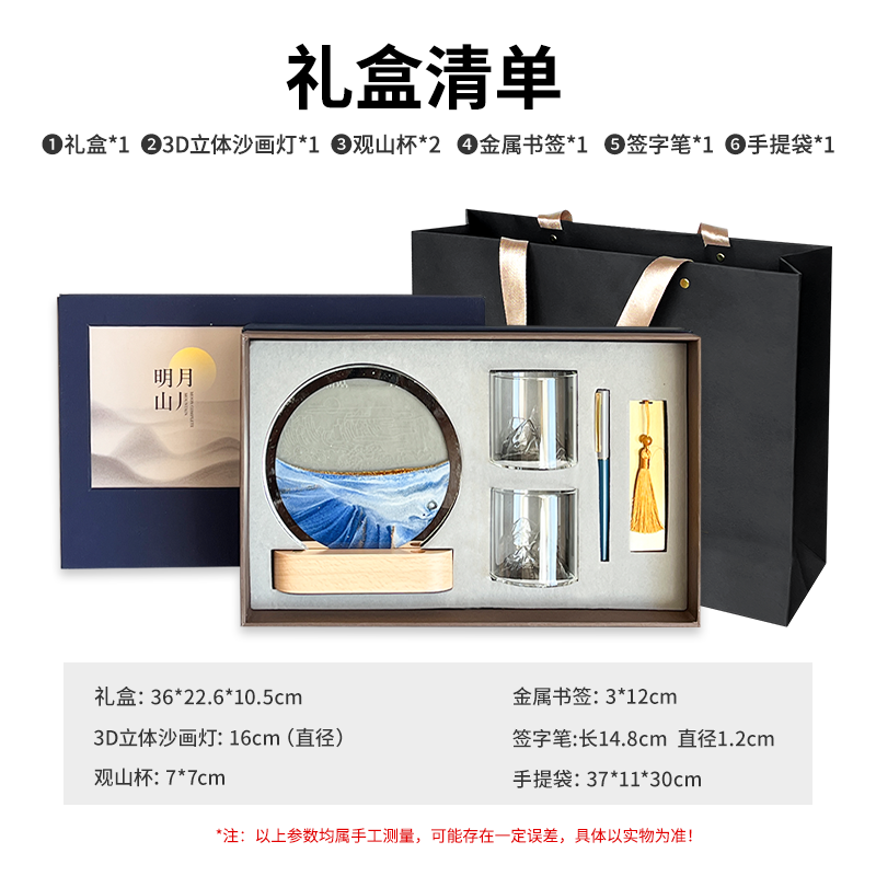 ❶ 3D立体沙画灯(含透明亚克力片) 光源:白色 沙画直径:16cm ❷ 观山杯 数量:2个 功能:茶杯、威士忌酒杯 材质:玻璃 尺寸:7*7cm ❸ 金属书签 材质:金属 尺寸:3*12cm ❹ 签字笔 0.05cm笔芯 尺寸:长14.8cm直径1.2cm ❺ 手提袋 材质:黑色特种纸 尺寸: 37*30*11cm