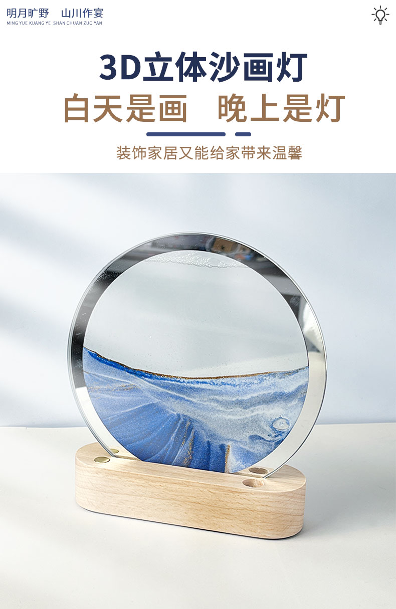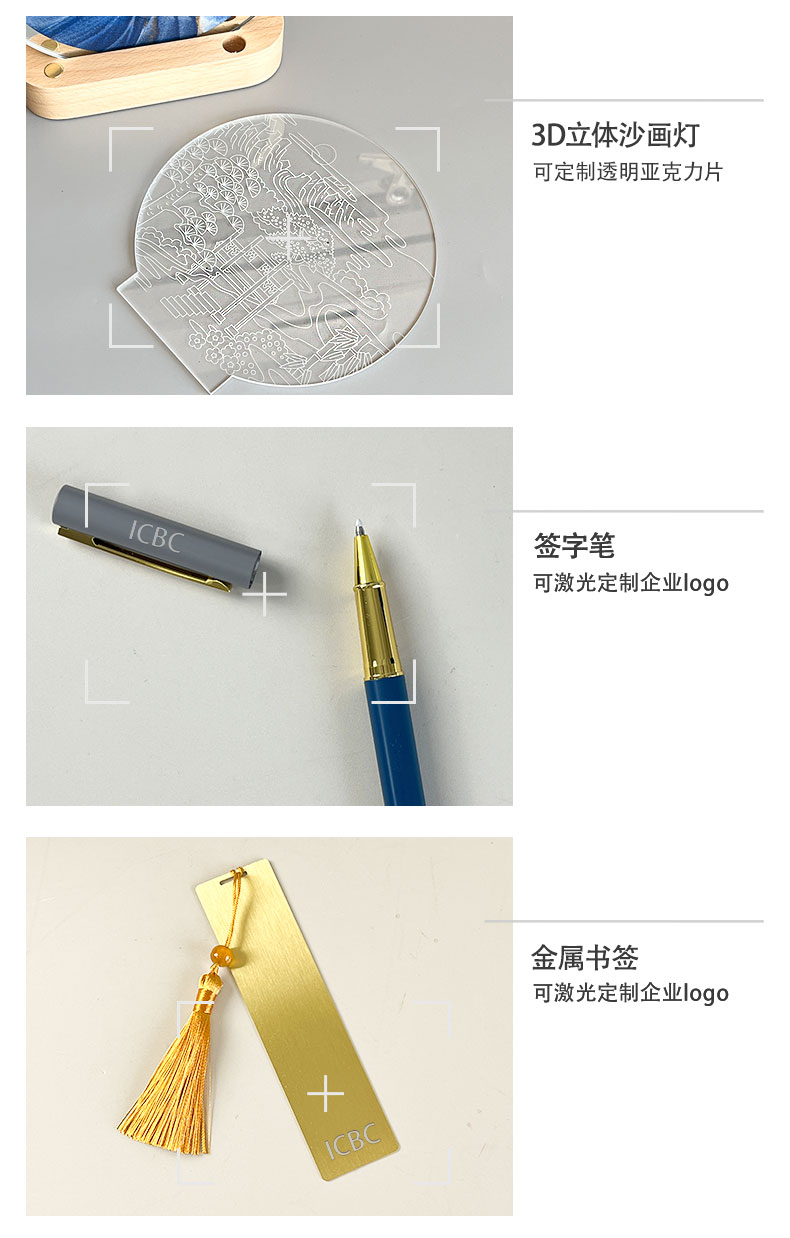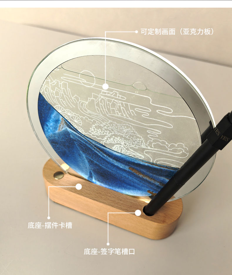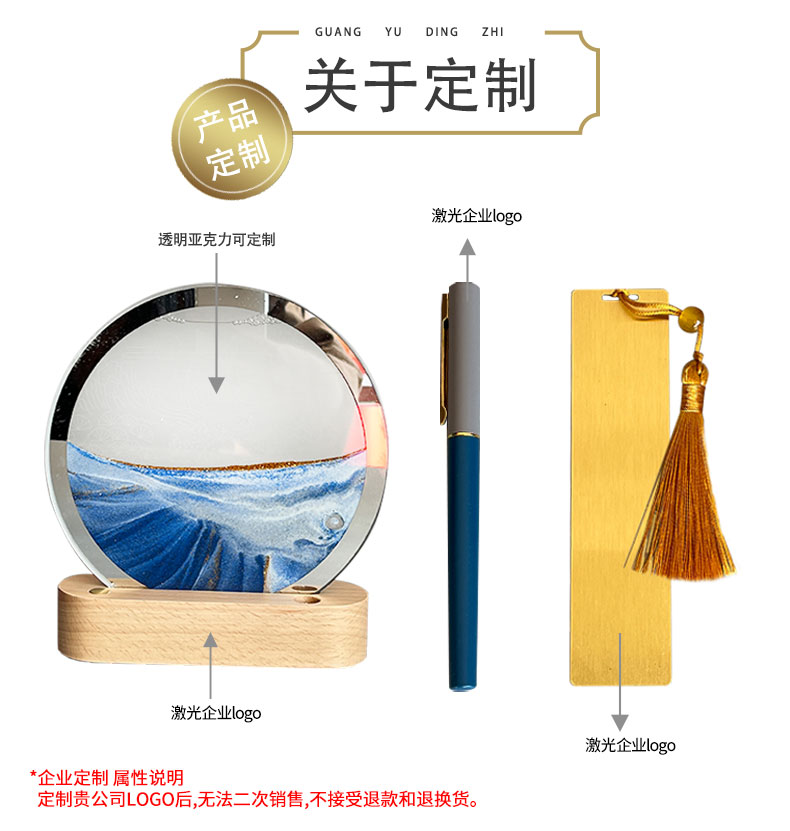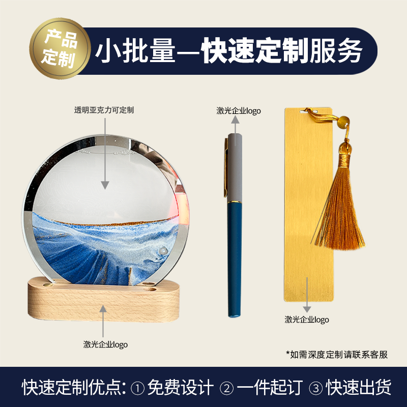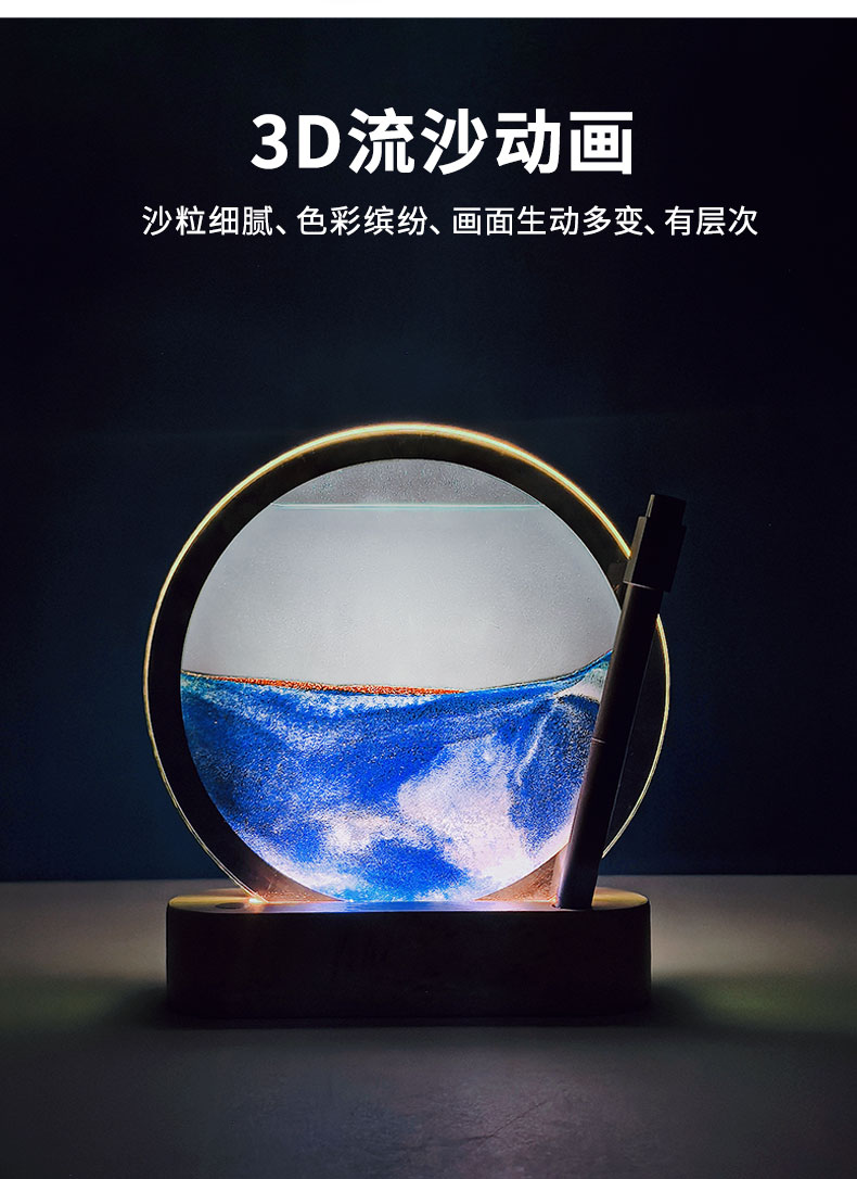 ❶ 3D立体沙画灯(含透明亚克力片) 光源:白色 沙画直径:16cm ❷ 观山杯 数量:2个 功能:茶杯、威士忌酒杯 材质:玻璃 尺寸:7*7cm ❸ 金属书签 材质:金属 尺寸:3*12cm ❹ 签字笔 0.05cm笔芯 尺寸:长14.8cm直径1.2cm ❺ 手提袋 材质:黑色特种纸 尺寸: 37*30*11cm