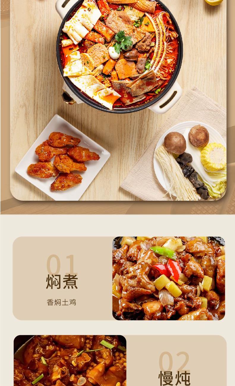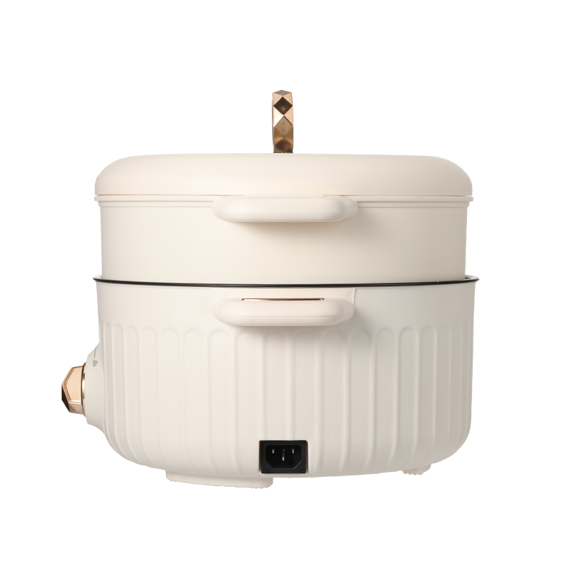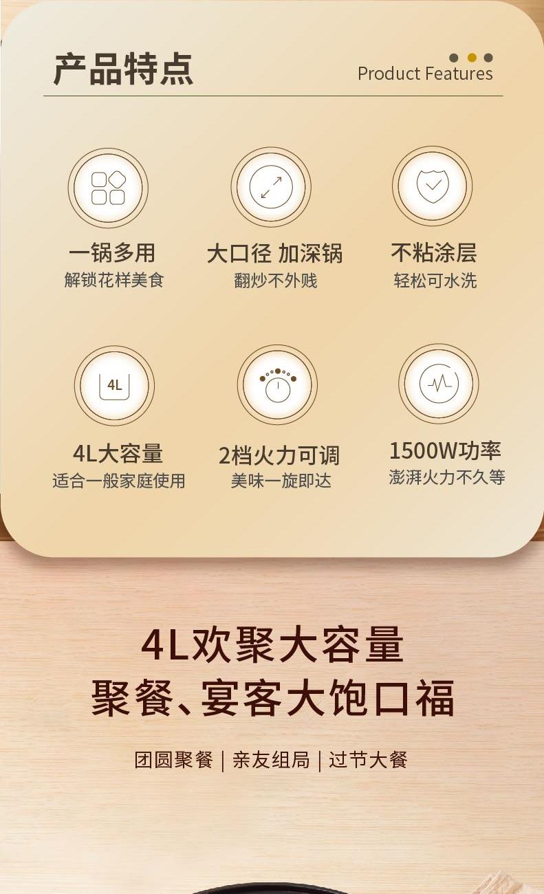 产品材质 :PP+不锈钢 产品参数 :功率:220V~50Hz 1500W 容量:4L 产品尺寸 :33×28.5×24.2cm 产品净重 :1.74Kg 含彩盒重量:2.23Kg 包装尺寸 :彩盒 :315*315*280 产品介绍: 1.造型时尚、精致美观 2.一锅多用,火锅、炖、煮、蒸、焖,美味尽情享 3.大容量、家人朋友聚餐都能满足 4.两档操作,简单烹饪 5.防干烧、防超温、双重安全保护装置,使用安全更省心