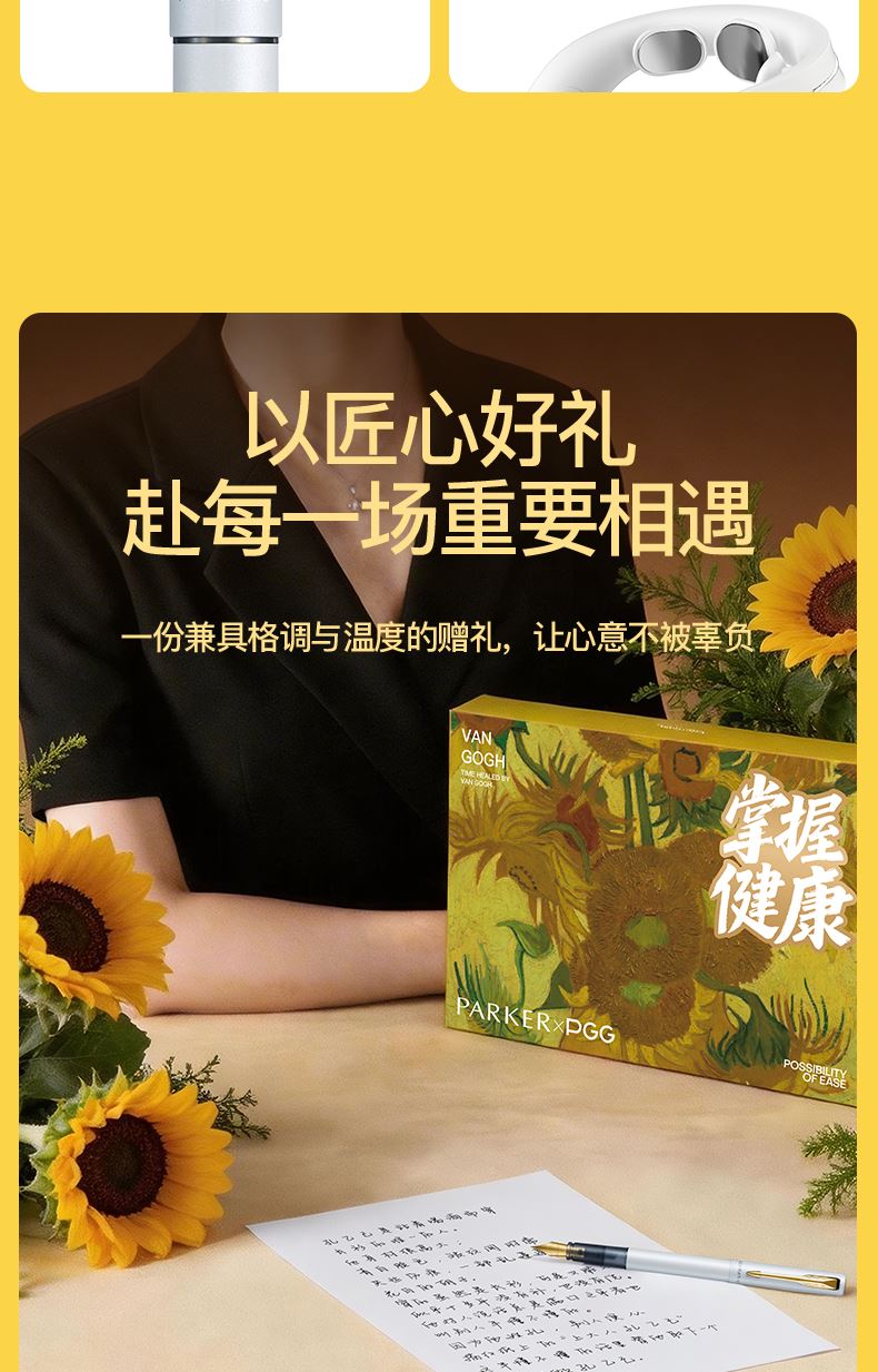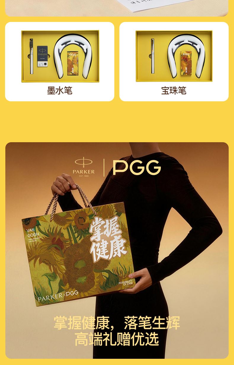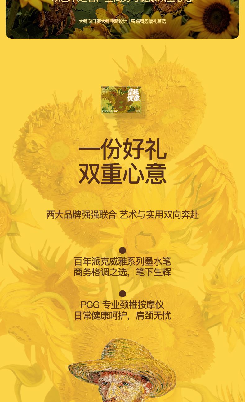商务赠礼,选的是体面,送的是心意。 派克 ×PGG 梵高联名礼盒,以百年底蕴,以暖心健康呵护,以大师艺术质感,让每一份祝福,都掷地有声,被长久铭记。 底部 slogan:掌握健康,落笔生辉,礼赠优选