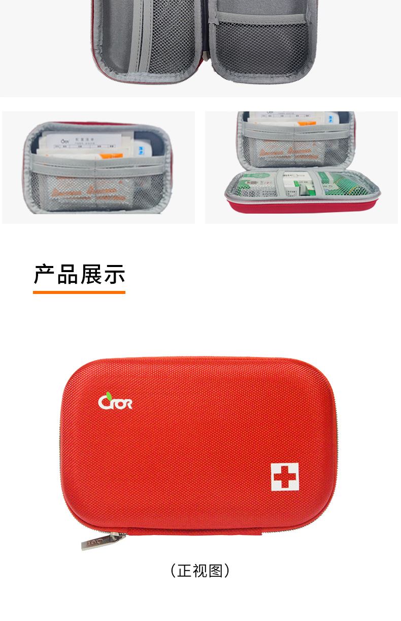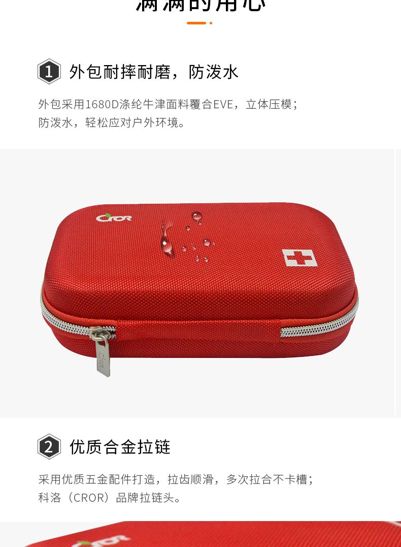 产品材质:1680D牛津布覆EVA 产品规格:200*120*55mm 产品颜色:红色 产品配置: 含4大类13种急救用品