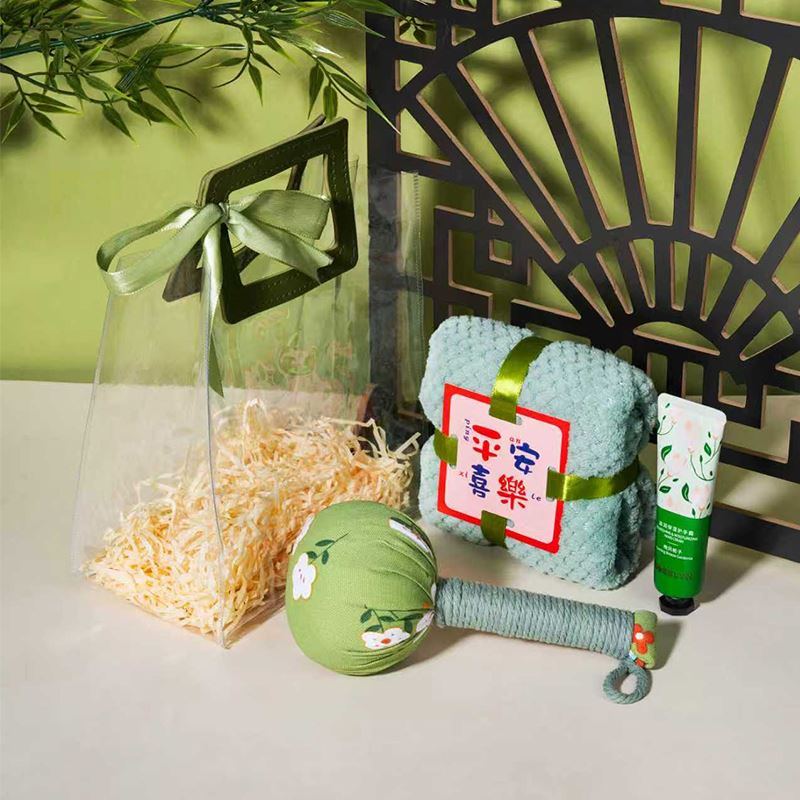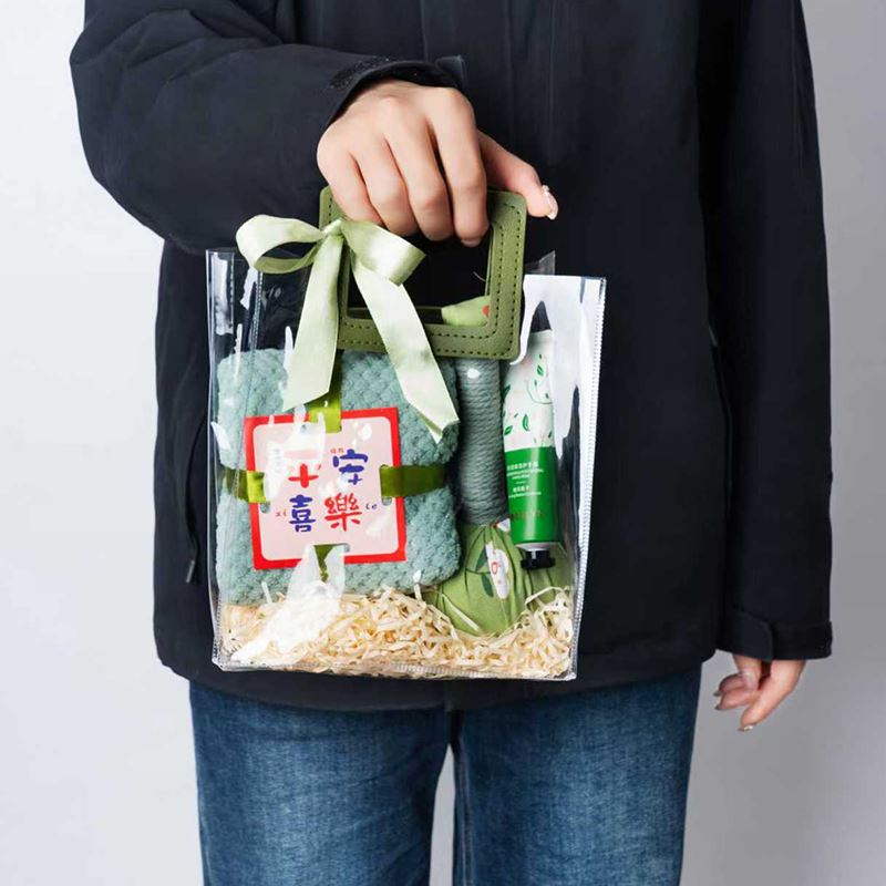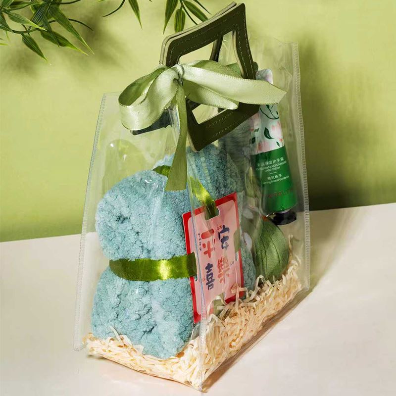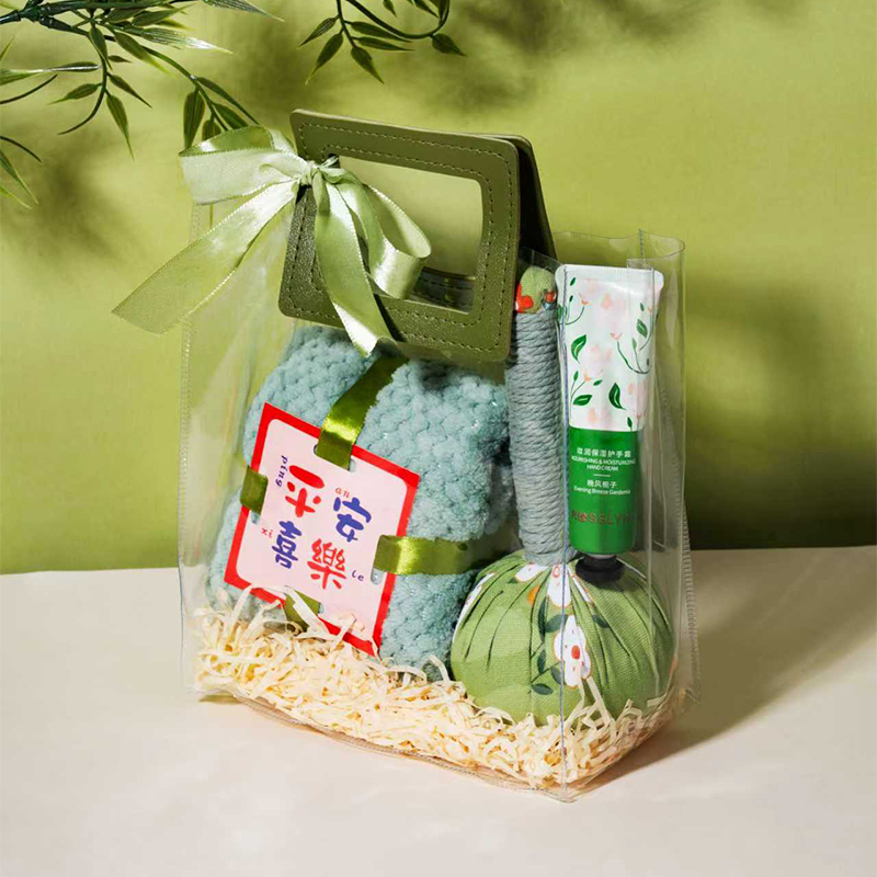 包包规格:180*200*100mm 产品配置:PVC透明手提袋小*1 平安喜乐菠萝纹毛巾*1 18cm老粗布艾草锤*1 同色护手霜*1(蓝绿双色可选) 推荐理由: 1、PVC加厚手拎袋,透明度高,一眼看到内部产品配置 2、老粗布养生锤,肩颈救星,敲舒服敲享瘦。 3、平安喜乐菠萝纹珊瑚绒毛巾,亲肤柔软,给您云朵般的爱。 4、烟雨茉莉/晚风栀子护手霜,优雅木质香,双手滋润不干燥。 5、同色系搭配套装,精致又实用,可根据客户需求选配爱你老几/端午安康主题贺卡,满满的仪式感和情绪价值。