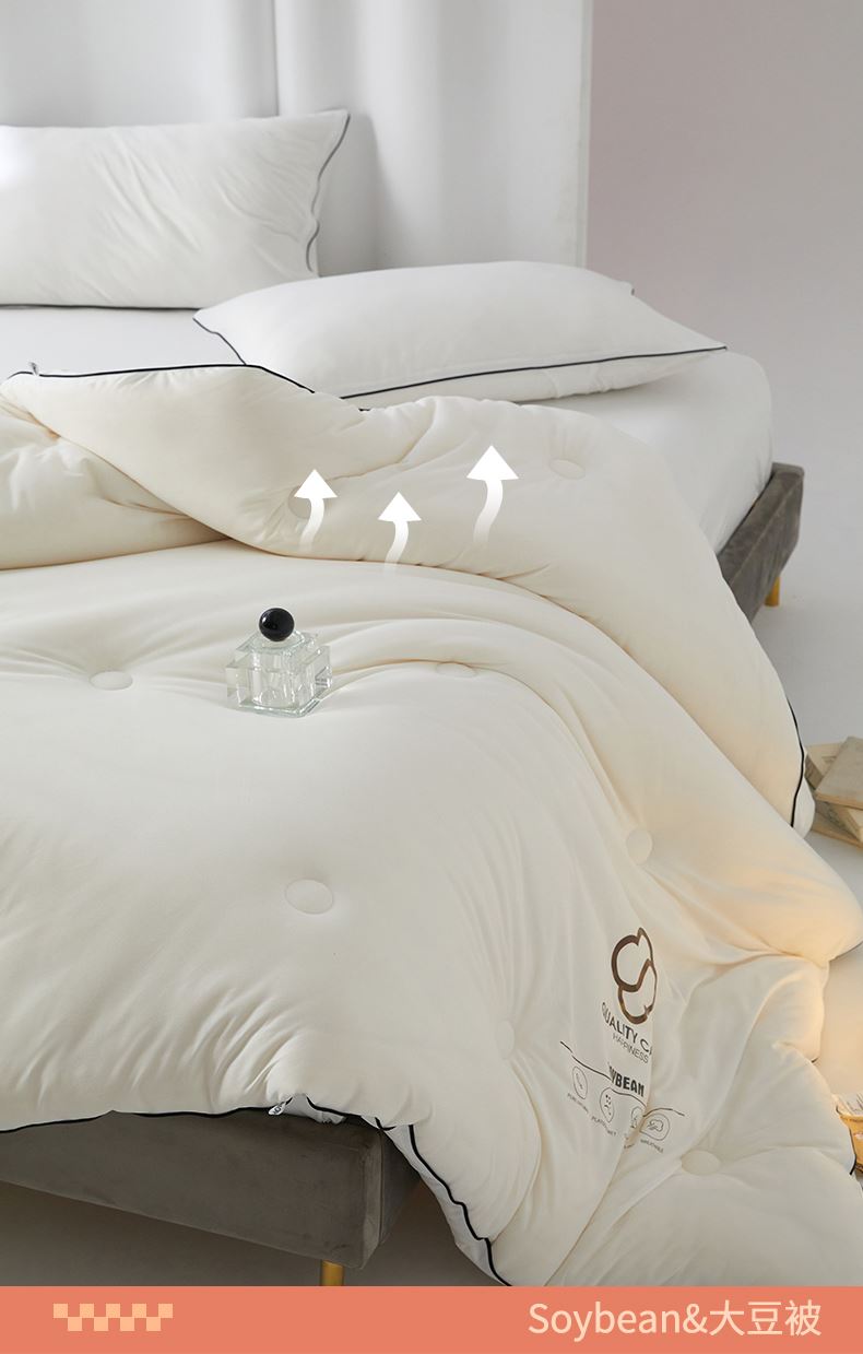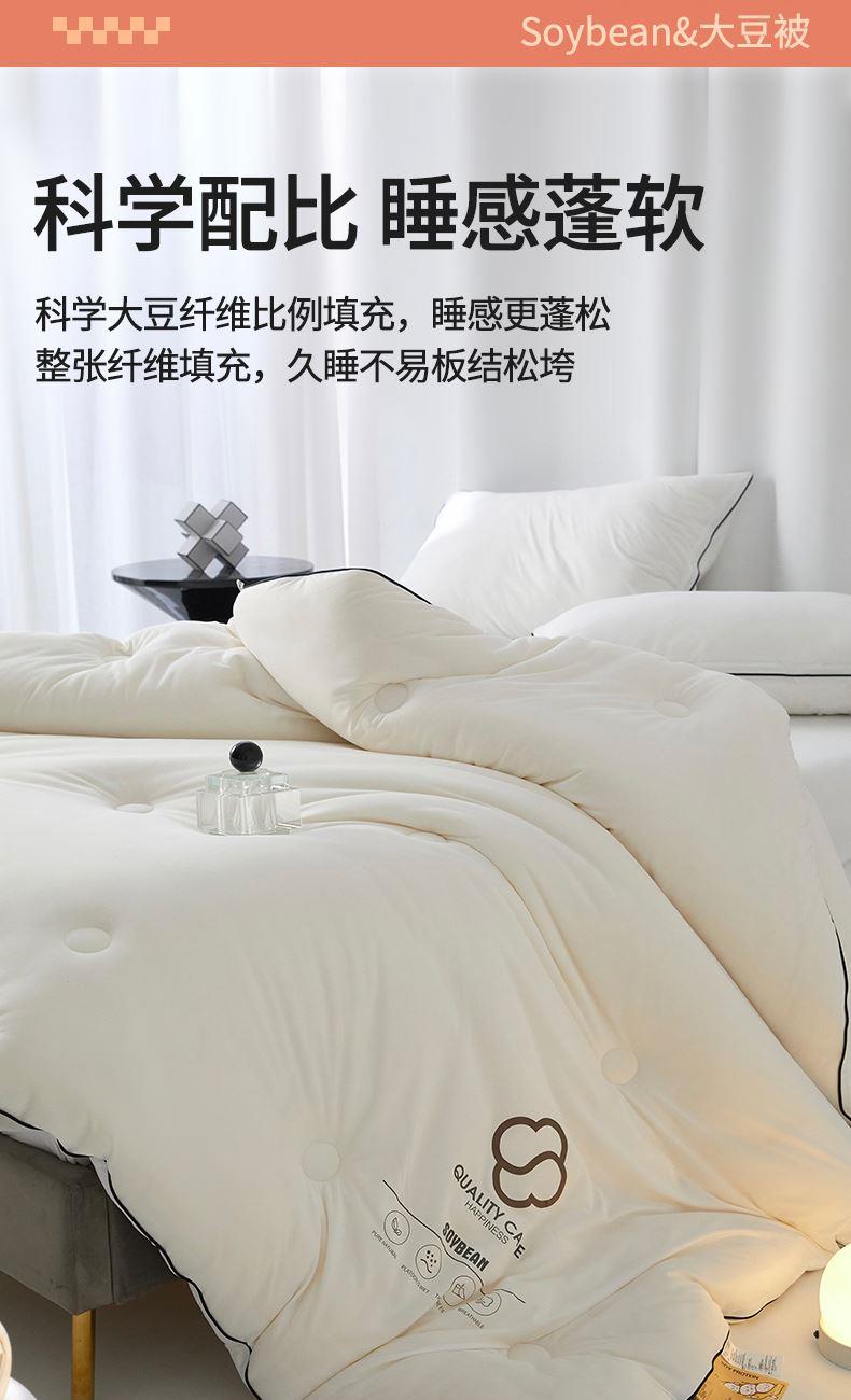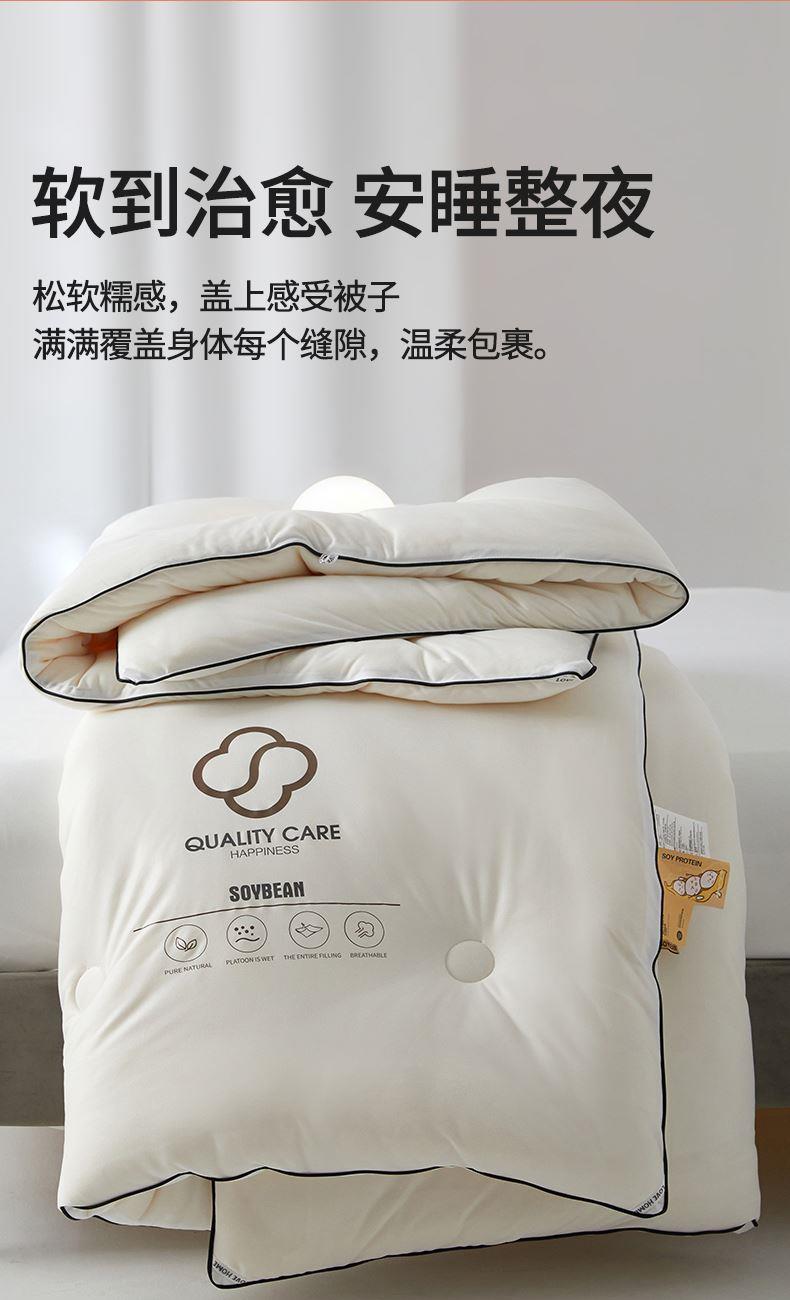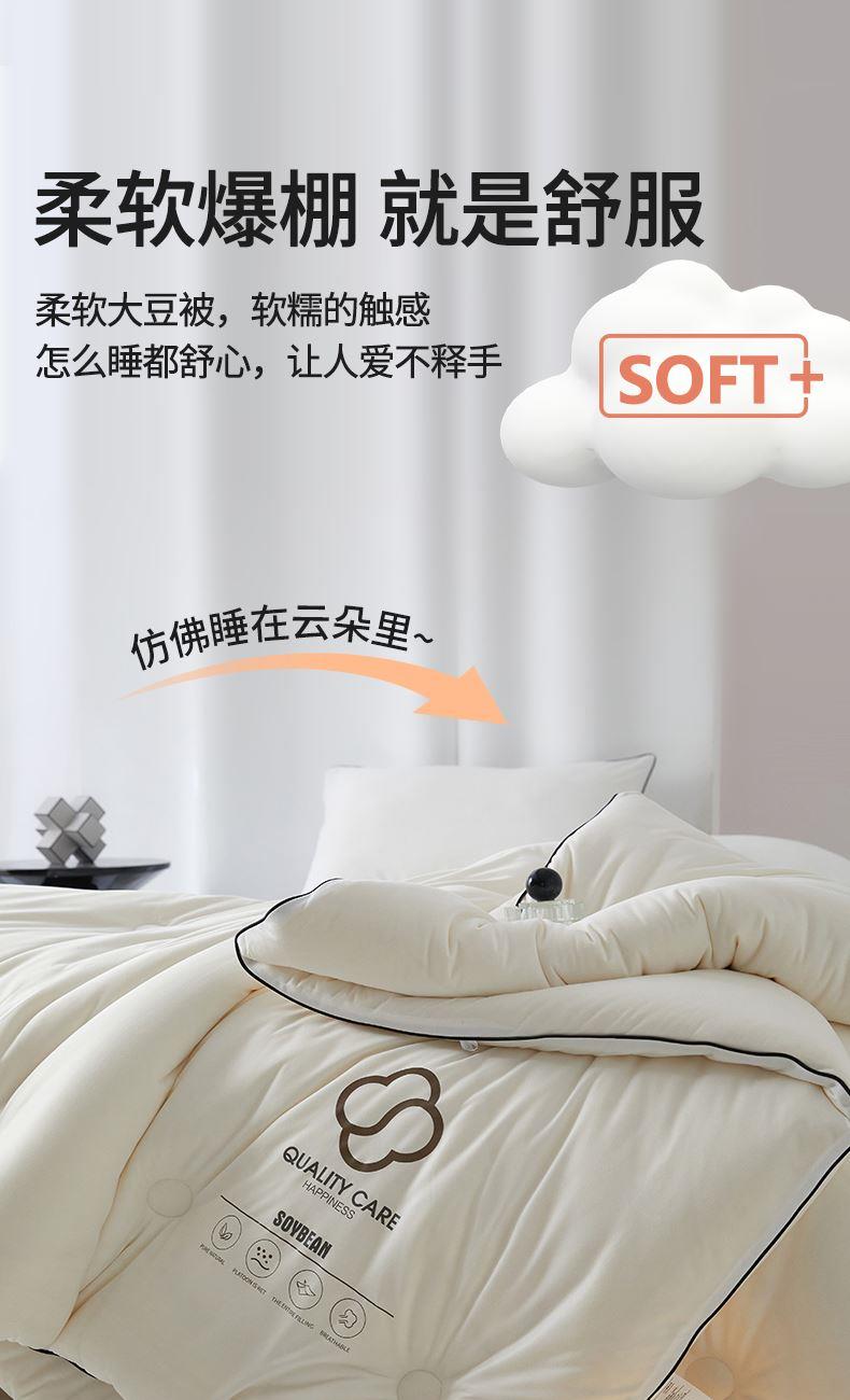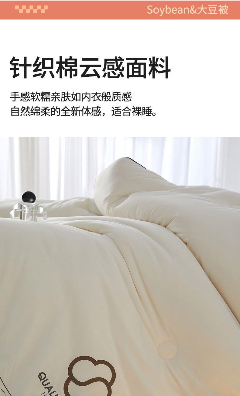面料:针织棉(聚酯纤维) 填充:10%大豆纤维 +90%聚酯纤维 规格:200cm*230cm 填充克重:2000g 总重量:3000g 包装:精美软包 针织面料柔软爆棚,就是舒服。 柔软大豆被,软糯的触感怎么睡都舒心,让人爱不释手,SOFT仿佛睡在云朵里。