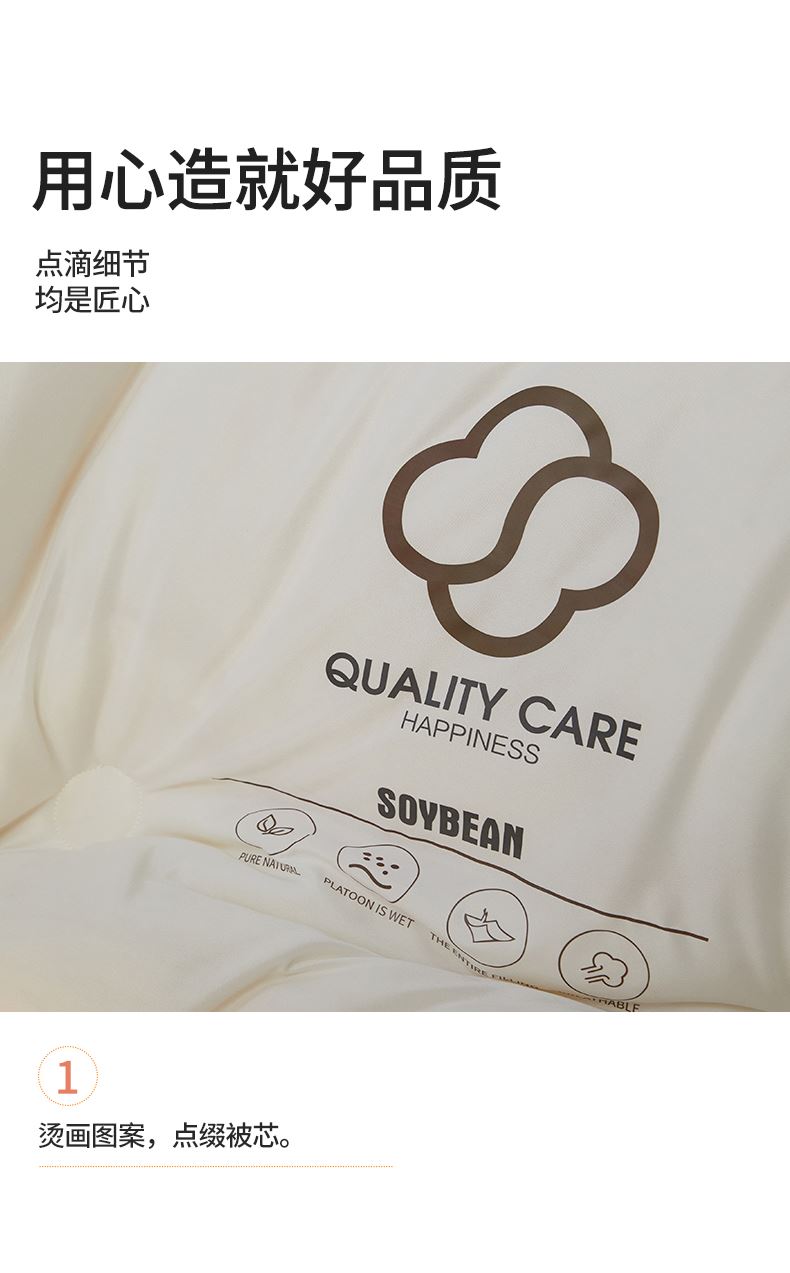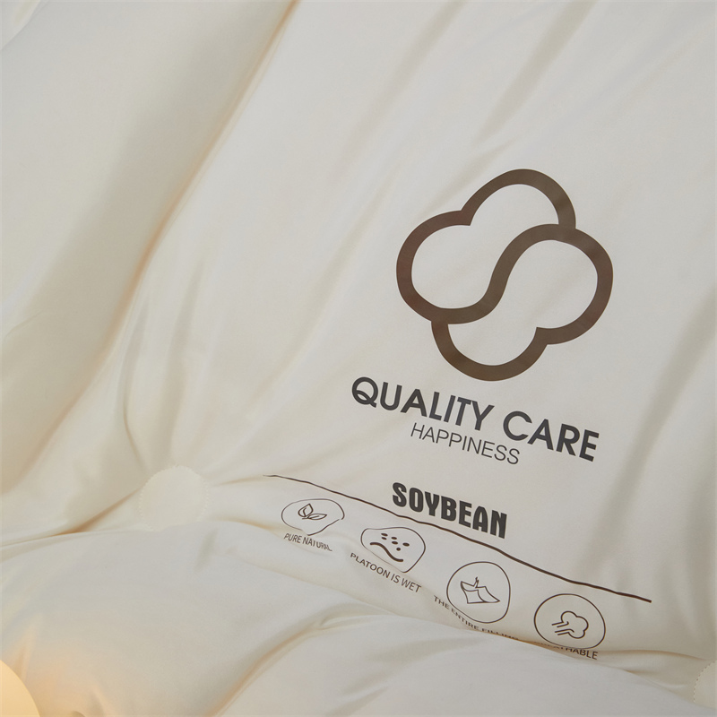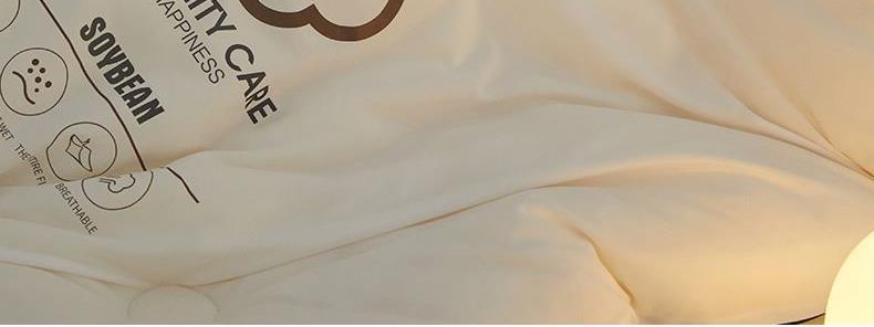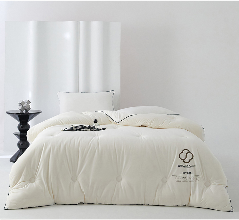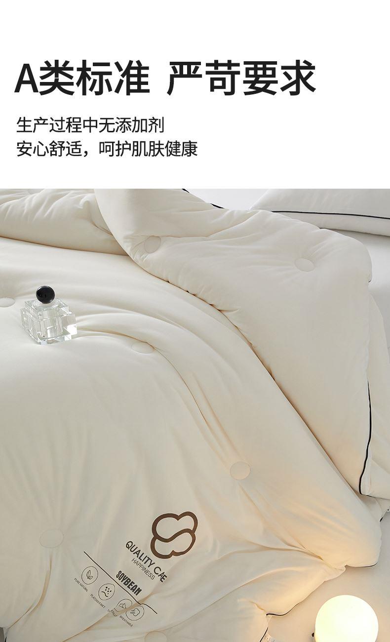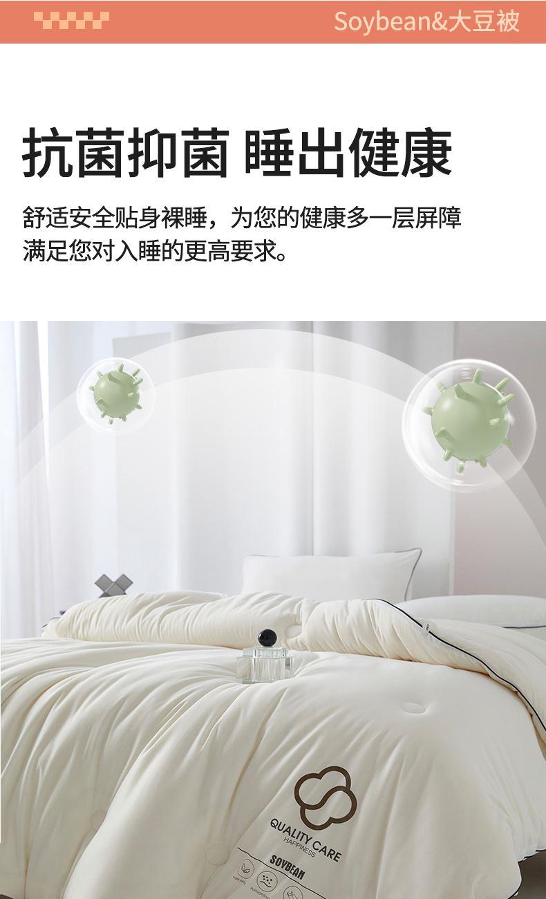 面料:针织棉(聚酯纤维) 填充:10%大豆纤维 +90%聚酯纤维 规格:200cm*230cm 填充克重:2000g 总重量:3000g 包装:精美软包 针织面料柔软爆棚,就是舒服。 柔软大豆被,软糯的触感怎么睡都舒心,让人爱不释手,SOFT仿佛睡在云朵里。