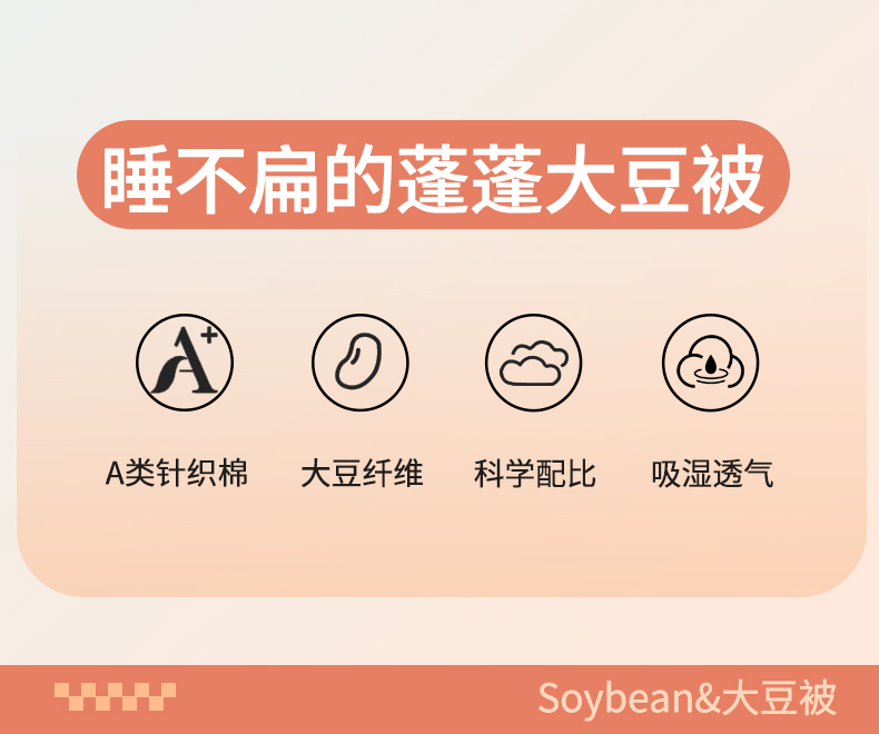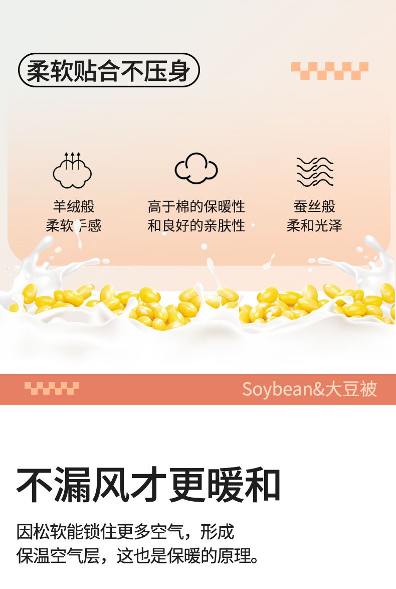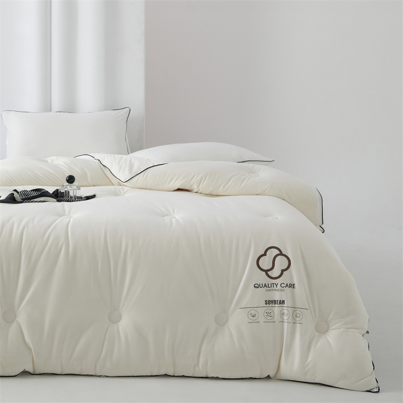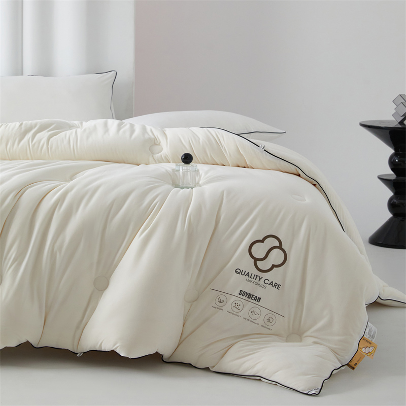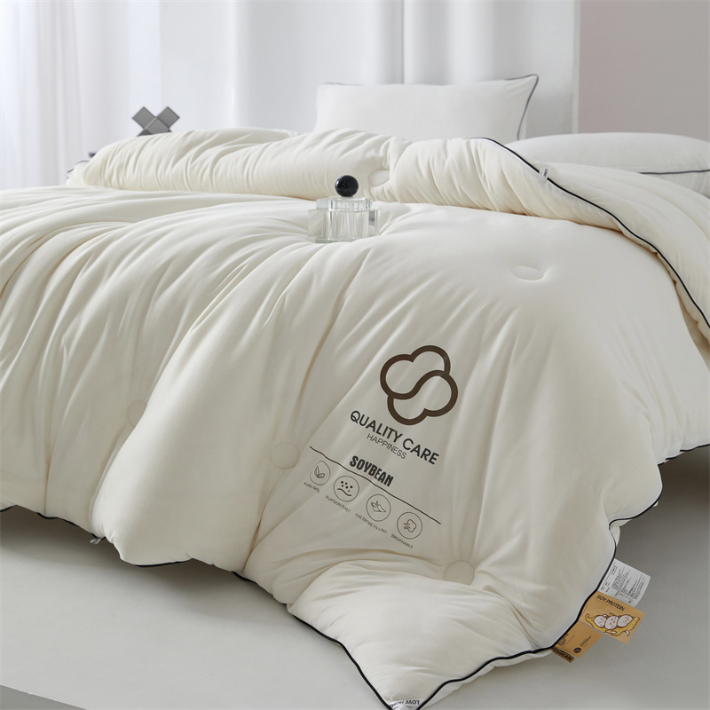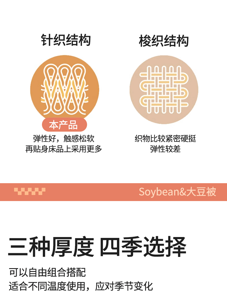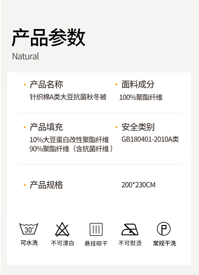 面料:针织棉(聚酯纤维) 填充:10%大豆纤维 +90%聚酯纤维 规格:200cm*230cm 填充克重:2000g 总重量:3000g 包装:精美软包 针织面料柔软爆棚,就是舒服。 柔软大豆被,软糯的触感怎么睡都舒心,让人爱不释手,SOFT仿佛睡在云朵里。