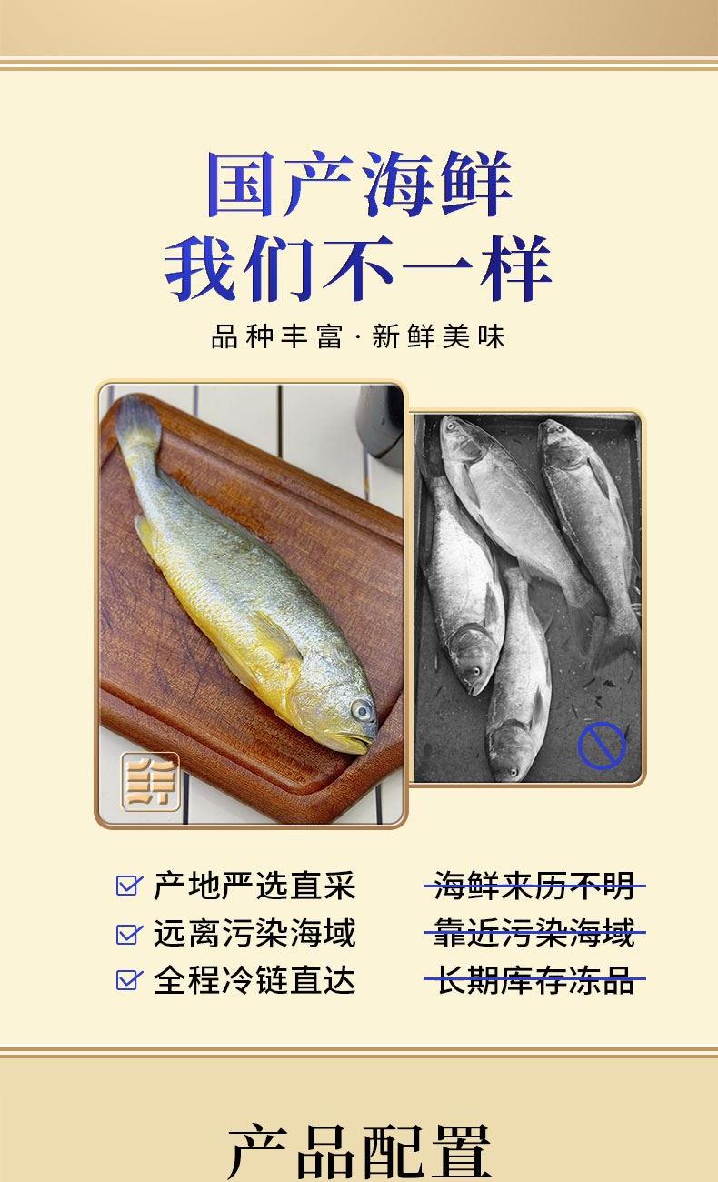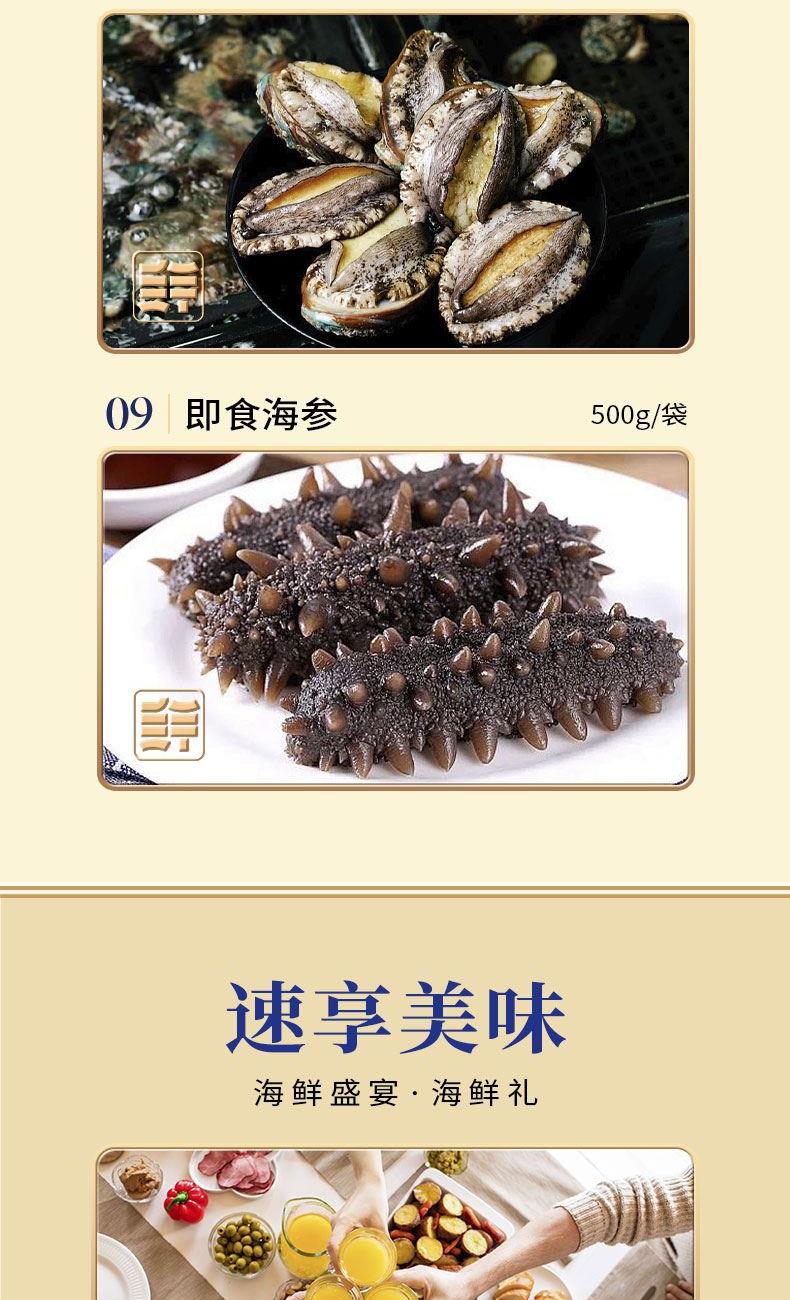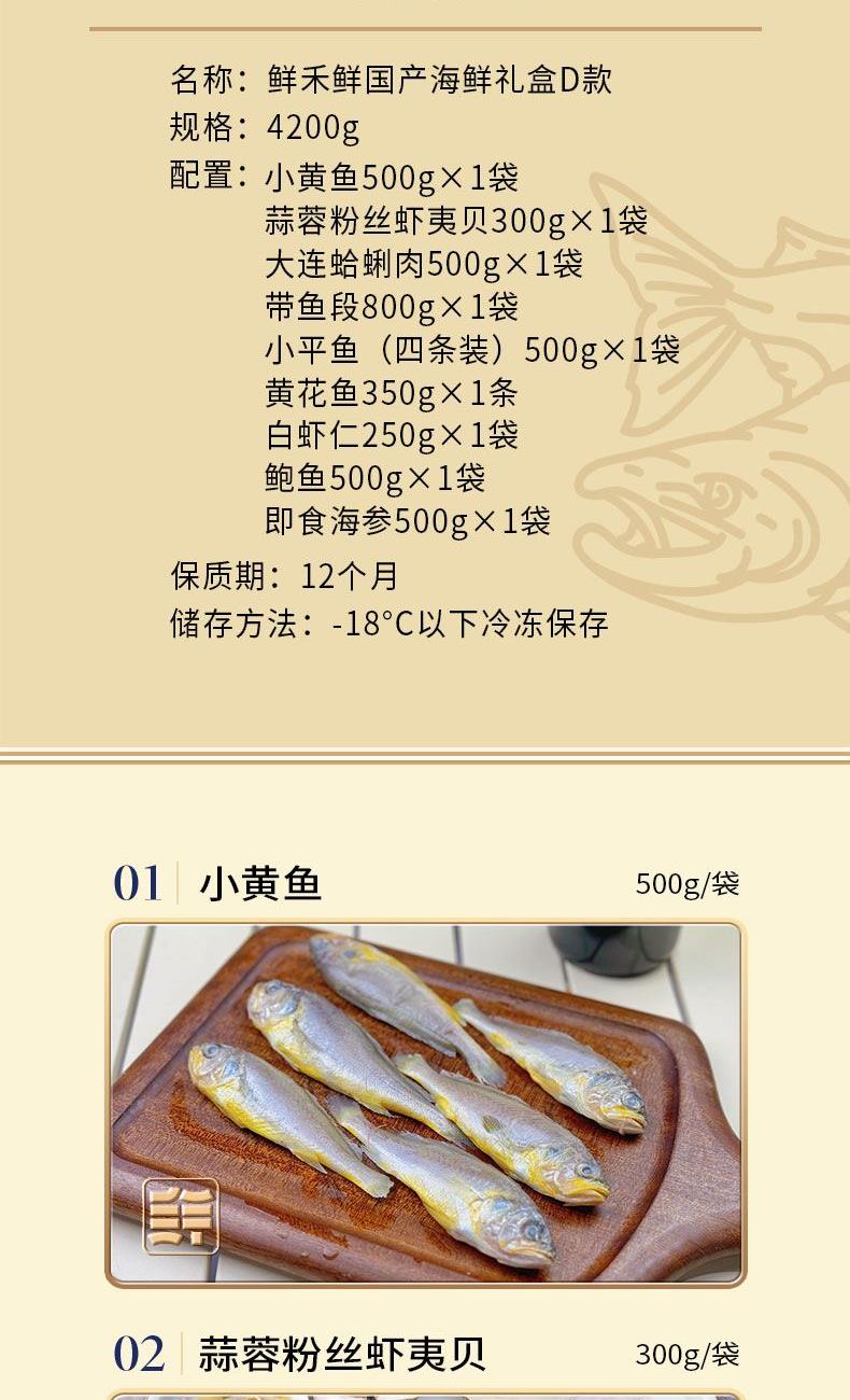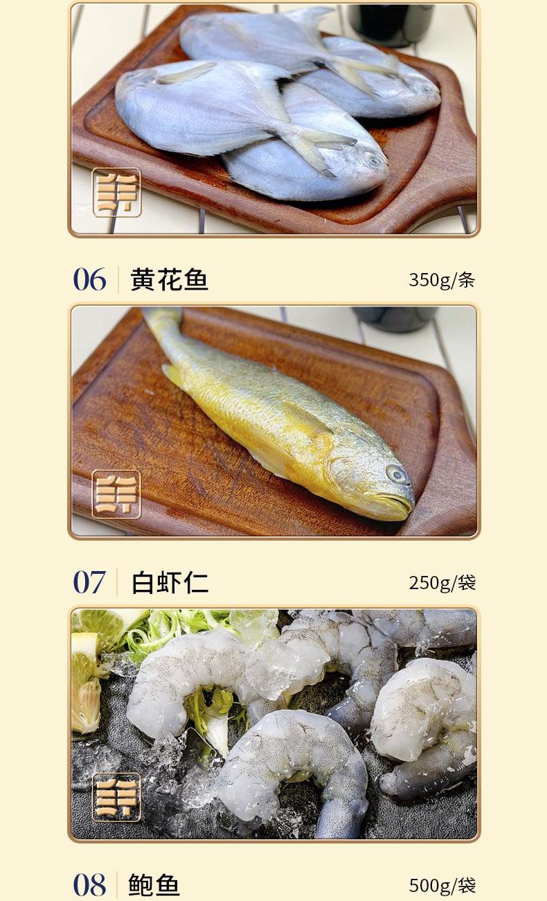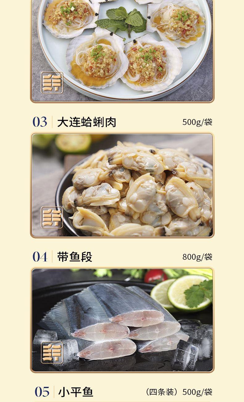 小黄鱼500g*1袋 蒜蓉粉丝虾夷贝300g×1袋 大连蛤蜊肉500g×1袋 带鱼段800g×1袋 小平鱼(四条装)500g*1袋 黄花鱼350g×1条 白虾仁250g×1袋 鲍鱼500g×1袋 即食海参500g×1袋
