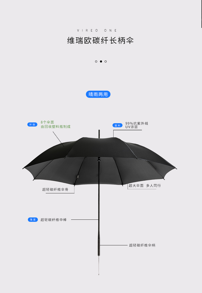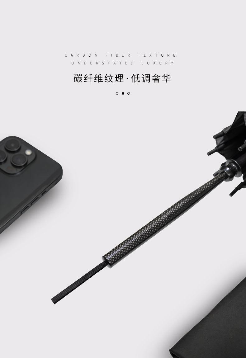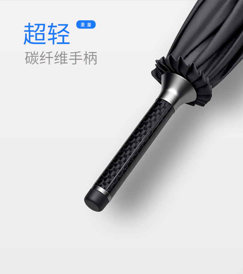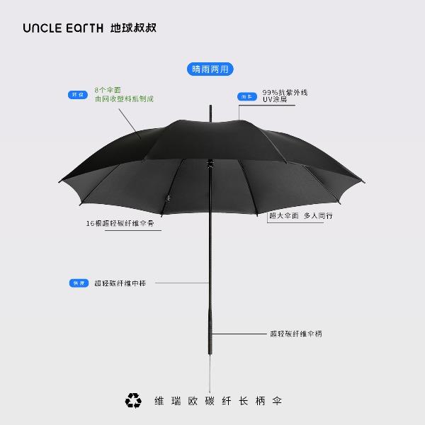 · 伞面由回收塑料瓶RPET,绿色可持续发展· 碳纤维骨架,伞柄,轻量化出行· 超大伞面 多人同行· 16根伞骨加固,是普通伞抗风性能的11倍,可抗10级大风· 低调奢华碳纤维纹理,搭配挂绳,方便携带 · 99%UV涂层,防晒防紫外线挡雨,晴雨两用