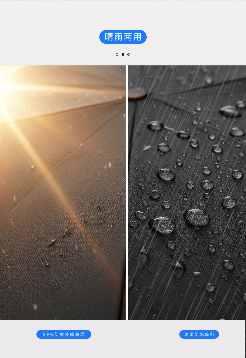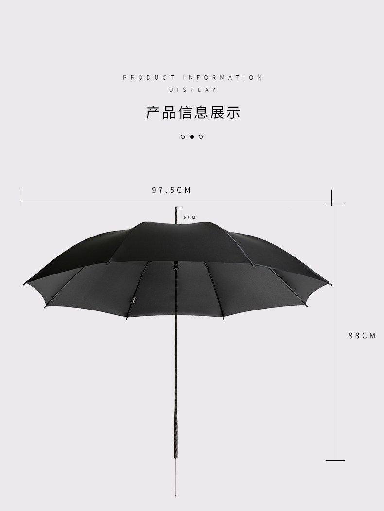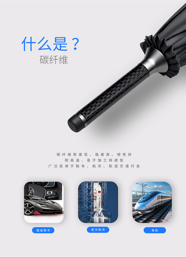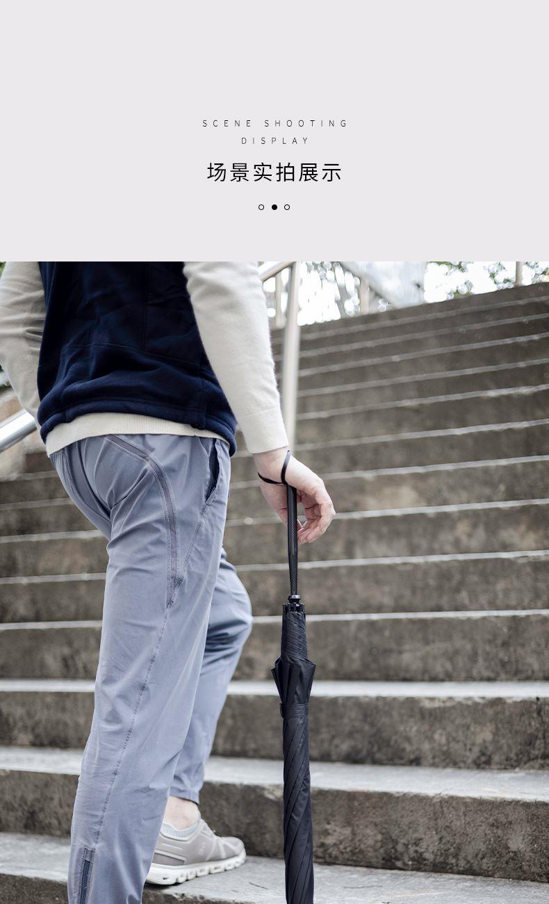 · 伞面由回收塑料瓶RPET,绿色可持续发展· 碳纤维骨架,伞柄,轻量化出行· 超大伞面 多人同行· 16根伞骨加固,是普通伞抗风性能的11倍,可抗10级大风· 低调奢华碳纤维纹理,搭配挂绳,方便携带 · 99%UV涂层,防晒防紫外线挡雨,晴雨两用