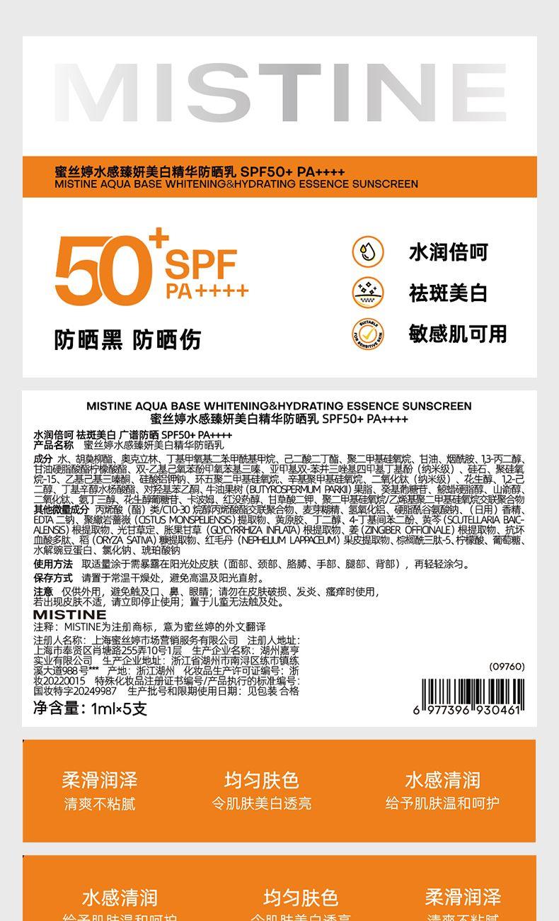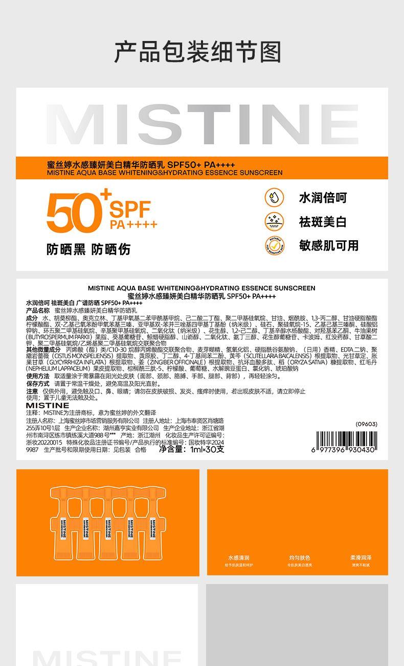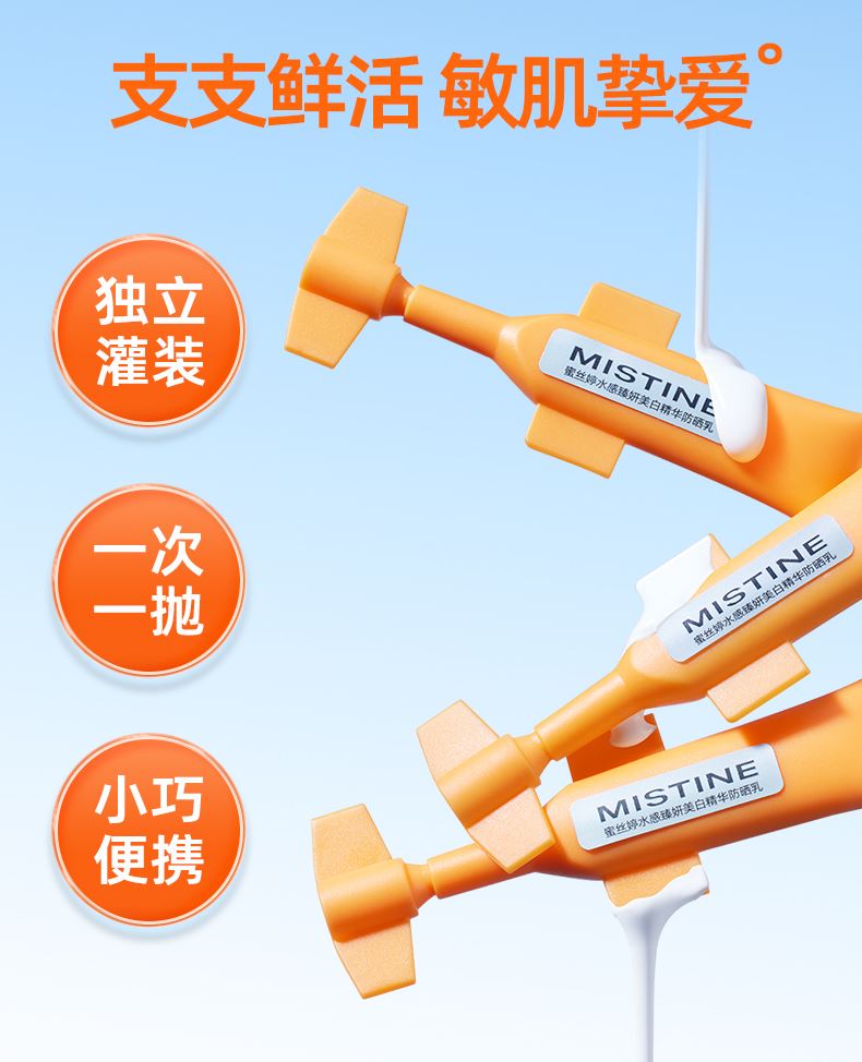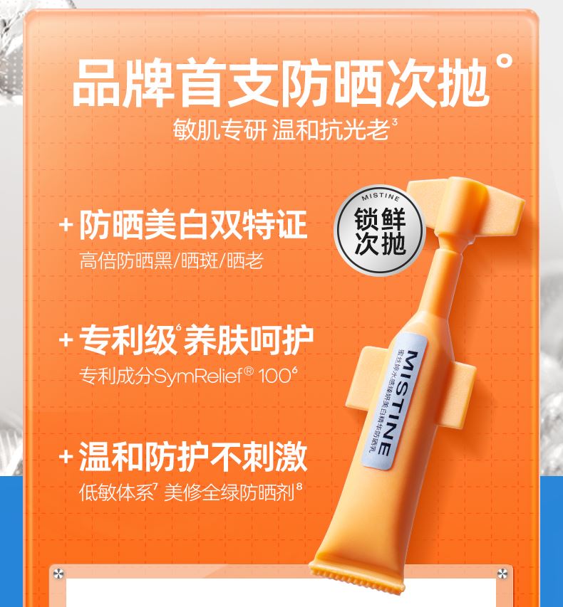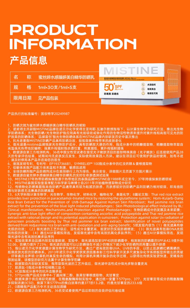 01 院线级防晒,硬核防晒修光损,有效防晒黑晒伤晒老 SPF50+ PA++++ ,诺奖得主专研,mistine光生物防护成分御光滤,复配八重防晒剂,增效防晒力,全面多维防护 黄金抗氧精粹“岩蔷薇抗氧素”,蕴含高能活性因子,阻止氧化炎症因子损伤细胞,抵御深层隐形光损伤,减少胶原蛋白流失,减少皮肤压力-43% 02 美白抗老双通路,持证美白祛斑,进阶去皱抗光老 高阶美白成分577pro复合焕颜成分,根源围剿黑色素,抑制75.5%黑色素生成 抗老黄金成分胶原肽-5,促生胶原,平滑肌肤,重塑年轻屏障,28天皮肤弹性+9.9% 鱼尾纹面积-22.96% 03 医美术后可用不反黑,精研低敏体系,敏感肌友好,36名受试者临床验证,认同无皮肤刺激性,认同高皮肤亲和力 项目后温和防护,加乘医美项目效果,97%的受试者认可医美术后不返黑 04 舒缓修护,直击干燥敏感,舒缓修屏障 修护成分,增效补水修护,独特修复因子迅速渗透,强韧肌底,缓解晒后泛红和光敏应激 14天泛红- 11.07%;角质层含水量提升+8.55% 05 1次1支,锁鲜,随身便携,安心呵护 即抛型独立包装,保留活性因子,支支鲜活 旅游随行,轻盈质地,干净更卫生