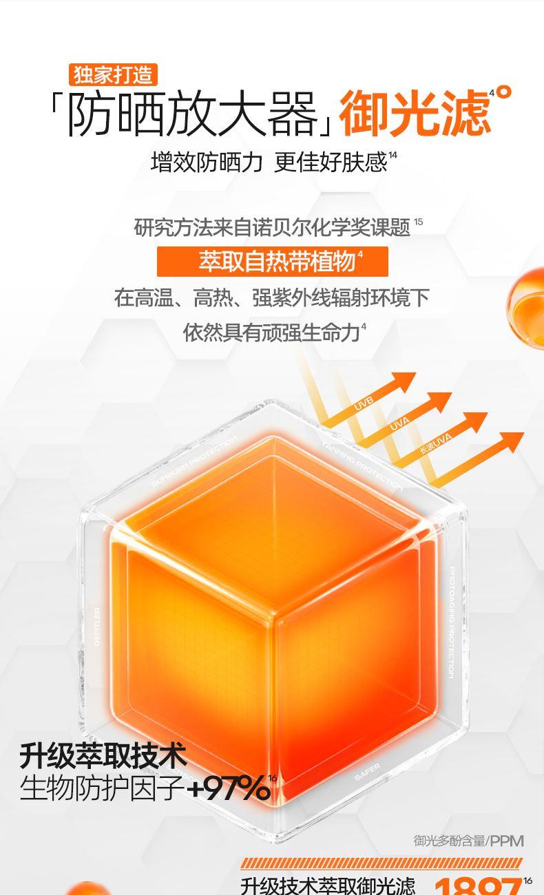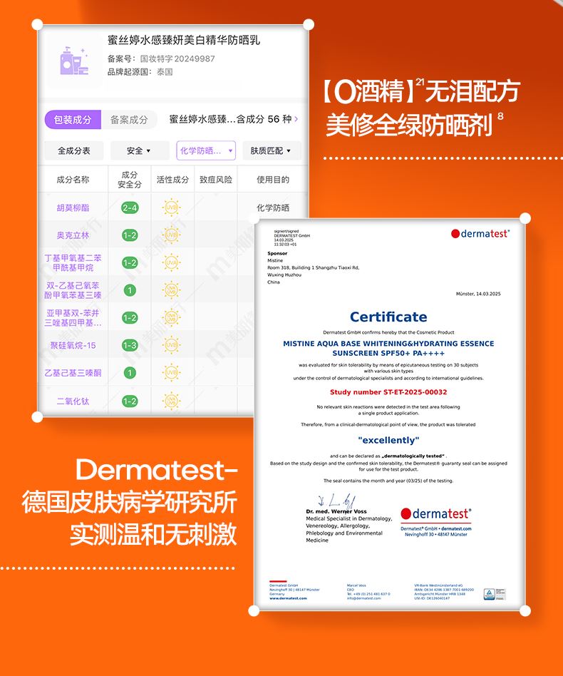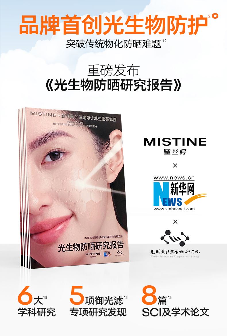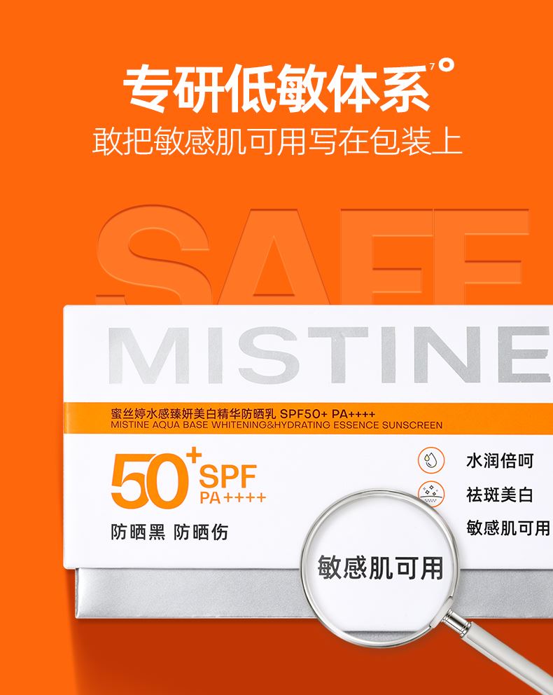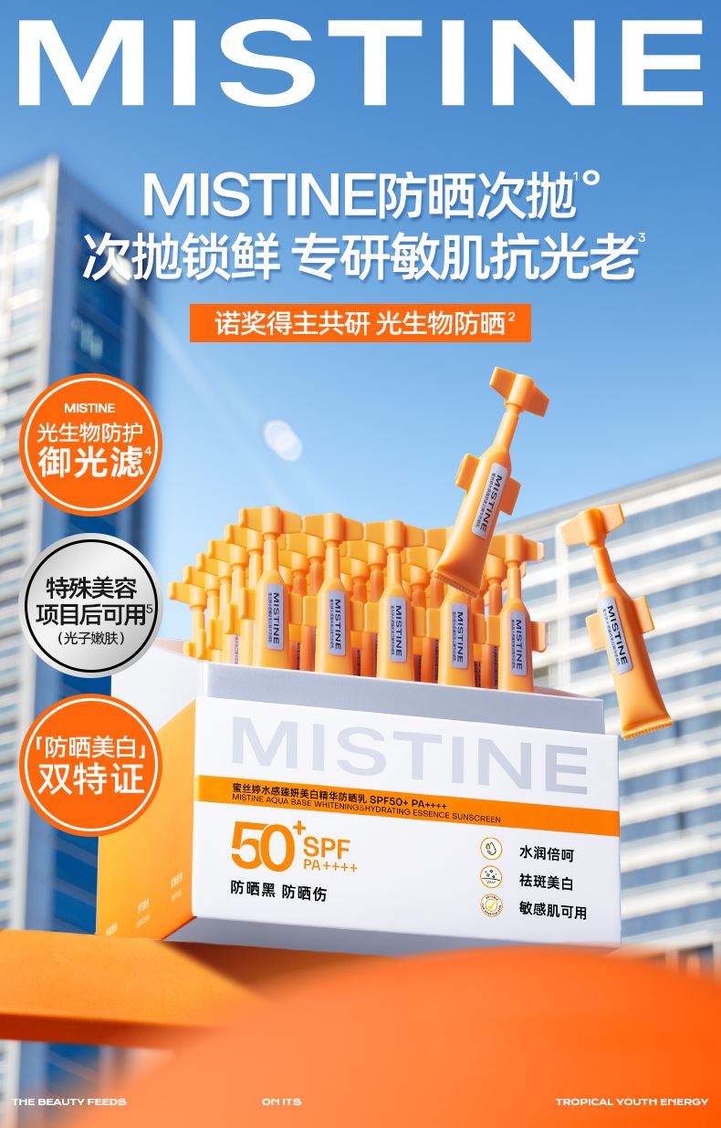 01 院线级防晒,硬核防晒修光损,有效防晒黑晒伤晒老 SPF50+ PA++++ ,诺奖得主专研,mistine光生物防护成分御光滤,复配八重防晒剂,增效防晒力,全面多维防护 黄金抗氧精粹“岩蔷薇抗氧素”,蕴含高能活性因子,阻止氧化炎症因子损伤细胞,抵御深层隐形光损伤,减少胶原蛋白流失,减少皮肤压力-43% 02 美白抗老双通路,持证美白祛斑,进阶去皱抗光老 高阶美白成分577pro复合焕颜成分,根源围剿黑色素,抑制75.5%黑色素生成 抗老黄金成分胶原肽-5,促生胶原,平滑肌肤,重塑年轻屏障,28天皮肤弹性+9.9% 鱼尾纹面积-22.96% 03 医美术后可用不反黑,精研低敏体系,敏感肌友好,36名受试者临床验证,认同无皮肤刺激性,认同高皮肤亲和力 项目后温和防护,加乘医美项目效果,97%的受试者认可医美术后不返黑 04 舒缓修护,直击干燥敏感,舒缓修屏障 修护成分,增效补水修护,独特修复因子迅速渗透,强韧肌底,缓解晒后泛红和光敏应激 14天泛红- 11.07%;角质层含水量提升+8.55% 05 1次1支,锁鲜,随身便携,安心呵护 即抛型独立包装,保留活性因子,支支鲜活 旅游随行,轻盈质地,干净更卫生