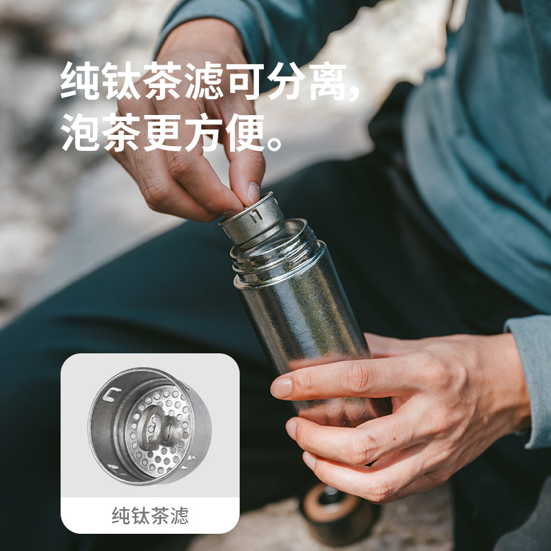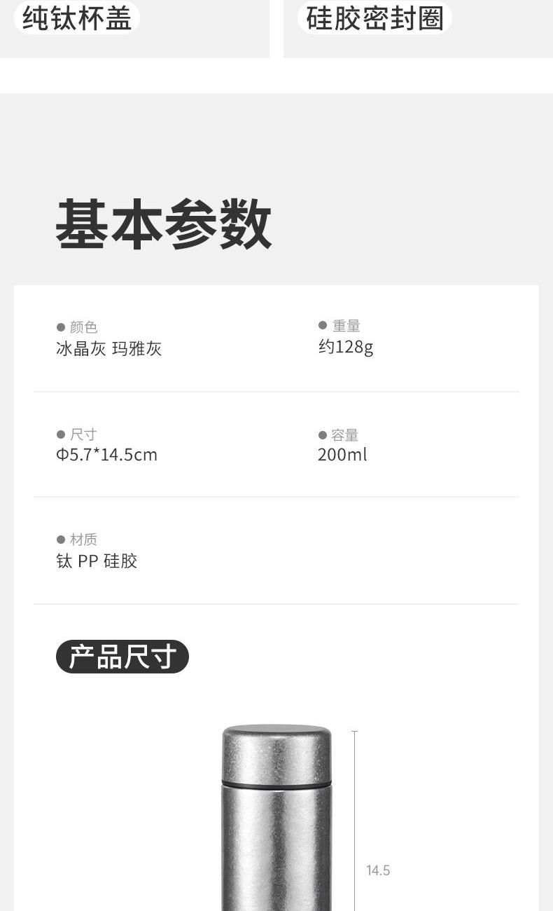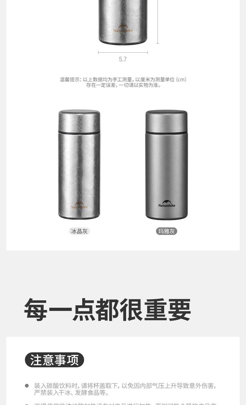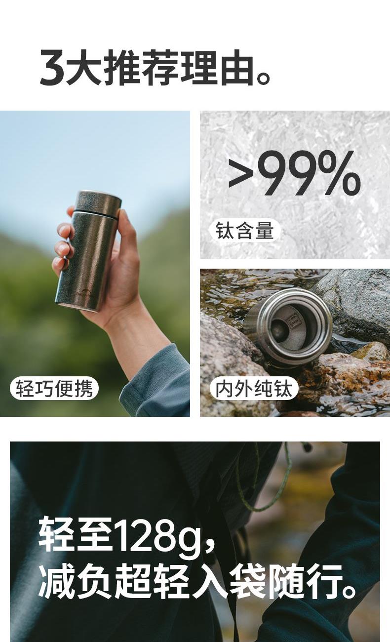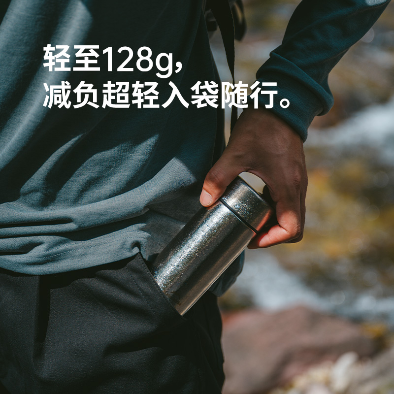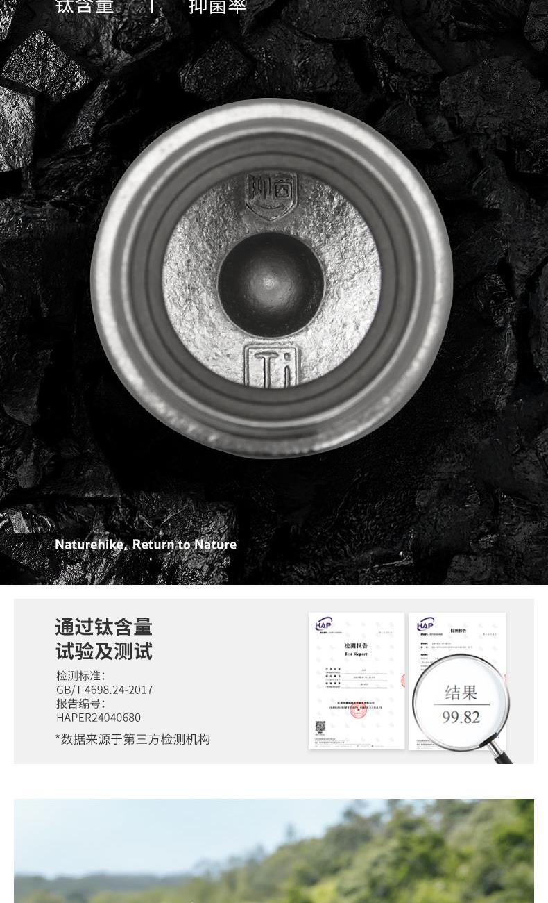 Naturehike CNK2550CF017 随行钛口袋杯 尺寸:φ5.7*14.5cm重量:约128g 颜色:冰晶灰 、玛雅灰材质:钛、PP、硅胶 容量:600ML 防水、防尘等级:IP66级 产品特点: 轻至128g,减负超轻入袋随行 内外纯钛锻造,持久不变味 冷热酸碱都能装,各种饮品随心饮 纯钛茶滤可分离,泡茶更方便 一杯可两用,保温保冷6小时