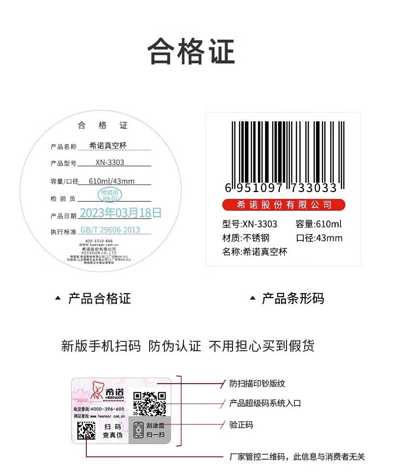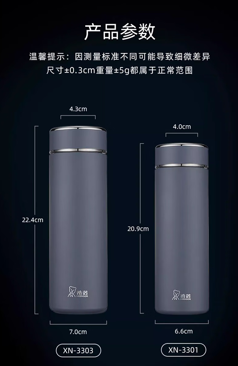 杯体 304不锈钢 杯盖 进口食品级PP、304不锈钢 密封圈 进口食品级硅胶 重量 XN-3301:0.33 kg 莲花滤网,密封硅胶圈,保护杯子内壁,延长寿命 电解抛光技术,保温层不锈钢镀铜有效形成锁热网 加固底座,防震抗撞击