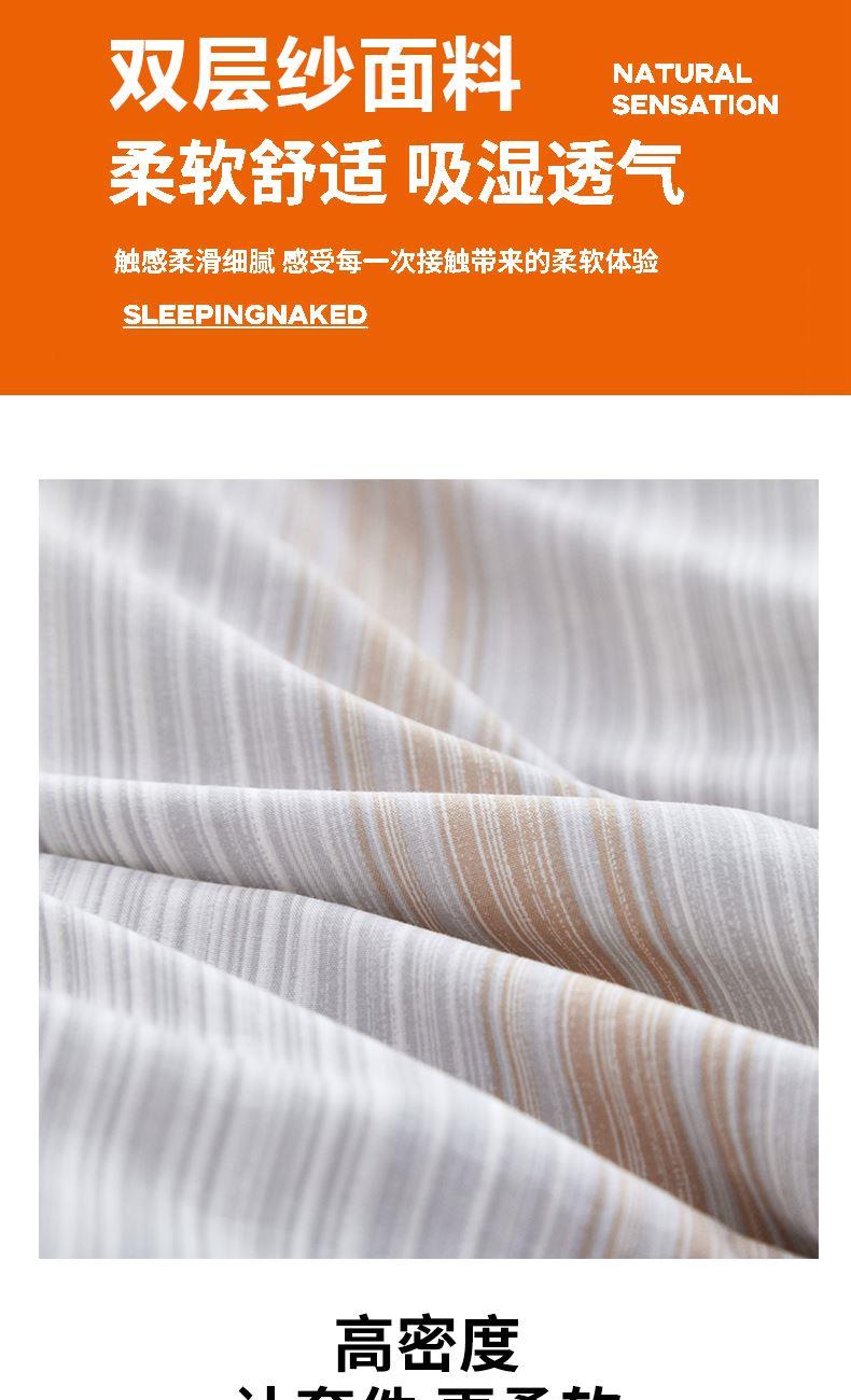 被套:200*230cm 床单:230*245cm 枕套:48*74cm*2 面料:双层纱 执行标准:GB/T22796-2021 安全类别:GB18401-2010 B类 1.精选双层纱面料,使面料具有水洗以后的柔软特性,手感像云朵,蓬松不硬。洗后更软(纤维空隙打开),越用越舒服。 2.透气排汗,不闷不粘,两层间有空气层,透气比普通棉高30%+。 3.湿气、热气快速散出,不易起痱子、湿疹。