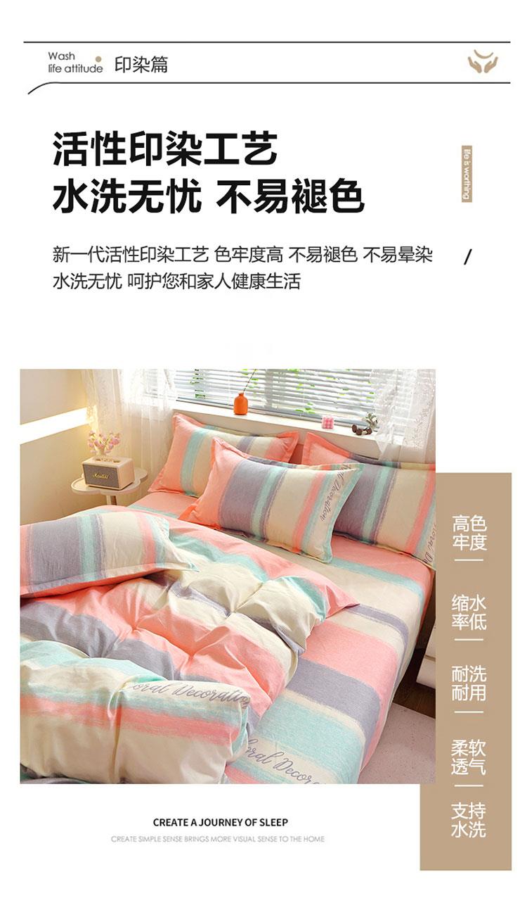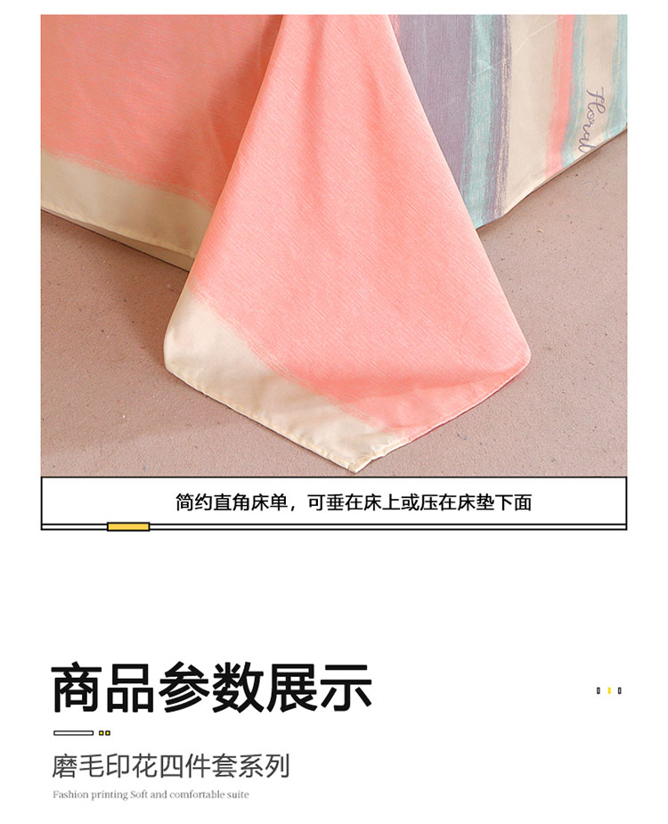面料:活性磨毛 工艺:活性印染 规格:被套 200*230cm 床单 230*230cm 枕套 48*74cm*2 采用全工艺印染技术,牢度优异,颜色鲜艳,不易褪色,植物棉手感柔 软细腻,透气性较好,质地轻盈舒适,精致工艺,细密针脚,防止脱线掉线,美观更实用,深受广大消费者欢迎
