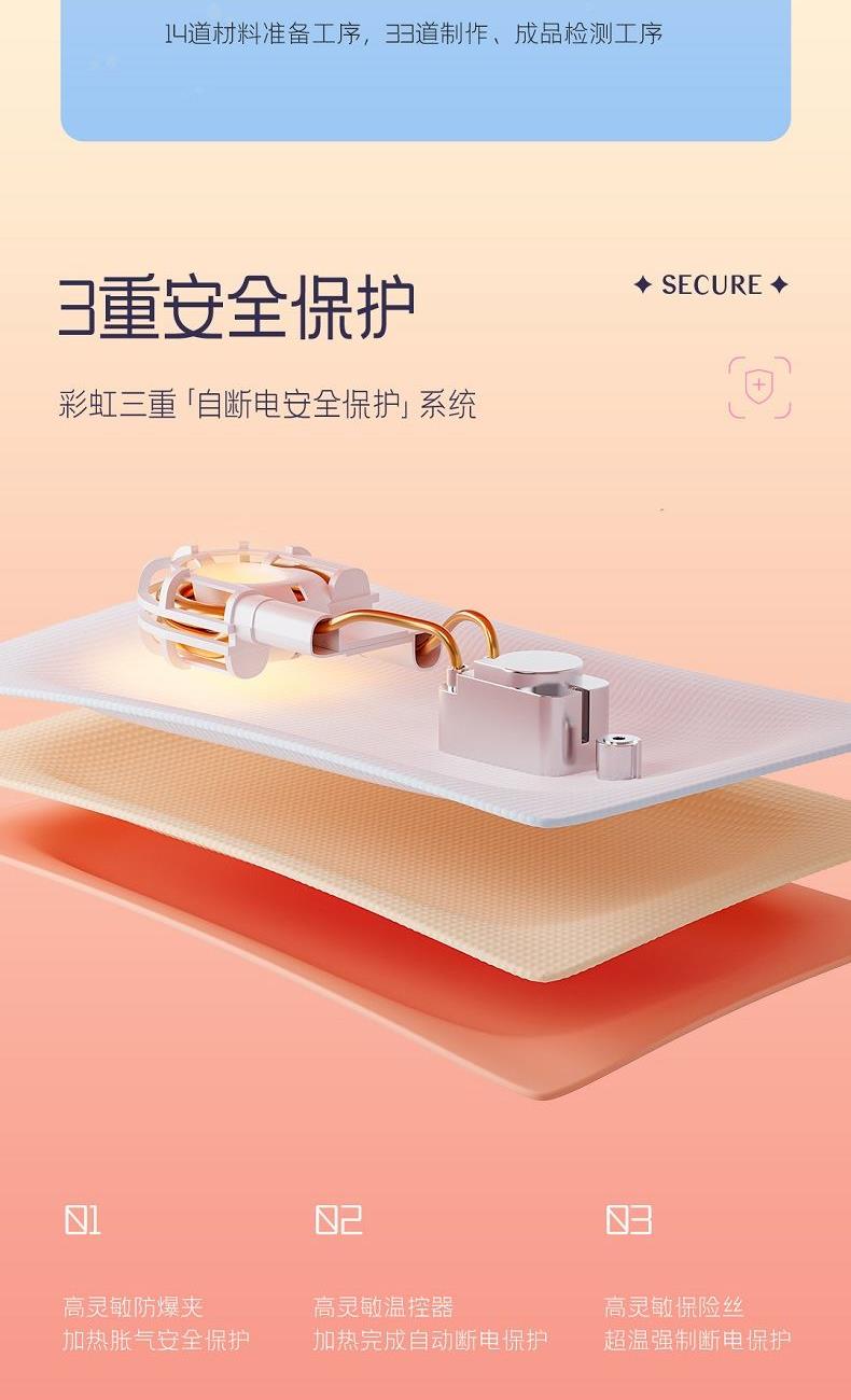 卖点 型号:DR40-1 B 功率:430W 功能:免洗、防爆、防触电、防漏液、水电隔离,自动控温限温 面料:优质亲肤绒 包装:彩盒 参数 1、优质亲肤绒, 2、七重安全保护 3、防爆、防触电、防漏液 4、水电隔离,自动控温限温! 5、礼品属性,包装精美