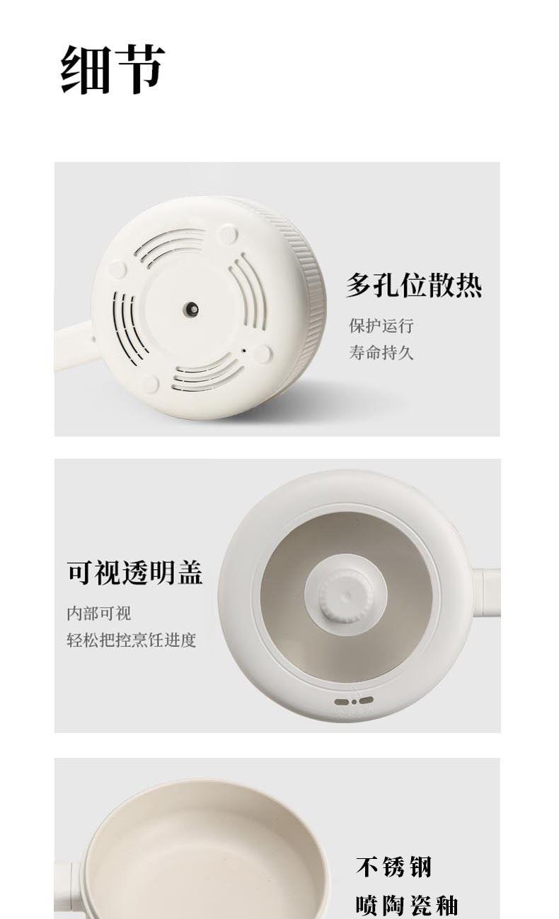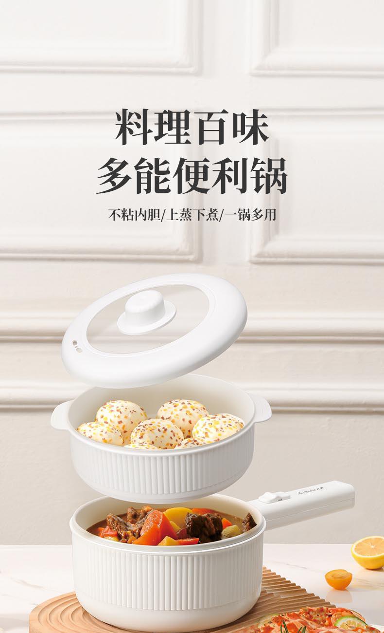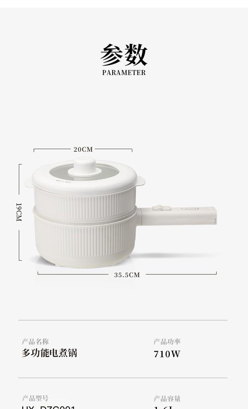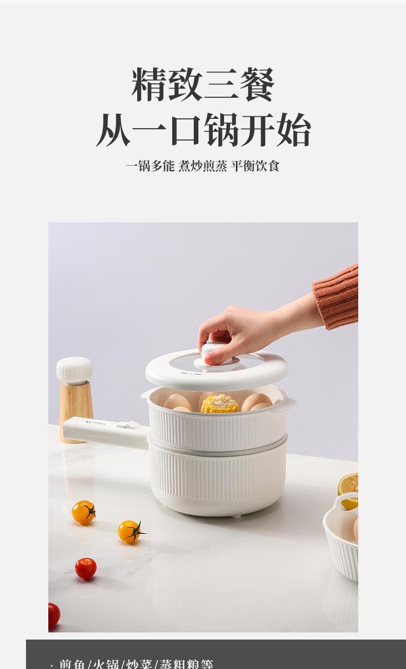 额定功率:710W 额定电压:220V 额定频率:50Hz 额定容量:1.6L 产品规格:355*230*190mm 产品颜色:白色 净重/毛重:0.95Kg/1.2kg 产品材质:不锈钢喷陶瓷釉/PP 彩盒尺寸:225*138*423mm 外箱尺寸:852*472*443mm 多功能设计,蒸煮煎炸、火锅、炒菜样样精通。 内胆采用白色不粘涂层,防粘锅。 配置食品级PP蒸笼,可蒸包子、鸡蛋等食物。 1.6L精致容量,刚好适合精致的你。