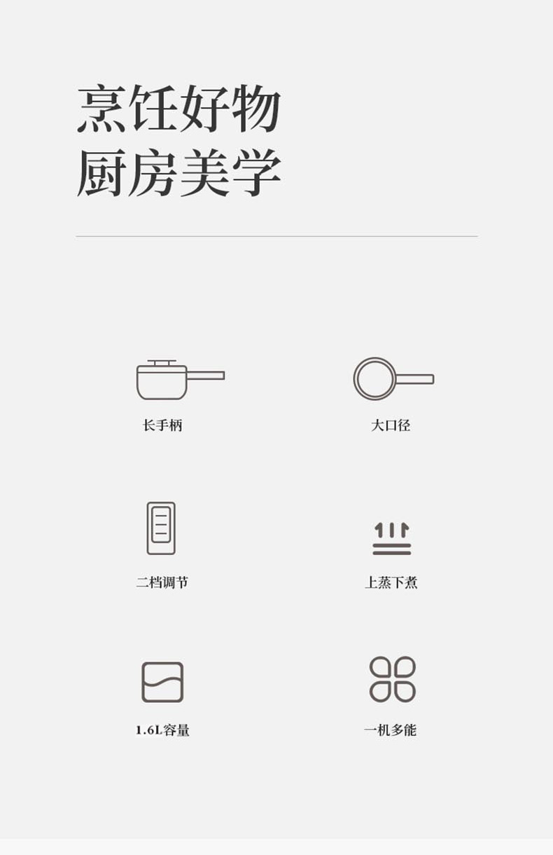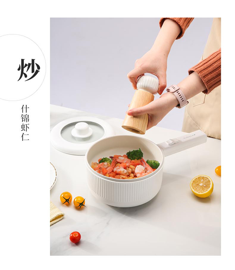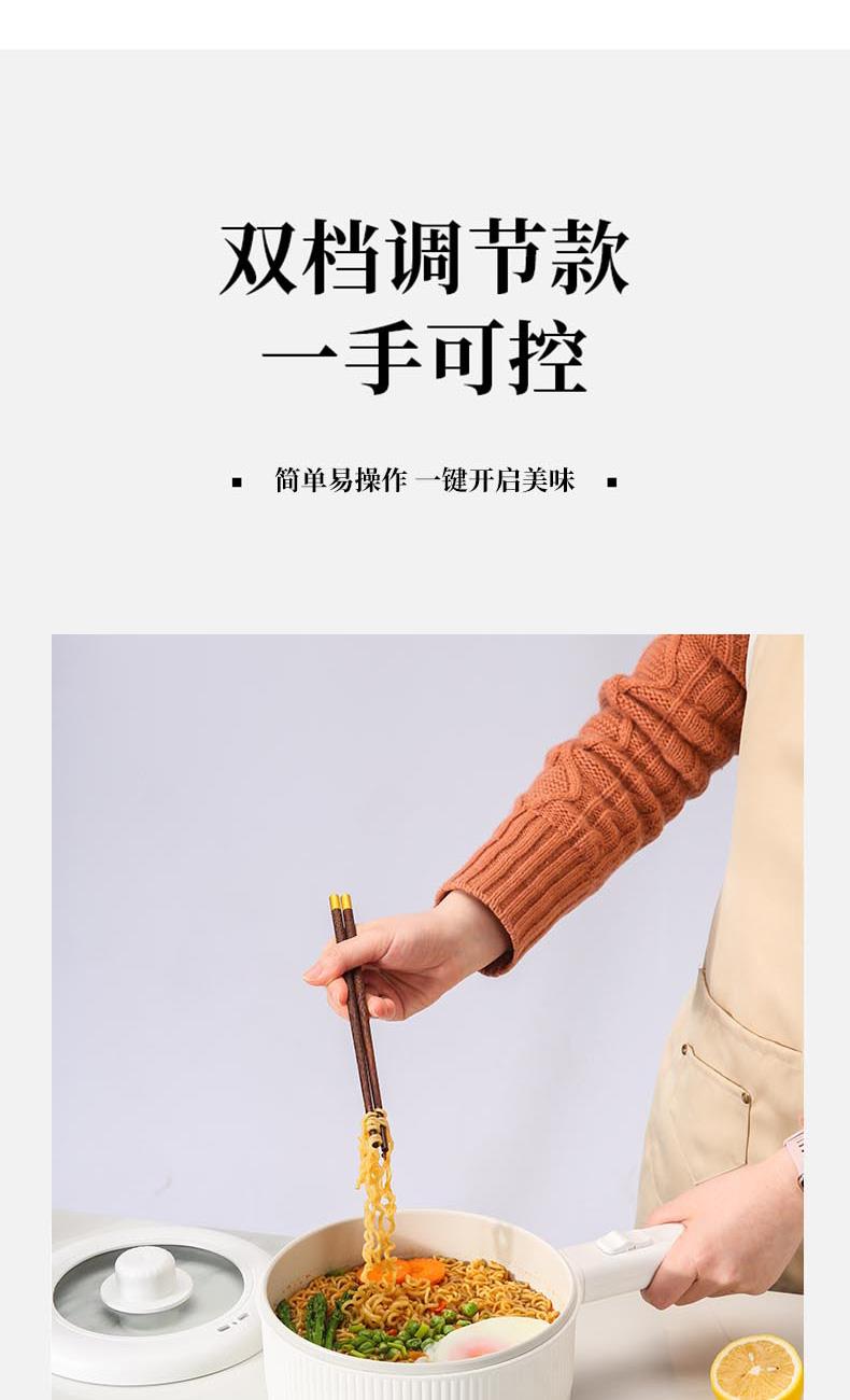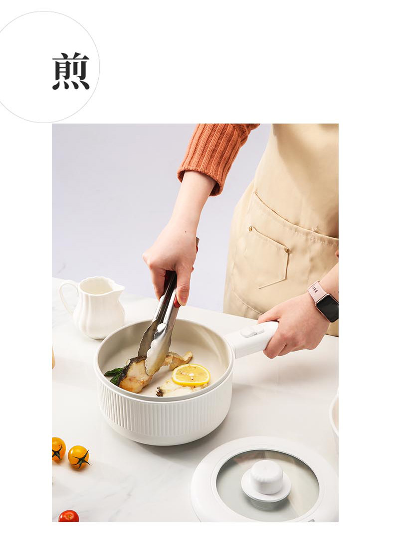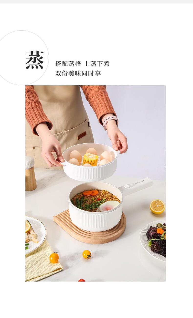 额定功率:710W 额定电压:220V 额定频率:50Hz 额定容量:1.6L 产品规格:355*230*190mm 产品颜色:白色 净重/毛重:0.95Kg/1.2kg 产品材质:不锈钢喷陶瓷釉/PP 彩盒尺寸:225*138*423mm 外箱尺寸:852*472*443mm 多功能设计,蒸煮煎炸、火锅、炒菜样样精通。 内胆采用白色不粘涂层,防粘锅。 配置食品级PP蒸笼,可蒸包子、鸡蛋等食物。 1.6L精致容量,刚好适合精致的你。