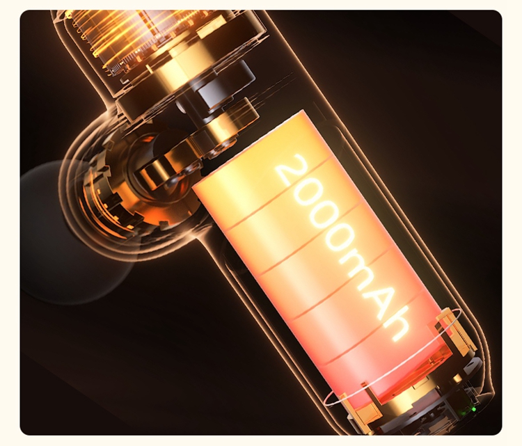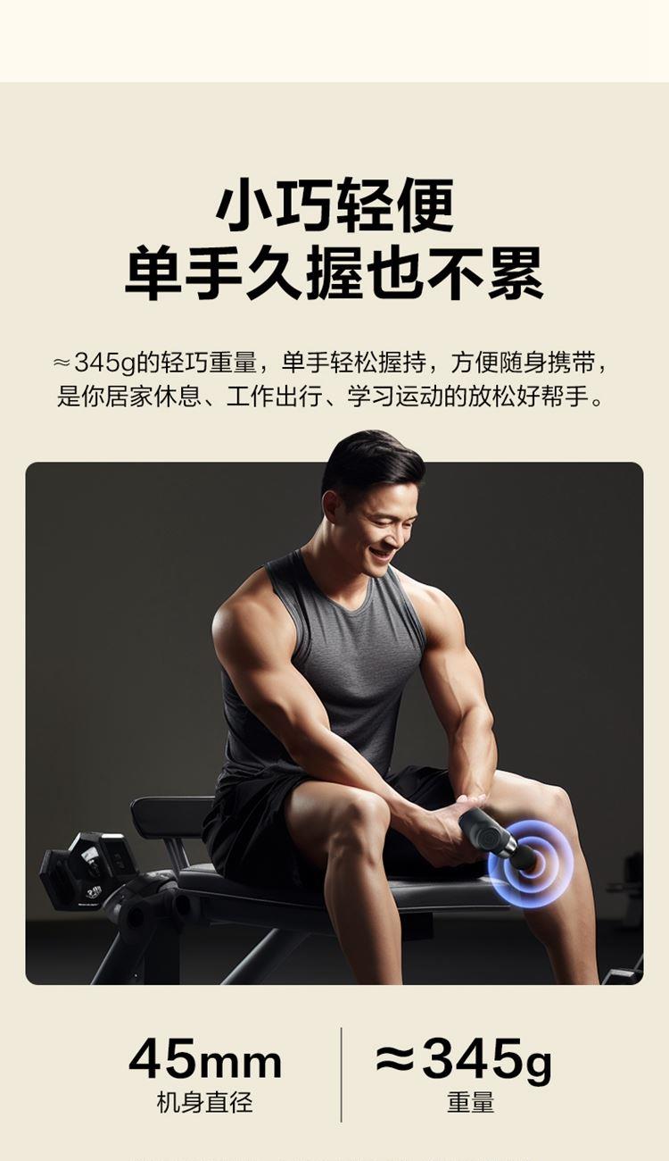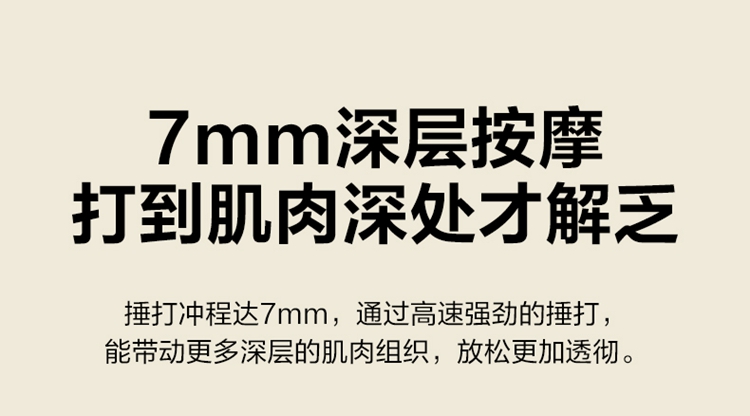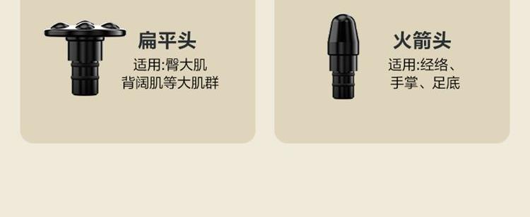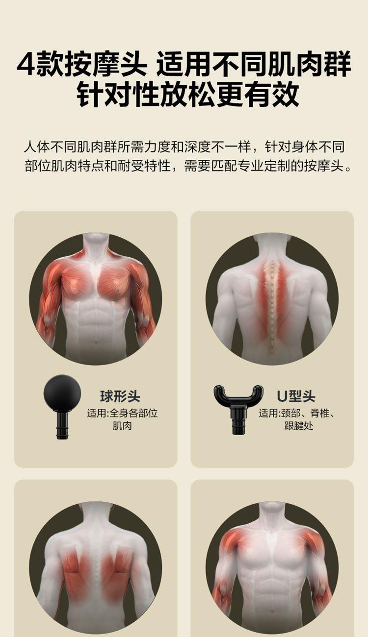 产品描述: 按摩筋膜枪 3200rpm无刷电机 7mm冲程 12kgf推力 1600~3200rpm精细4档变速 按摩头:球形/平型/子弹/U型 产品参数: 机身材质:ABS/硅胶 电源电压:5V/40W 充电接口:Type-C 控制方式:机身按键 语音播报:无 电池容量:2000mAh锂电池 续航时间:6-19小时 按摩时间:15分钟 按摩模式:4档力度 热敷档位:无 温度挡位:/°C 单台毛重/净重:0.64/0.345kg 中箱尺寸:171*73*202mm