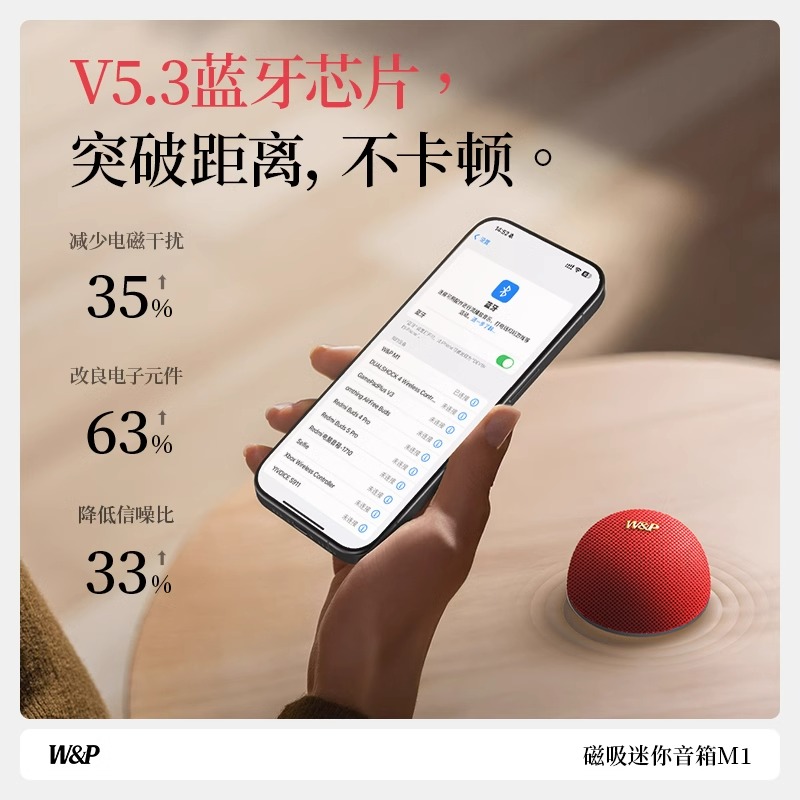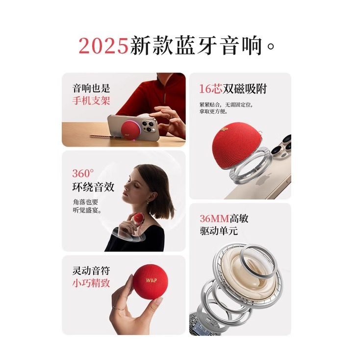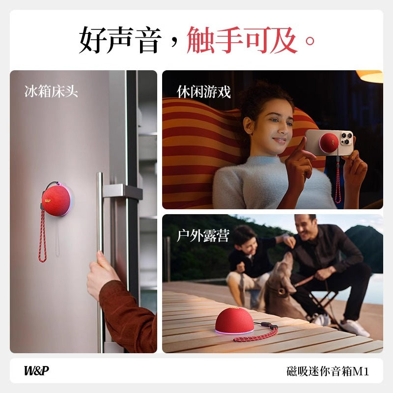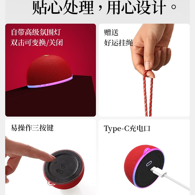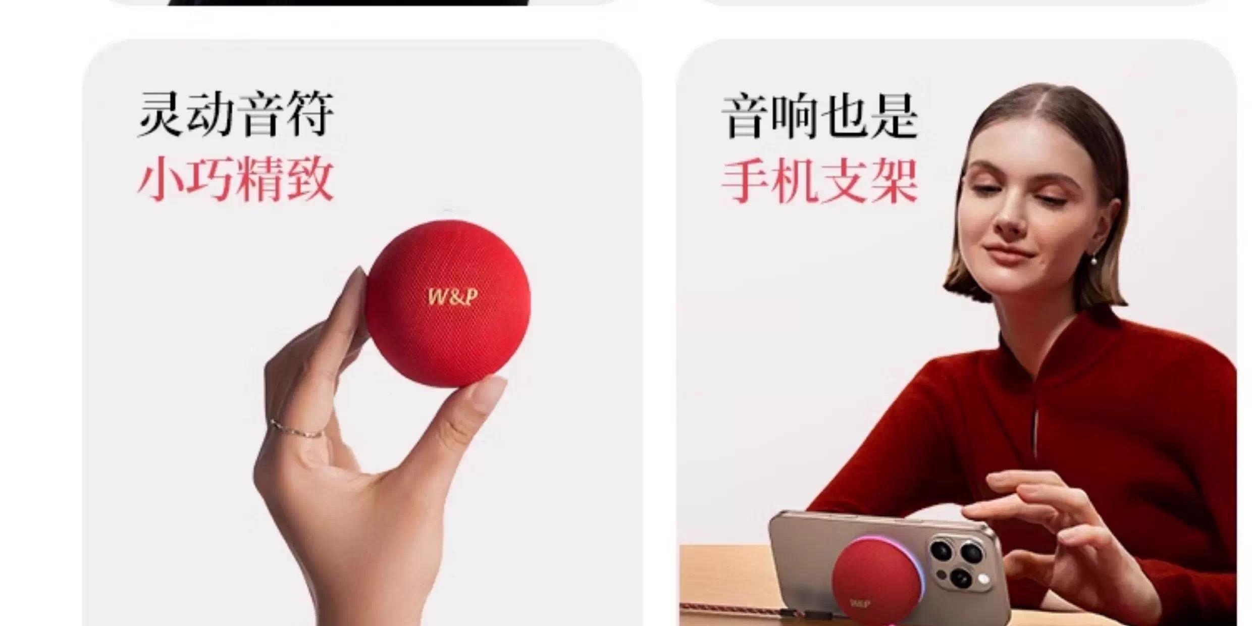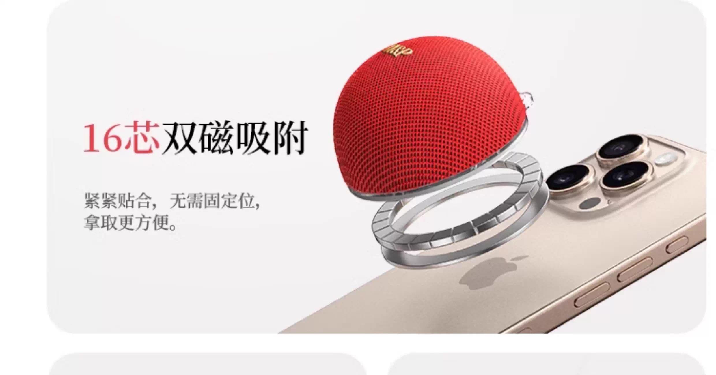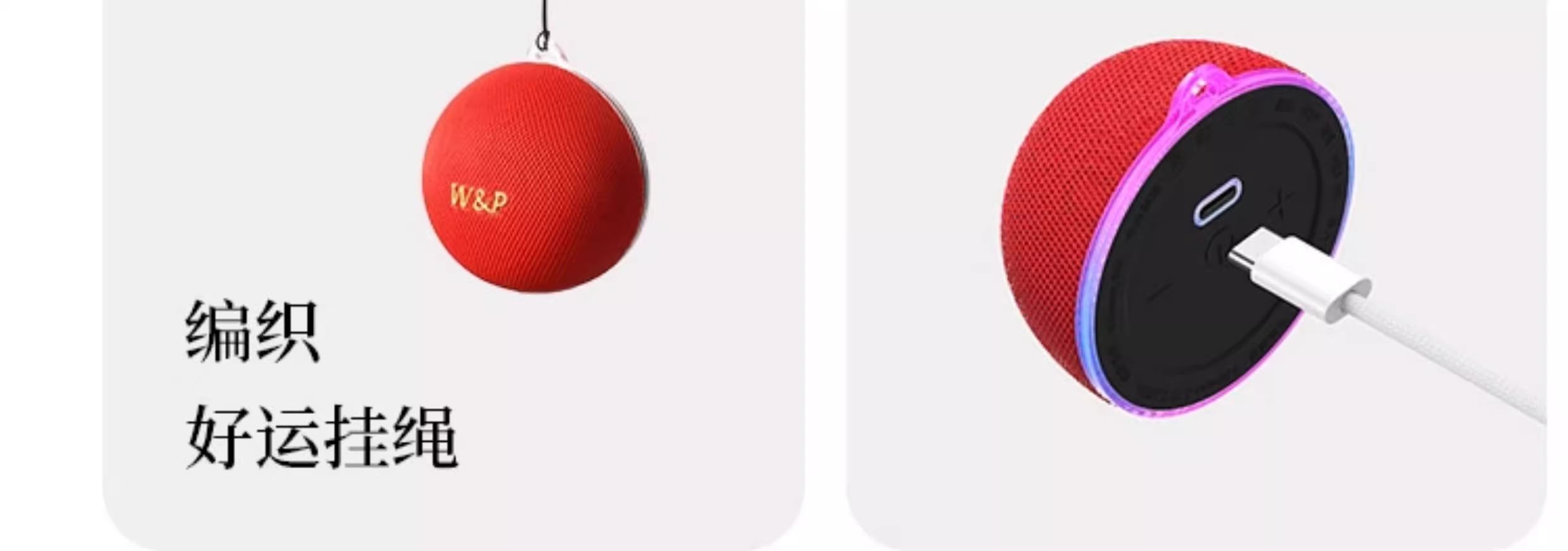 1.磁吸迷你蓝牙音响,可吸附手机,办公桌椅,学生宿舍床架,可配挂绳使用场景多,更好定位消费群体。打造场景。 2.16芯双磁内磁喇叭,小钢炮级别的低音,人声清晰通透 3.电池使用600毫安聚合物电池,电池续航可高达5到12小时。 4.经典织布工艺加RGB灯光,即简洁又不失科技感。