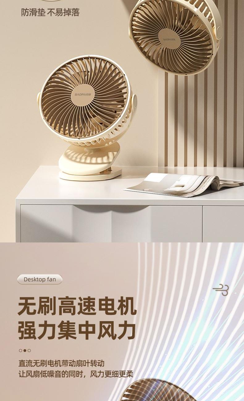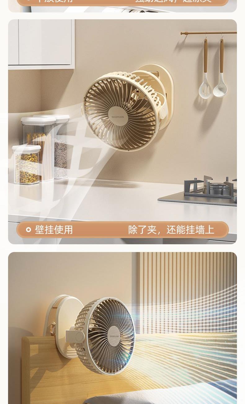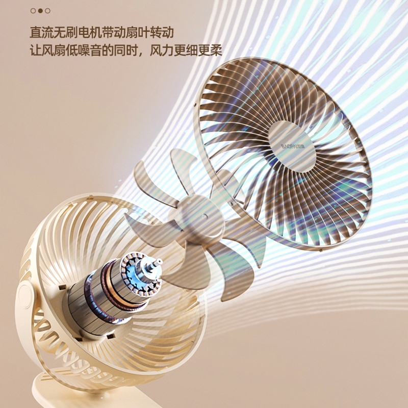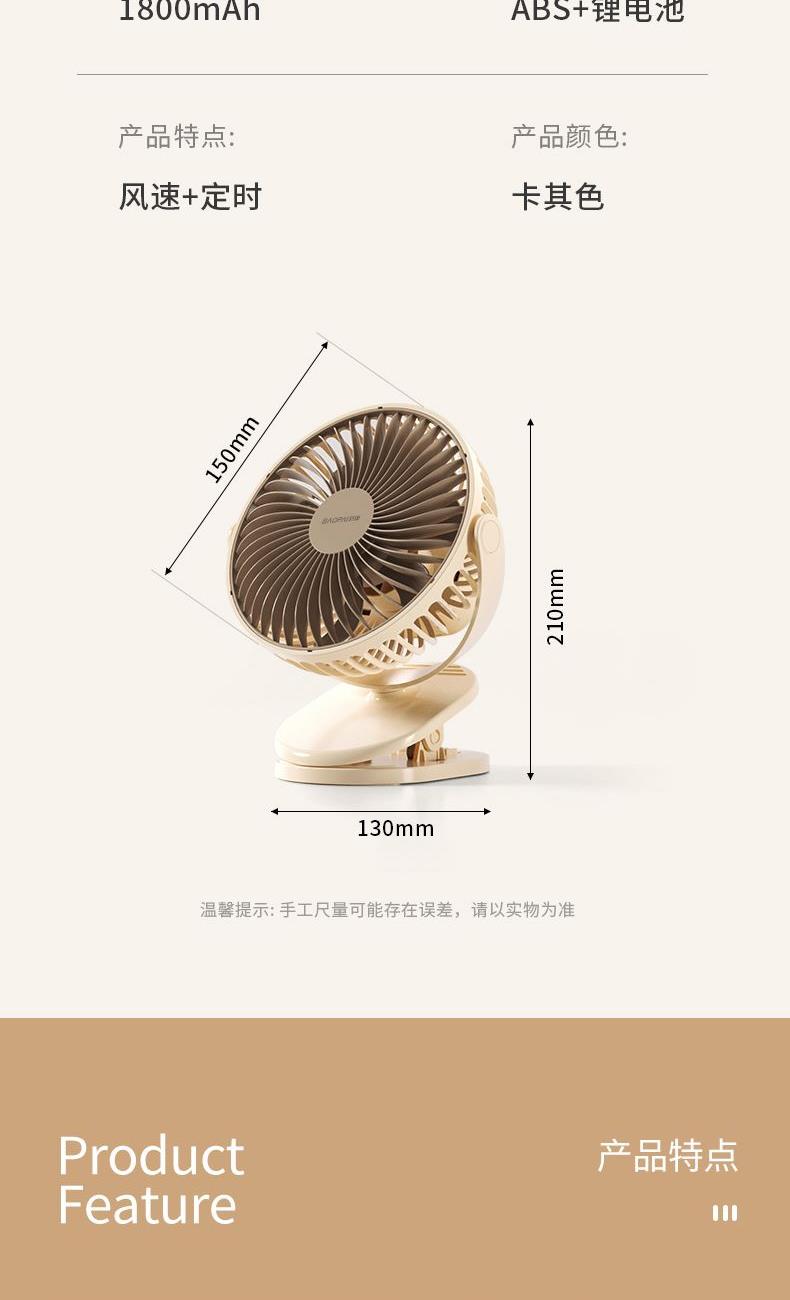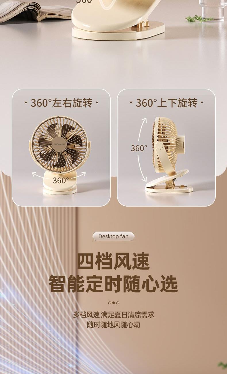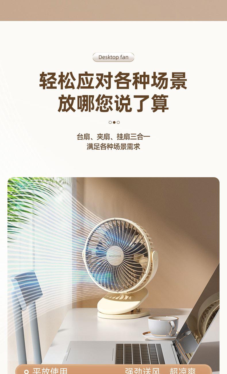 台/夹/挂三用,适合更多使用场景 左右360°,上下360°无死角送风 4档风力调节,照顾不同人群 8小时定时功能 轻音无刷电机,安静不打扰 可拆卸前网罩,方便清洁 产品材质:ABS USB供电 : 5V ==5W 电池供电 : 3.7V ==5W 产品净重:350g 电池容量 :1800mAh 产品尺寸:130*150*210mm 彩盒尺寸:155*155*175mm 箱/数量:40台 外箱尺寸: 840*340*740mm