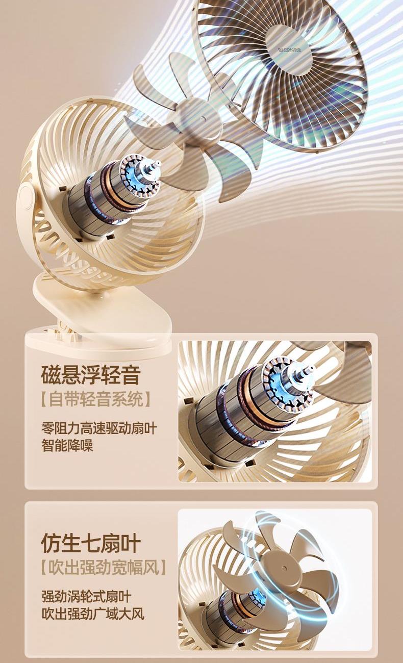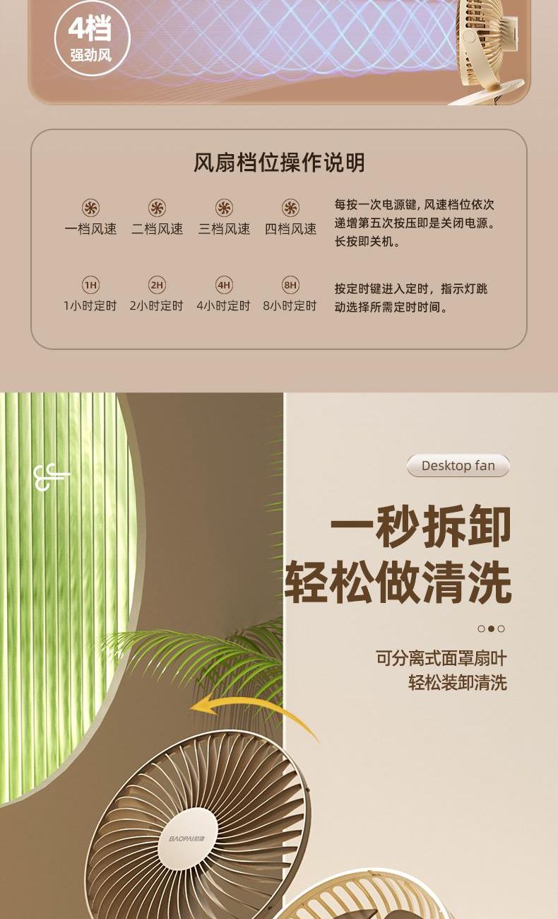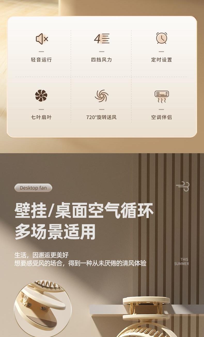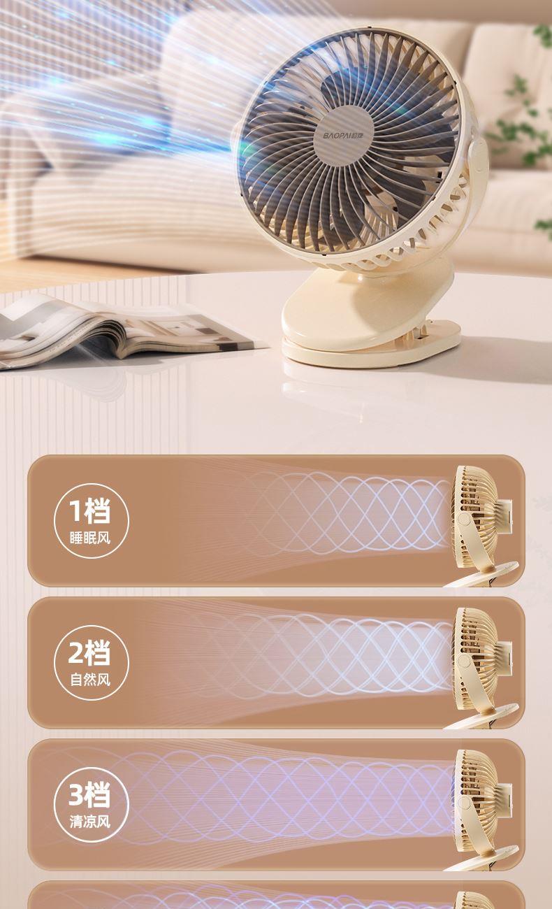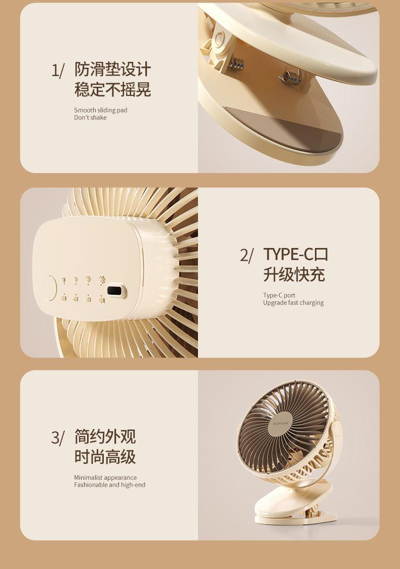 台/夹/挂三用,适合更多使用场景 左右360°,上下360°无死角送风 4档风力调节,照顾不同人群 8小时定时功能 轻音无刷电机,安静不打扰 可拆卸前网罩,方便清洁 产品材质:ABS USB供电 : 5V ==5W 电池供电 : 3.7V ==5W 产品净重:350g 电池容量 :1800mAh 产品尺寸:130*150*210mm 彩盒尺寸:155*155*175mm 箱/数量:40台 外箱尺寸: 840*340*740mm