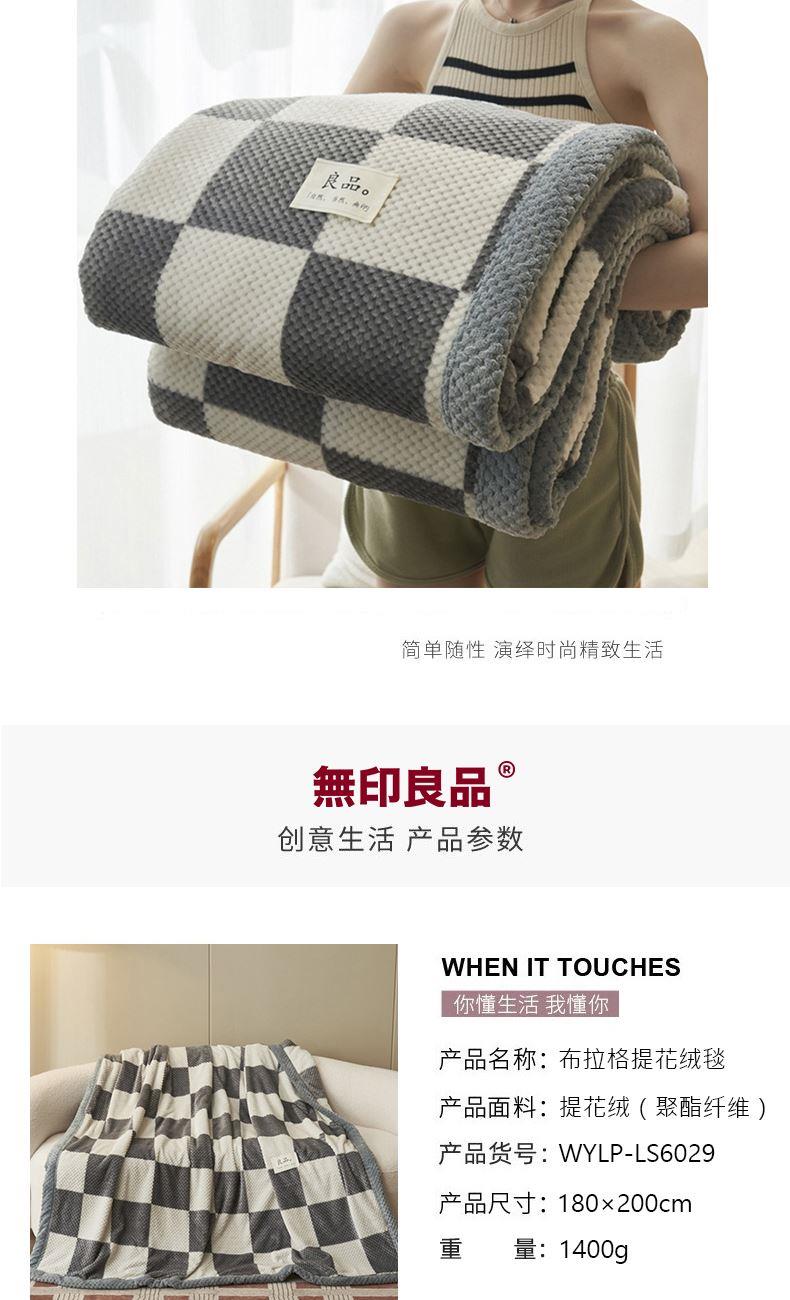 规 格:180×200cm 面 料: 提花绒(聚酯纤维) 克 重: 1400g “無印良品”大染无印,优良品质的产品是年轻人喜欢的,“無印”设计, 优雅 , 质朴 , 自然 , 是無印良品的初心与追求。让体验更舒适。享受简约健康生活,走进無印,上善若水,大爱无疆,创新让生活更精彩。