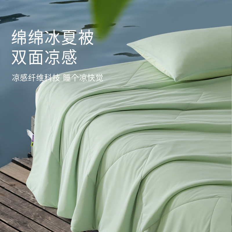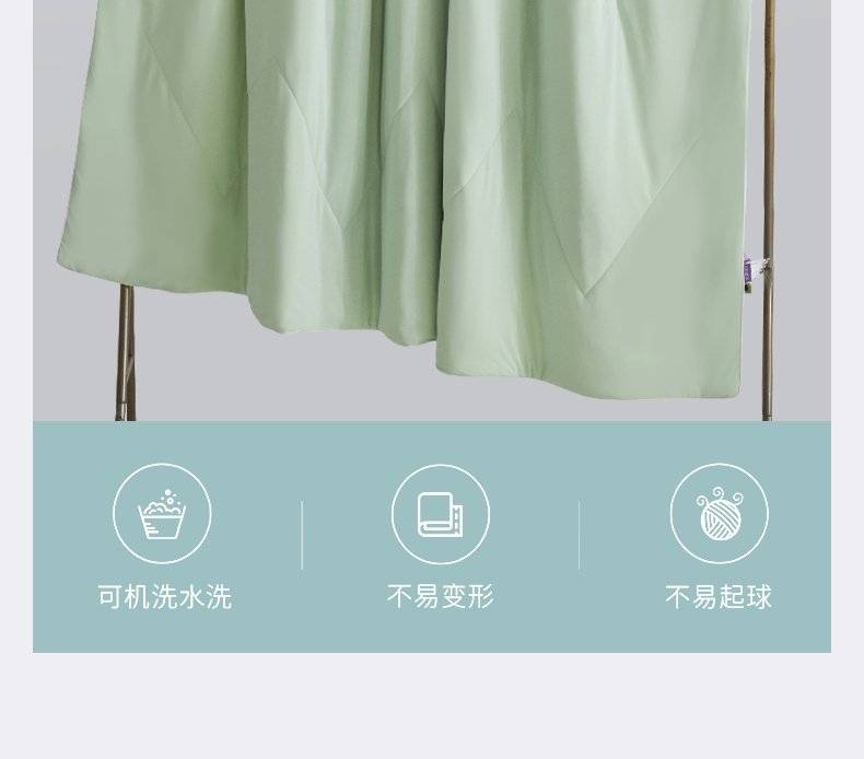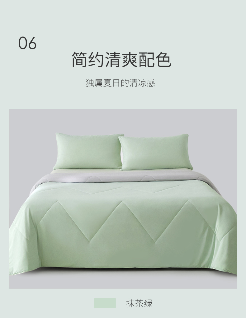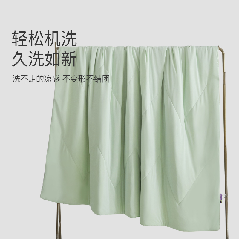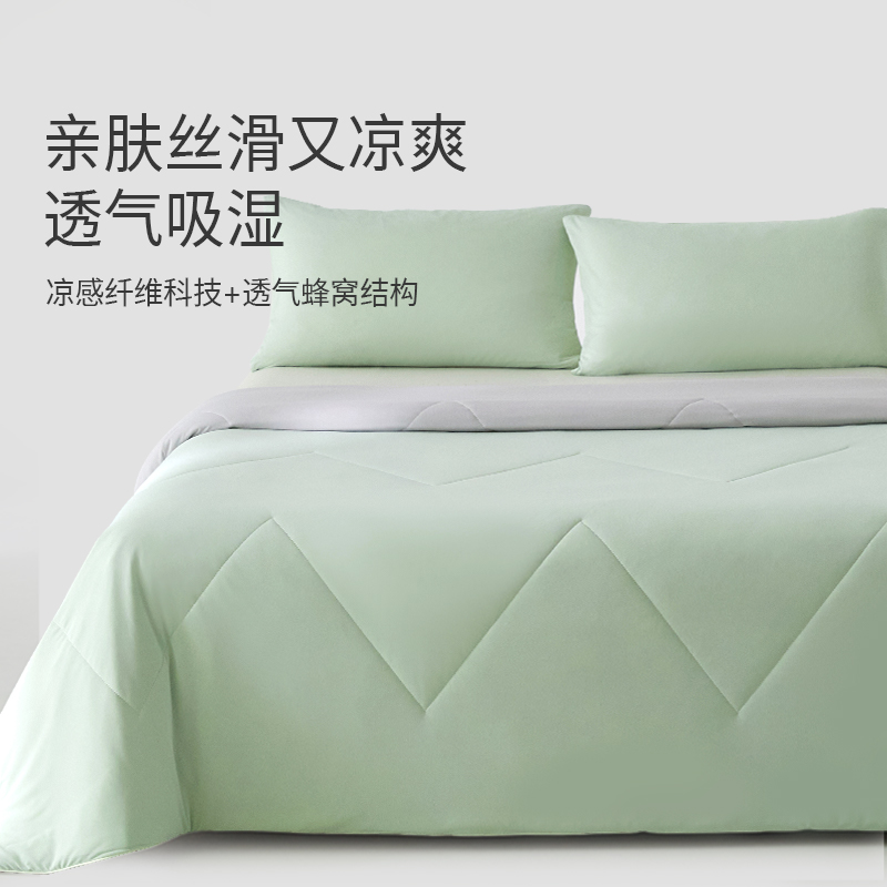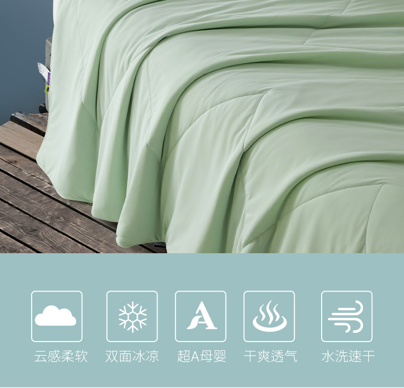产品尺寸:150*200cm 填充:300g 面料:92%聚酯纤维(凉感纤维)+8%氨纶 颜色:抹茶绿、海盐蓝、柠檬黄 霜感面料,盖在身上的“空调; 采用cool霜感纤维高冰面,恰到好处的舒适凉感 A类母婴级,0甲醛,0致癌芳香胺,0荧光剂,宝宝用好,你用也好 AB版面双色设计,简约艺术设计,适应人群及家居范围广
