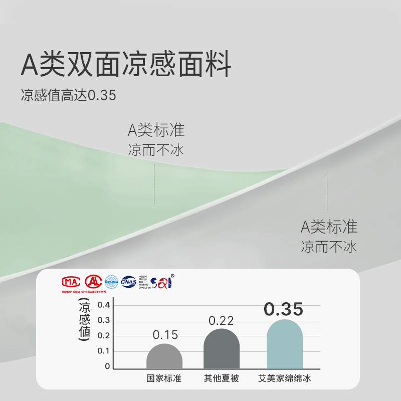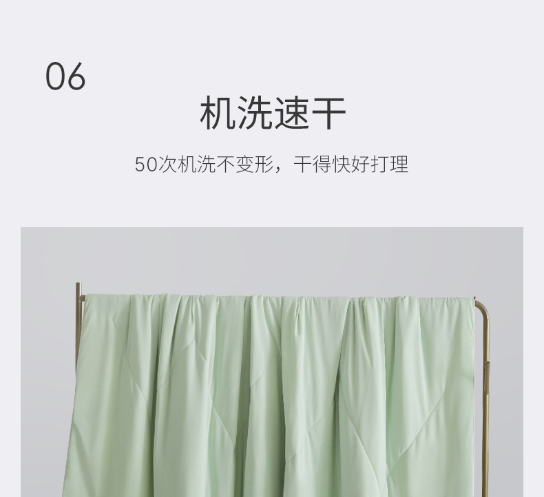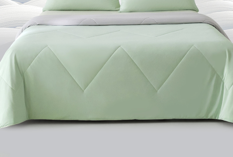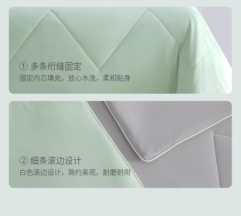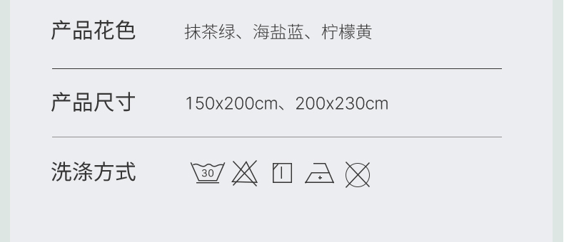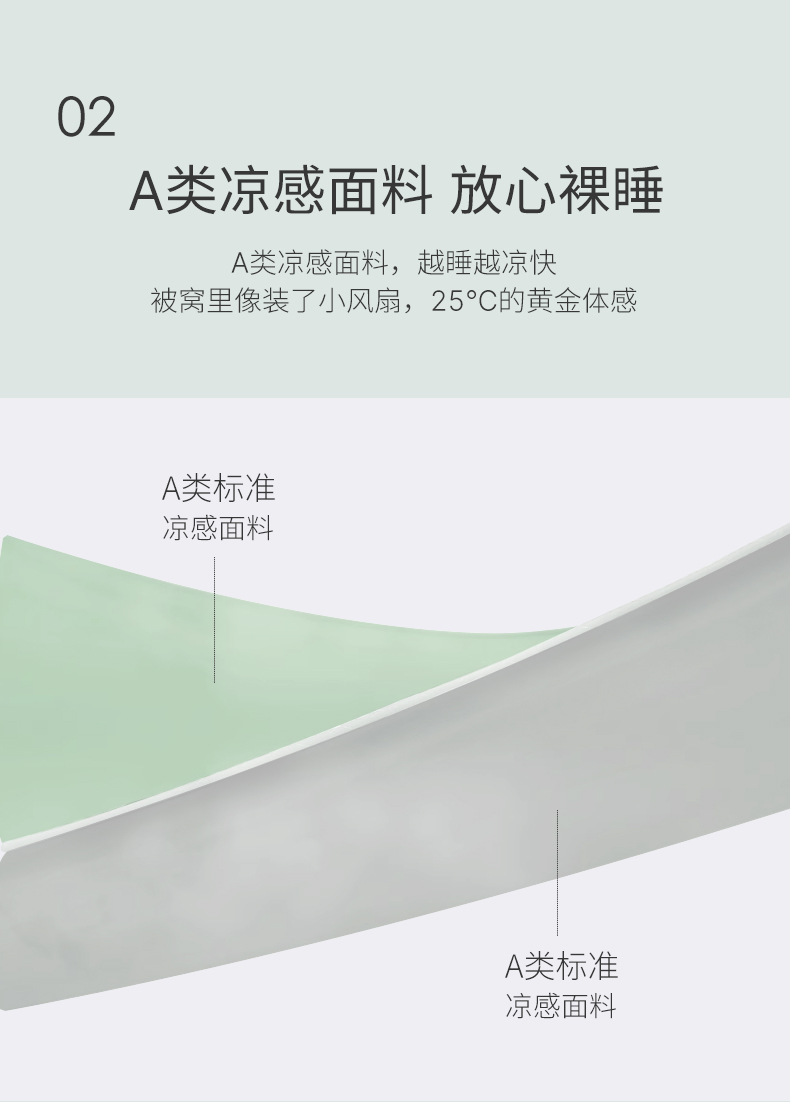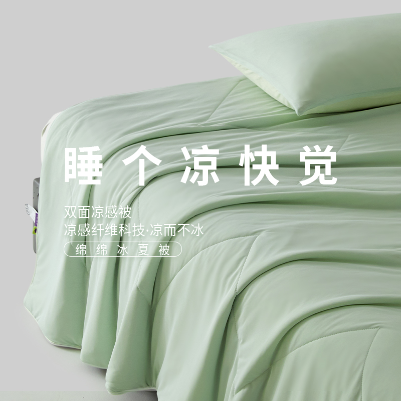 产品尺寸:150*200cm 填充:300g 面料:92%聚酯纤维(凉感纤维)+8%氨纶 颜色:抹茶绿、海盐蓝、柠檬黄 霜感面料,盖在身上的“空调; 采用cool霜感纤维高冰面,恰到好处的舒适凉感 A类母婴级,0甲醛,0致癌芳香胺,0荧光剂,宝宝用好,你用也好 AB版面双色设计,简约艺术设计,适应人群及家居范围广