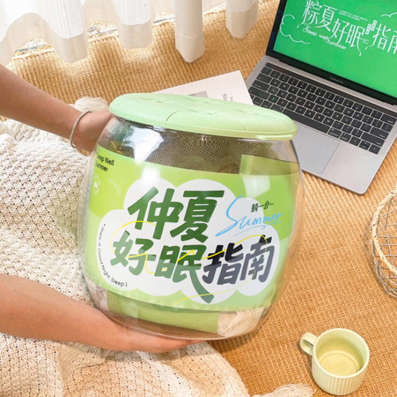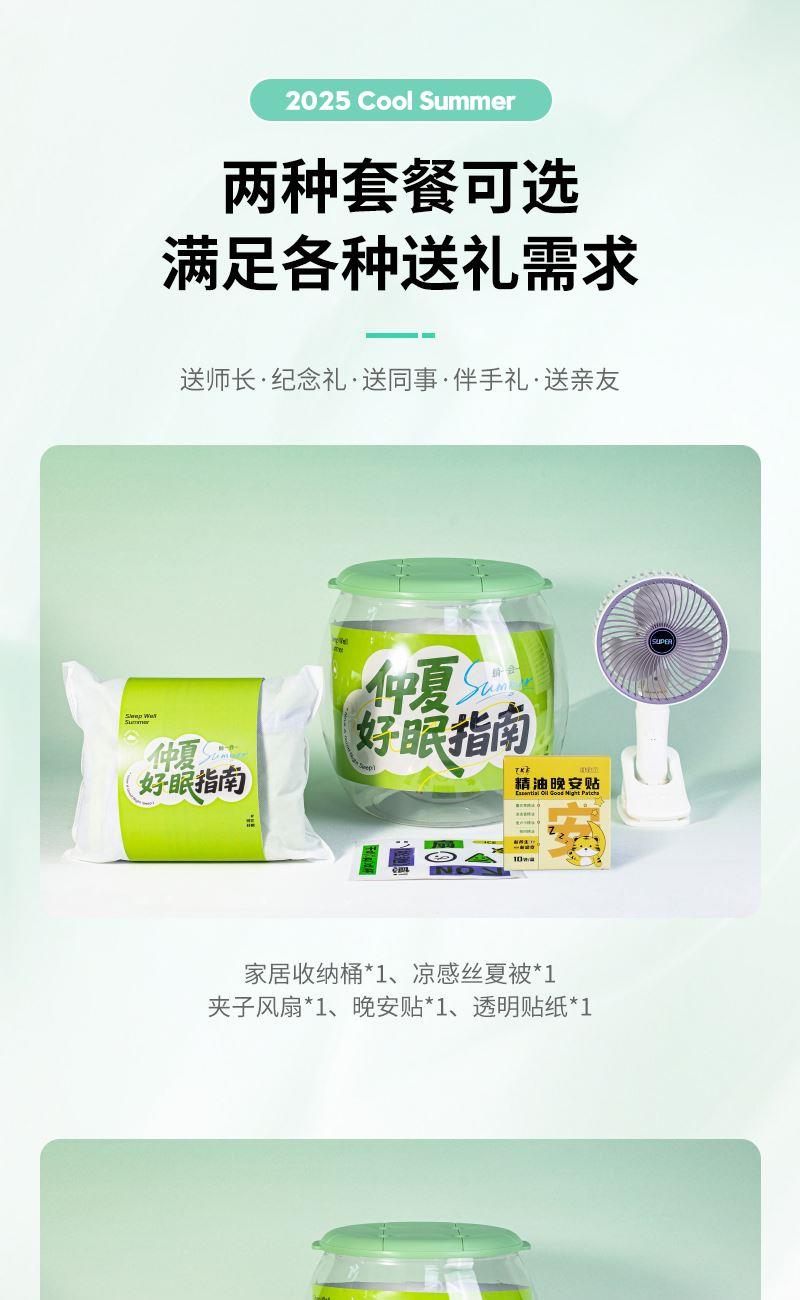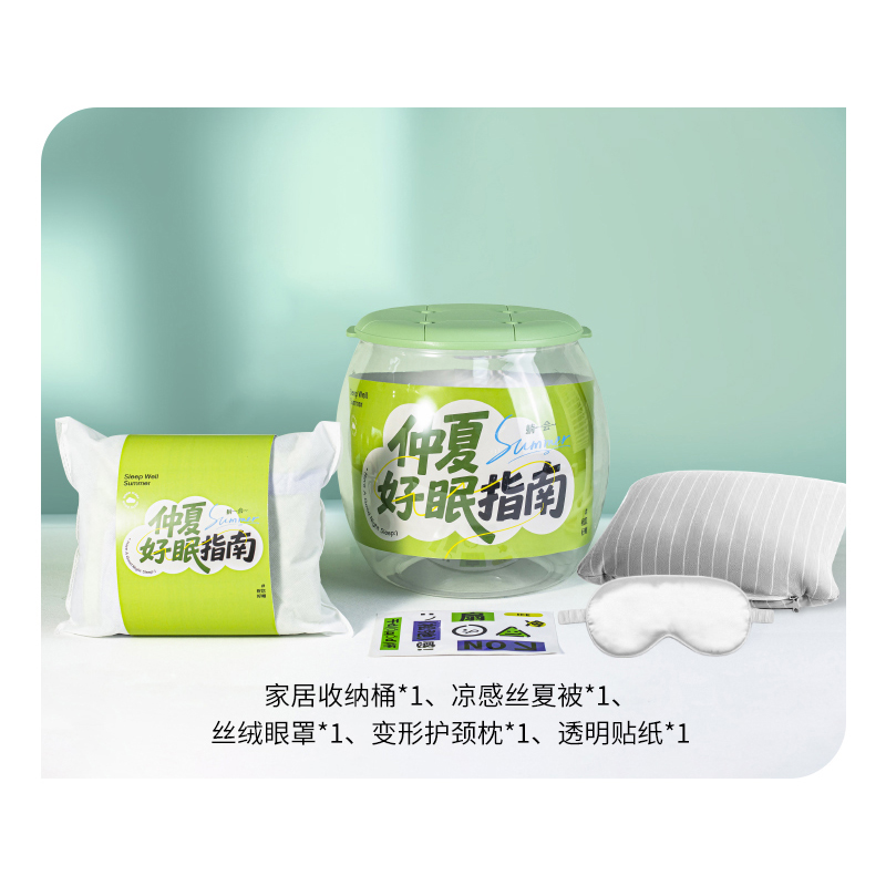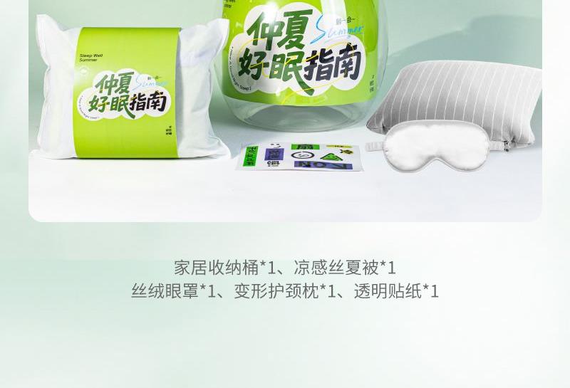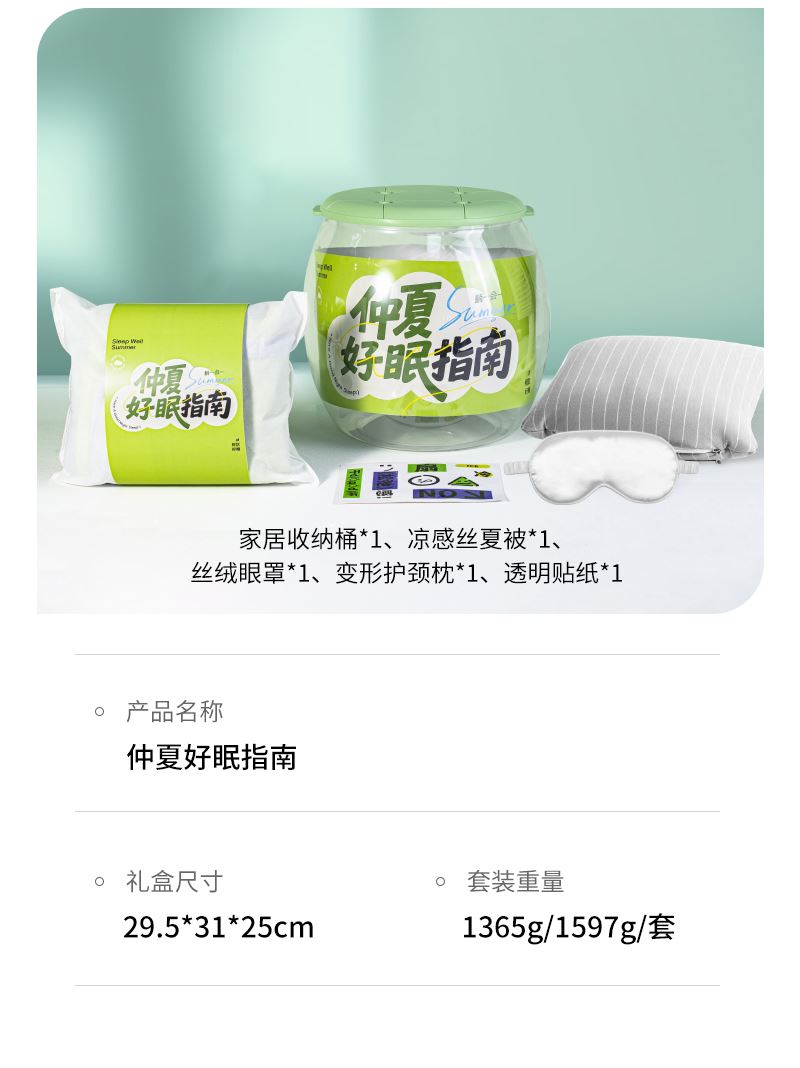 礼盒参数: 收纳桶尺寸:29.5*31*25cm 套装重量:1365g/套 详细介绍: 1.凉感夏凉被 面料成分:聚酯纤维(凉感纤维) 填充物成分:聚酯纤维(整张羽丝棉) 产品尺寸:100*150cm 2.变形护颈枕 功能:颈枕&靠枕 材质:粒子+汗布棉 颜色:4色随机 尺寸:30*30CM 3.丝绒眼罩 材质: 仿真丝面料 颜色:白、黑、粉、紫(随机发货) 规格: 205*95mm 重量:22g 4.趣味贴纸