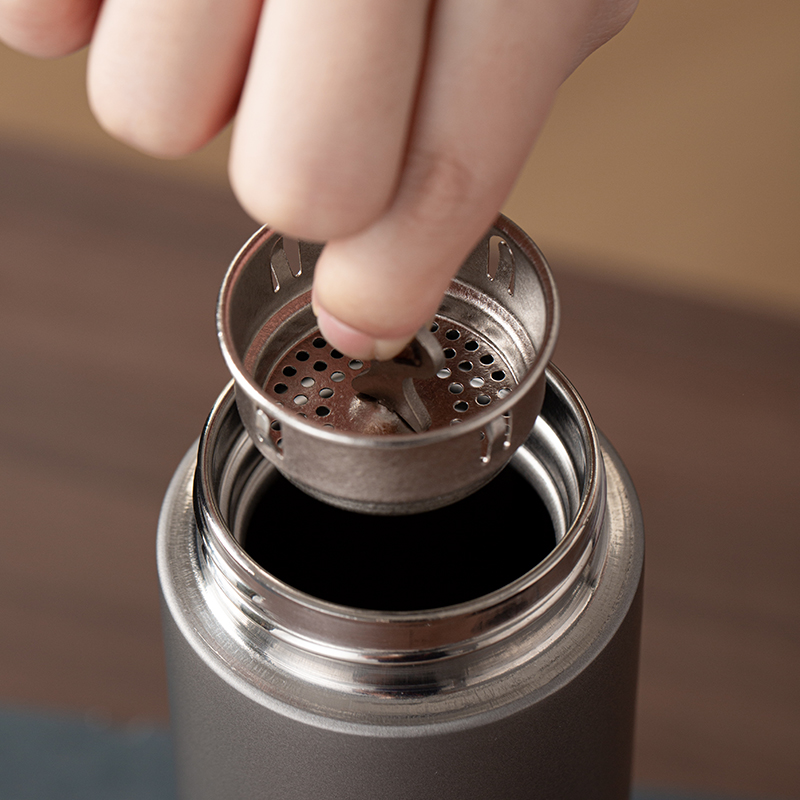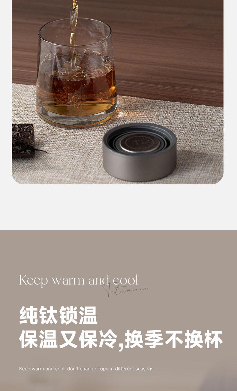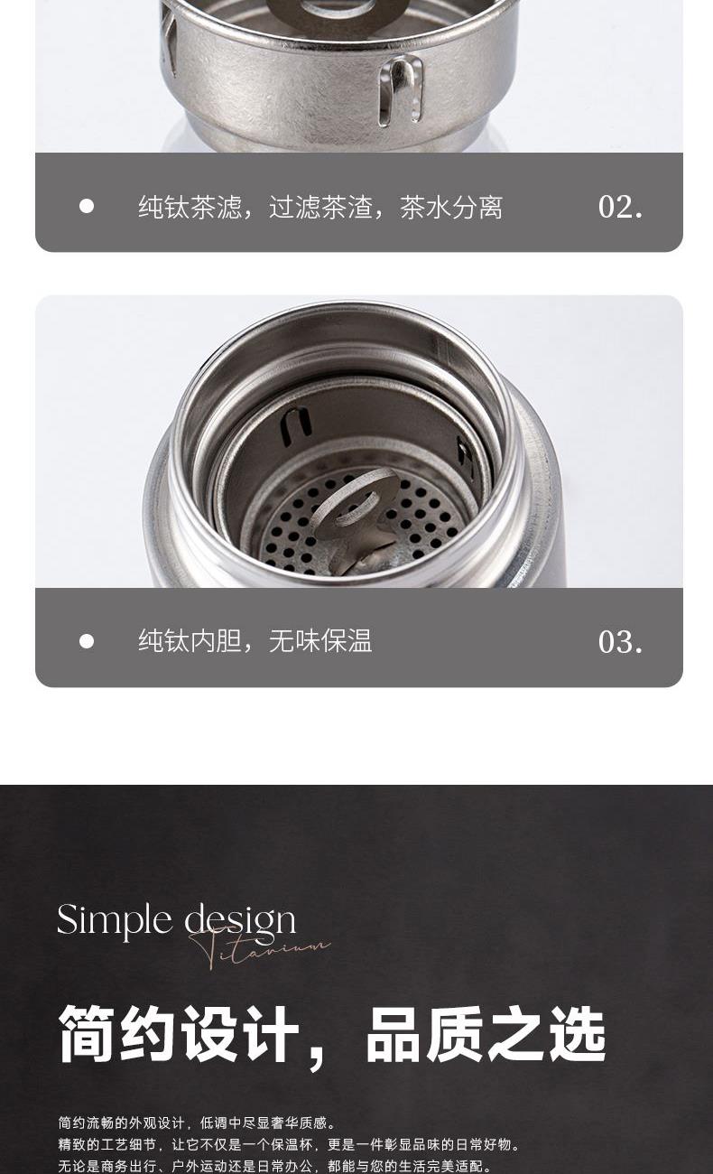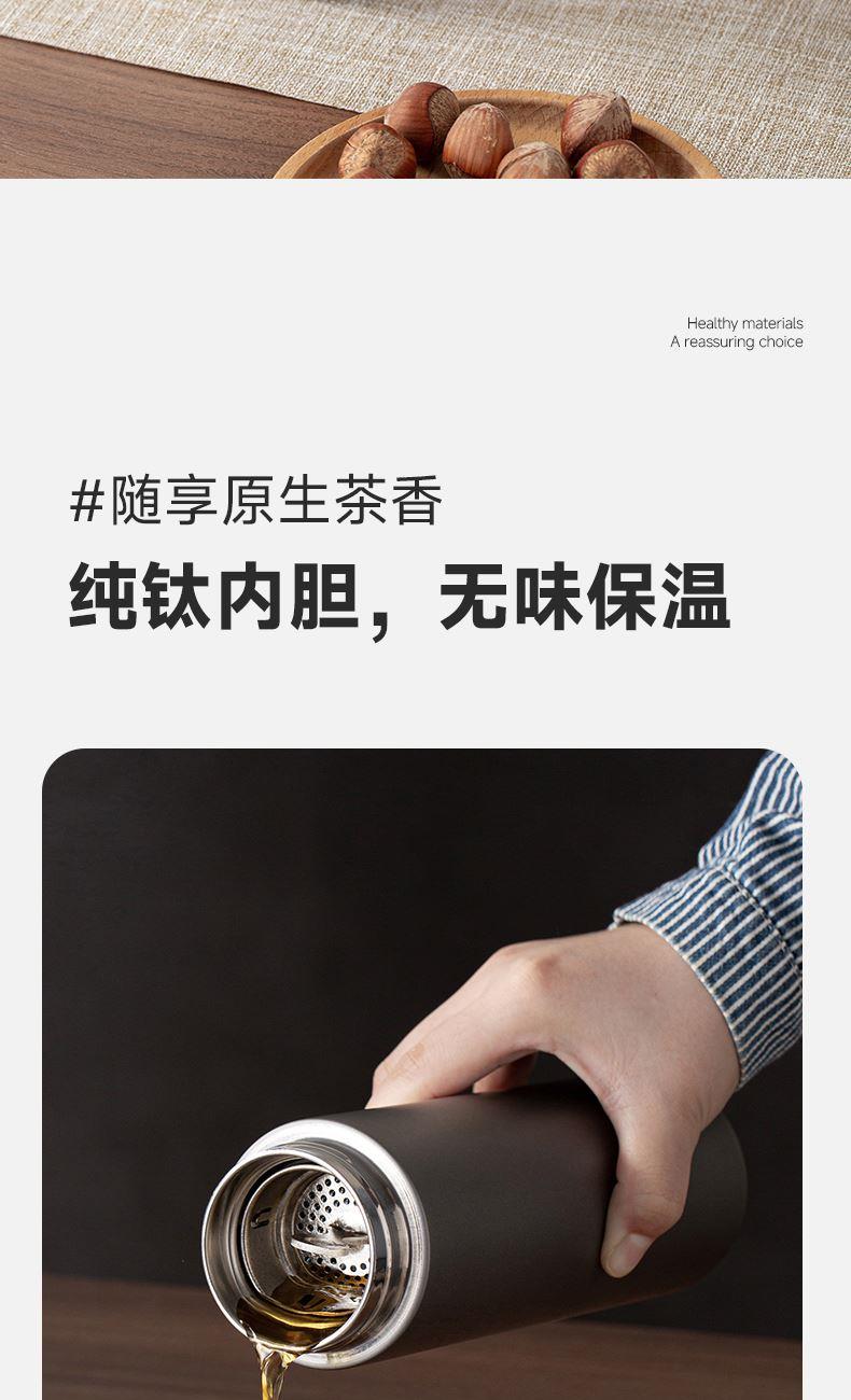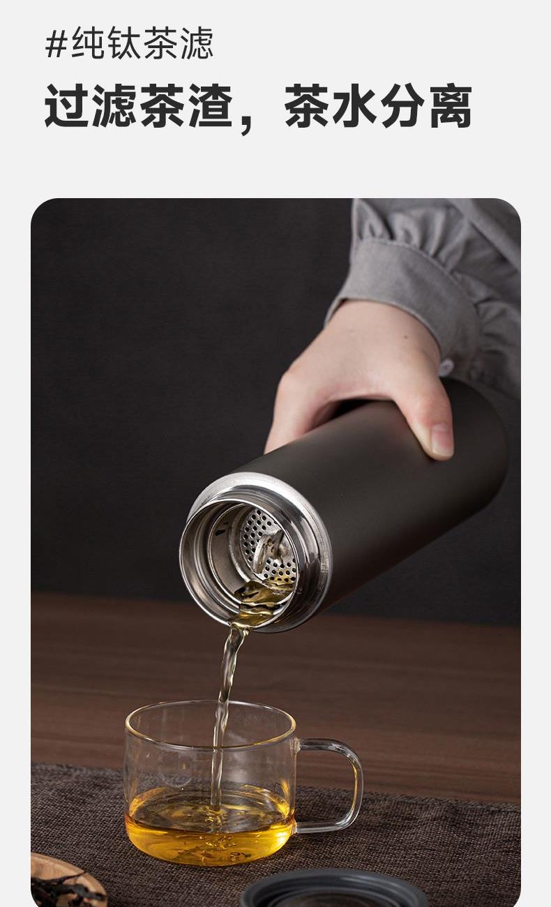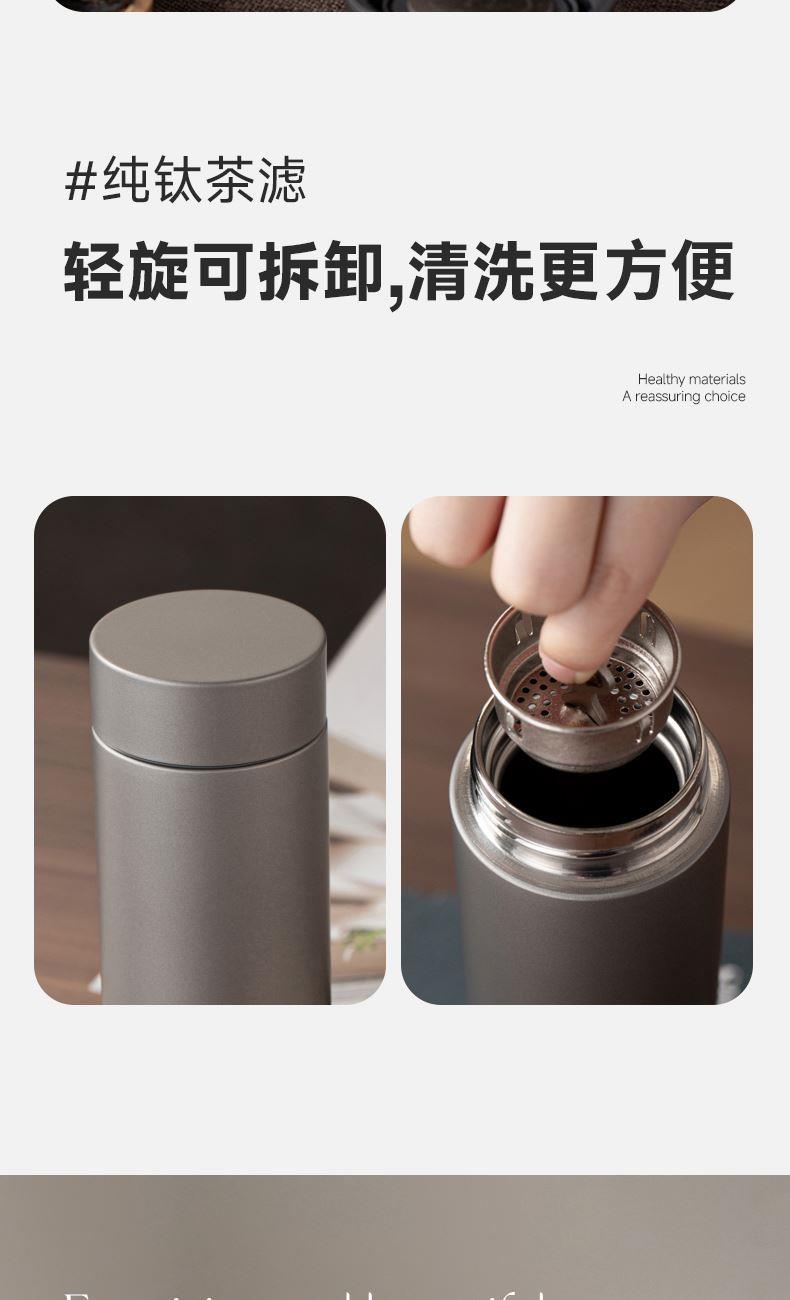 配 置:保温杯*1 参 数:容量:500ml 杯身 高:200mm 杯口内径:49mm 杯底直径:66.5mm 颜 色:灰色 材 质:内胆:钛 外壳:喷漆 1:精致升级更瞩目,手感更细腻。 2:纯钛内胆,无味保温,随享原生茶香。 3:纯钛茶滤,过滤茶渣,茶水分离。 4:纯钛锁温,保温又保冷,换季不换杯。 5:轻旋可拆卸,清洗更方便。