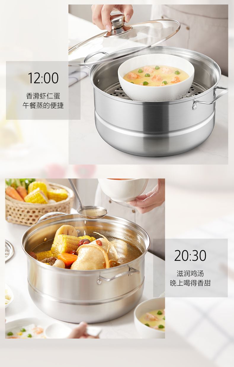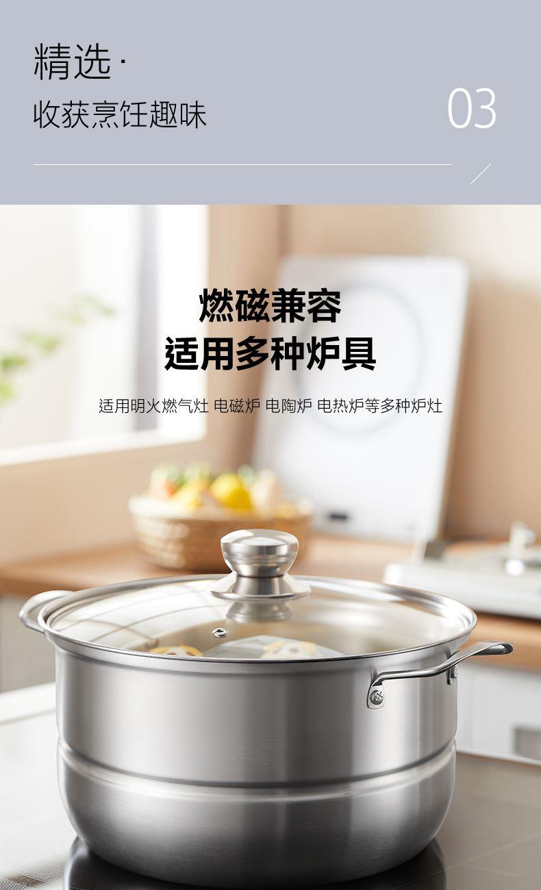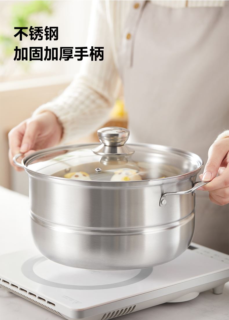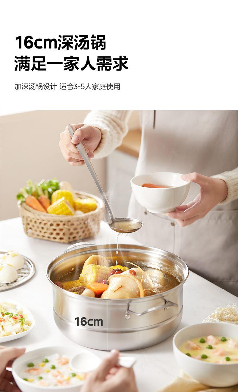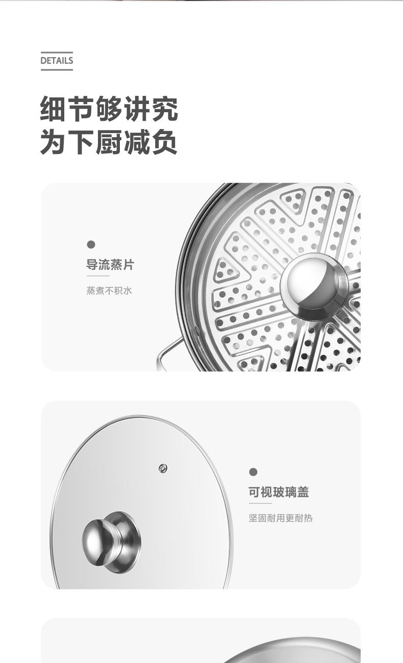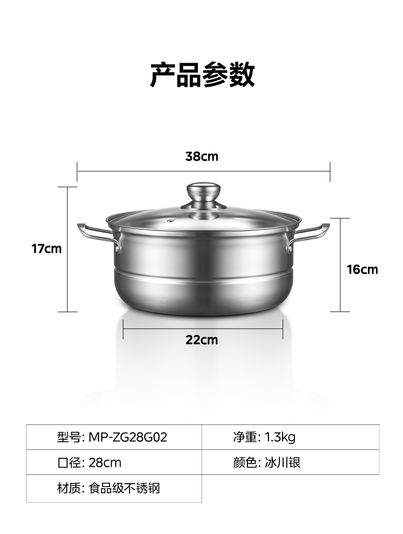 产品尺寸:38*17*22cm 产品材质:食品级不锈钢 产品颜色:冰川银 产品重量:1.3kg 产品卖点 食品级不锈钢,精致生活营养蒸 耐高温可视玻璃盖,监督食物状况 16cm深汤锅,满足一家人需求 燃磁兼容,适应多种灶具 伞状回流蒸格,蒸包不粘底 锅底聚能环,增加受热面积