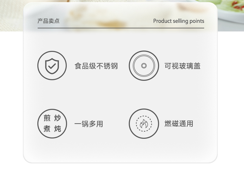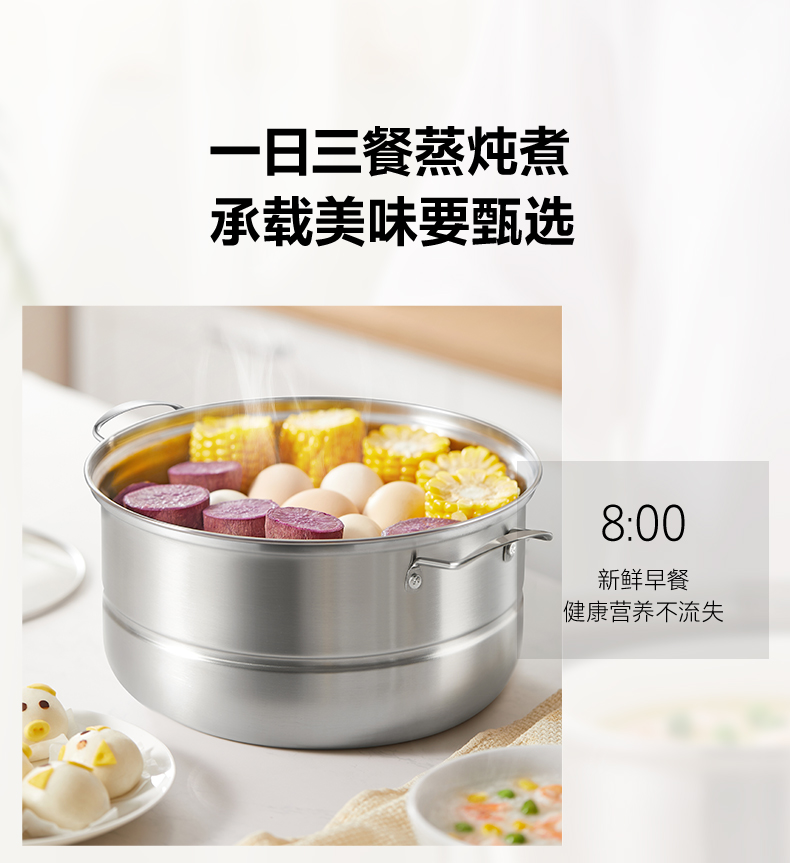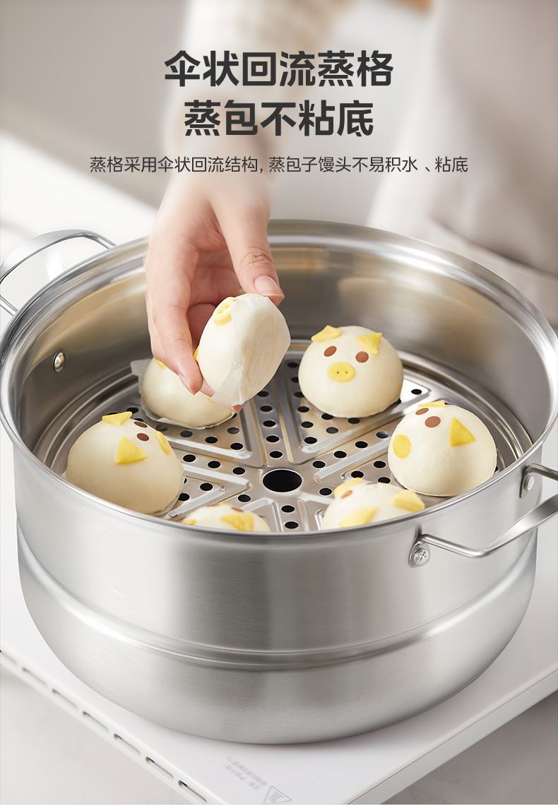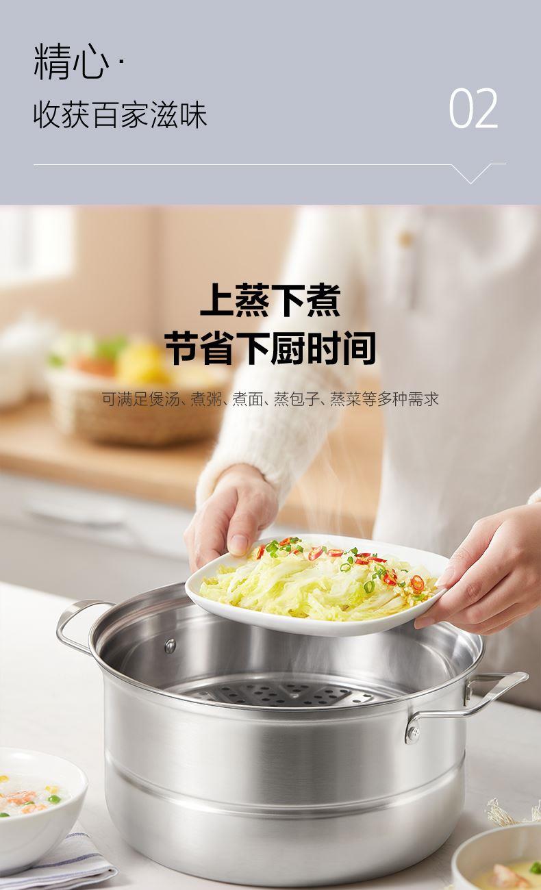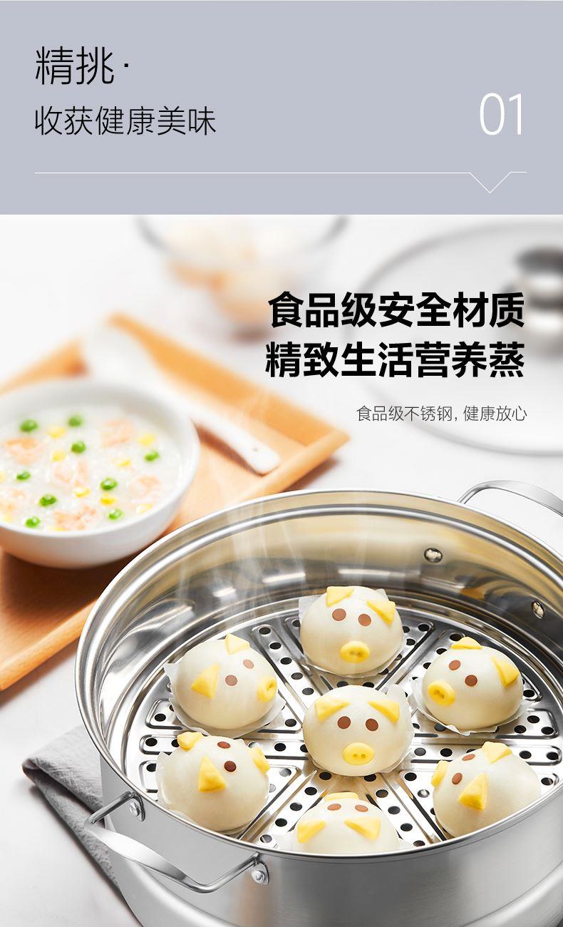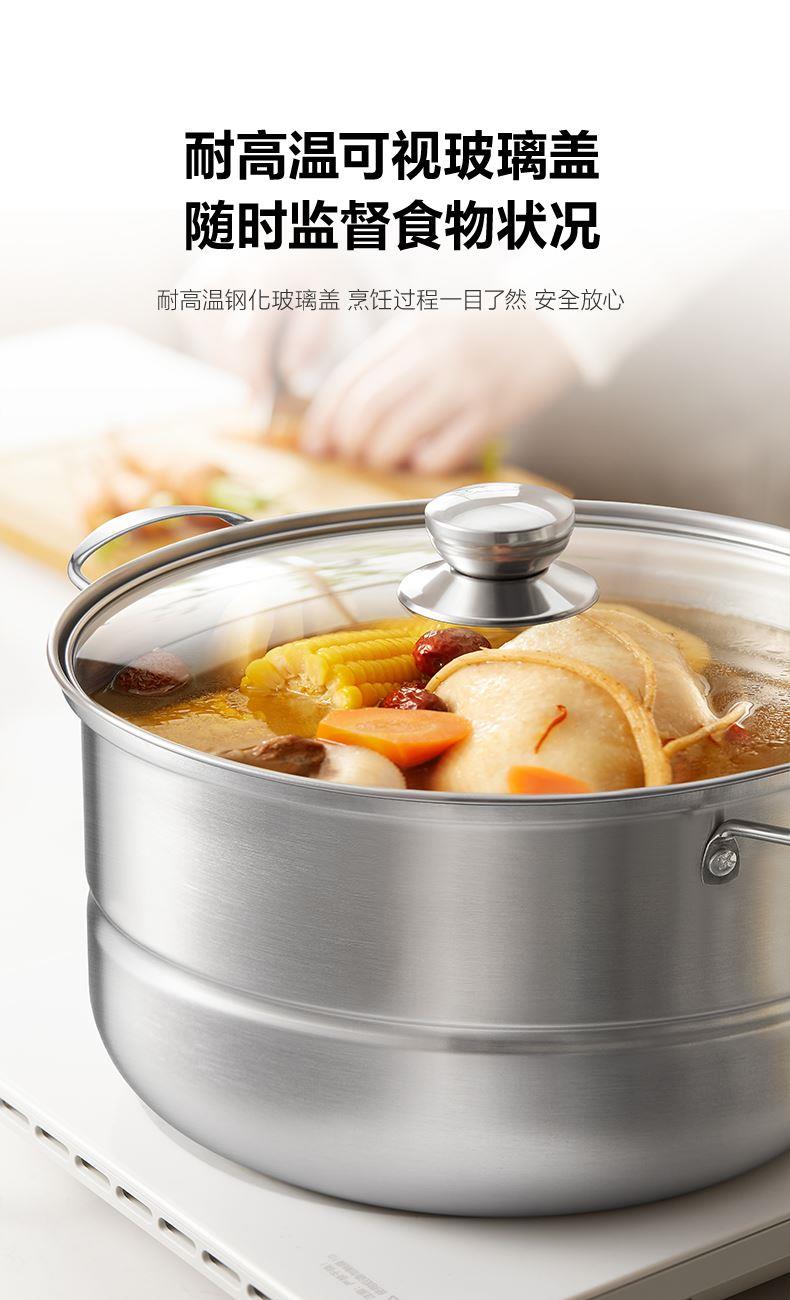 产品尺寸:38*17*22cm 产品材质:食品级不锈钢 产品颜色:冰川银 产品重量:1.3kg 产品卖点 食品级不锈钢,精致生活营养蒸 耐高温可视玻璃盖,监督食物状况 16cm深汤锅,满足一家人需求 燃磁兼容,适应多种灶具 伞状回流蒸格,蒸包不粘底 锅底聚能环,增加受热面积