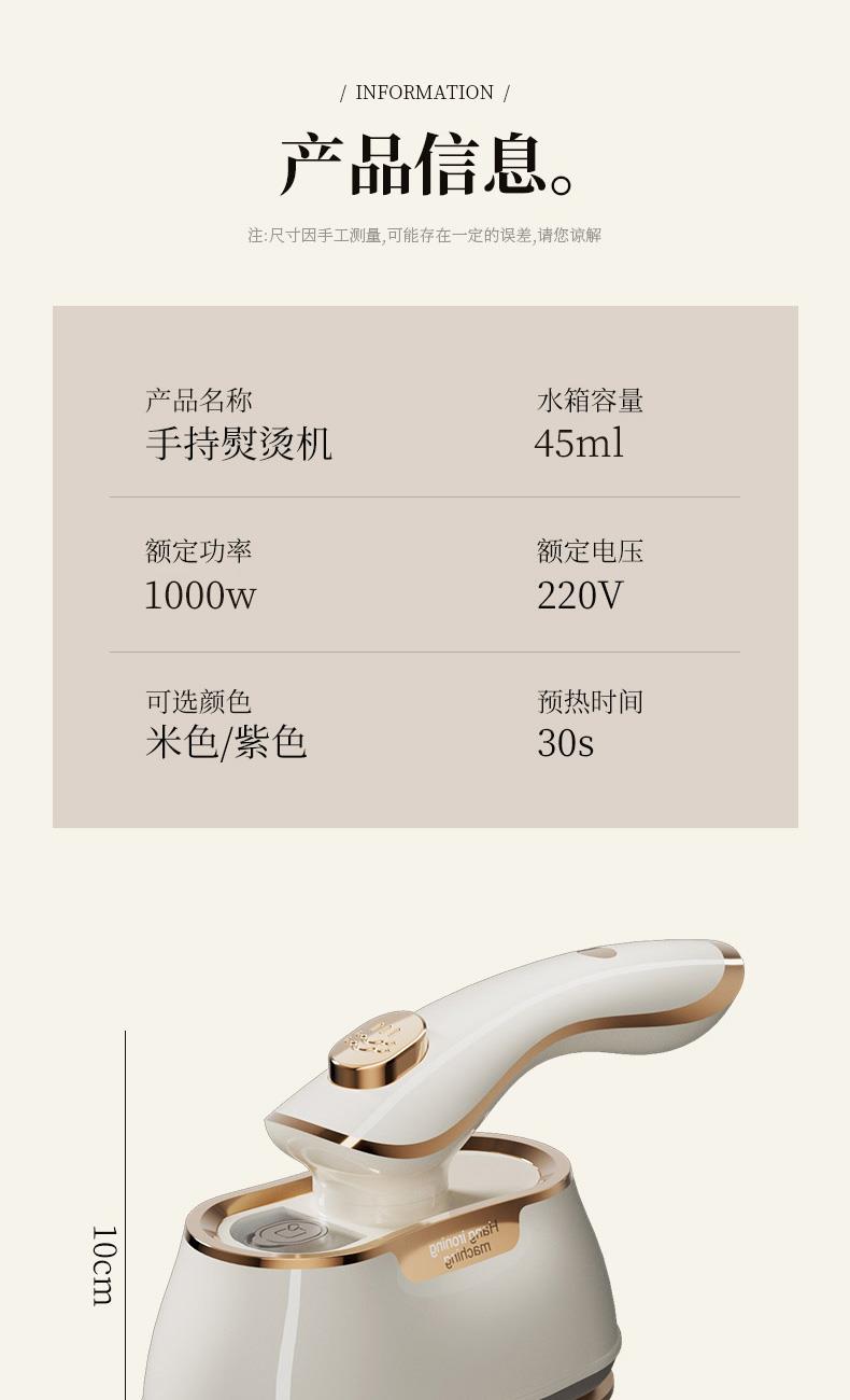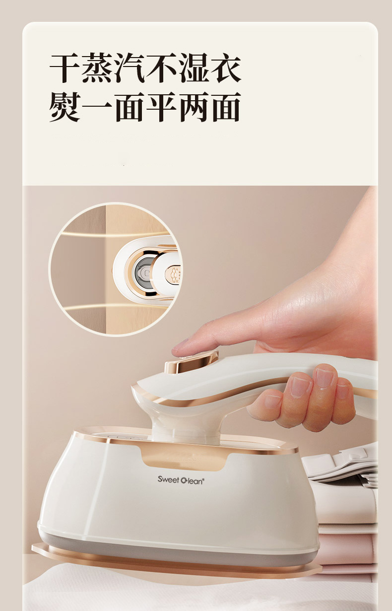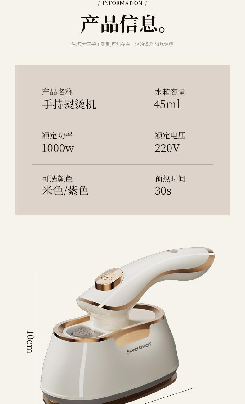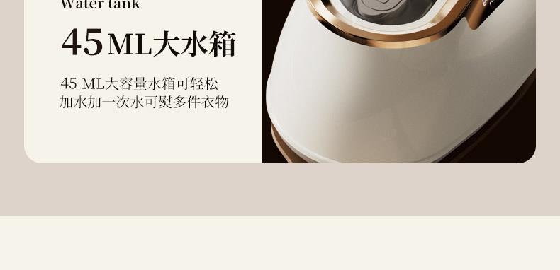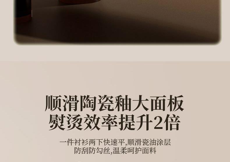 额定功率:1000w 水箱容量:45ml 额定电压:220V 预热时间:30s 额定频率:50HZ 干湿双烫 + 干蒸汽黑科技 聚能高压细腻干蒸汽,强劲穿透软化纤维,瞬抚褶皱;干熨不湿衣、不留水渍,即熨即穿;湿熨打蒸汽深层除皱,双模式适配不同面料需求。 30s 速热 + 1000W 大功率,熨衣不等待 30 秒快速预热出汽,1000W 大功率加持,速熨一步定型,告别漫长等待,一件衬衫两下即平。 顺滑陶瓷釉大面板,效率翻倍还护衣 陶瓷釉涂层防刮防勾丝,熨烫效率提升 2 倍;丝滑推烫不产生二次褶皱,不伤衣、不烘烤、不发黄,精致呵护各种面料。 45ml 大容量水箱,持久熨烫不麻烦 一次加满可持续熨烫 6 分钟,告别频繁加水,轻松搞定全家衣物。 1° 微翘黄金弧度 + 90° 旋转手柄,细节熨烫无死角 1° 微翘弧度烫衣领、纽扣等难烫部位;90° 旋转手柄随心所欲,适配多种面积布料,持烫 / 平烫都顺手。
