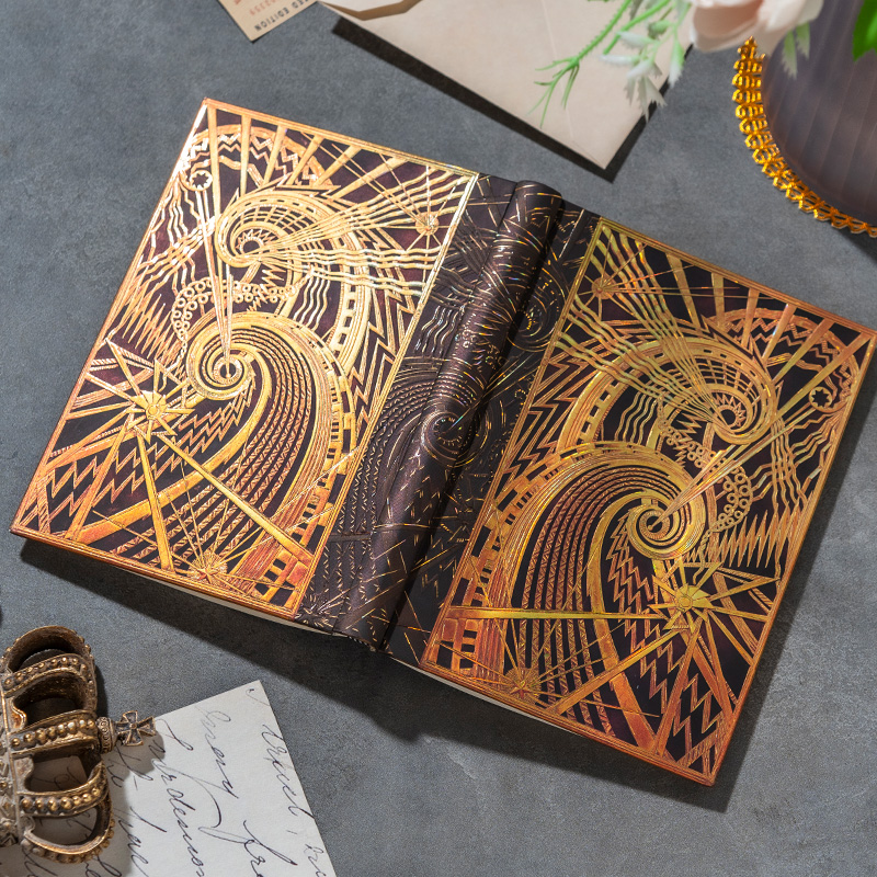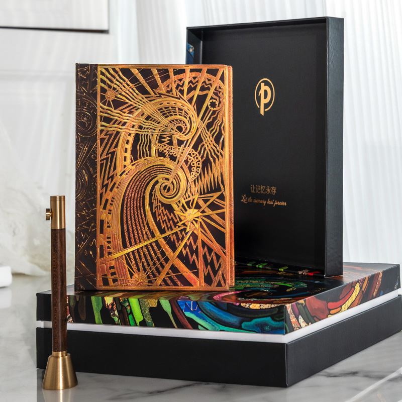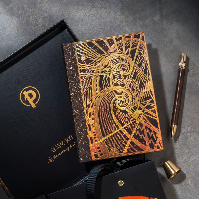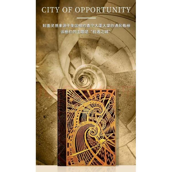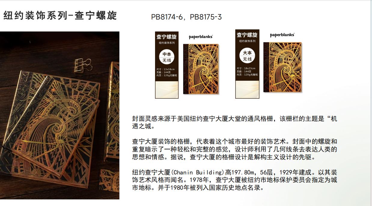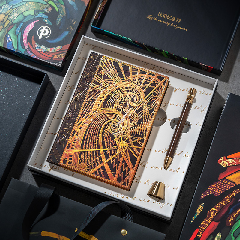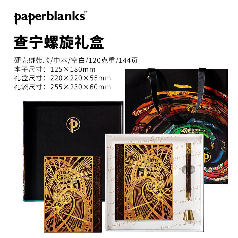 产品:绘梦灵感-查宁螺旋木杆水性笔笔记本礼盒套装 创作灵感:封面灵感来源于美国纽约查宁大厦大堂的通风格栅,该格栅的主体是“机遇之城”。 纽约查宁大厦(Chanin Building)高197.80m,56层,1929年建成。以其装饰艺术风格而闻名。1978年,查宁大厦被纽约市地标保护委员会指定为城市地标。并于1980年被列入历史地点名录。 礼盒组件:黑柿木水性笔1只、黄铜笔座1个、中本笔记本、天地盖礼盒、彩色礼袋 礼盒尺寸:220*220*55mm 礼袋尺寸:255*230*60mm 本子尺寸:130*180mm 本子页数:144页 纸张材质:120克重无酸纸