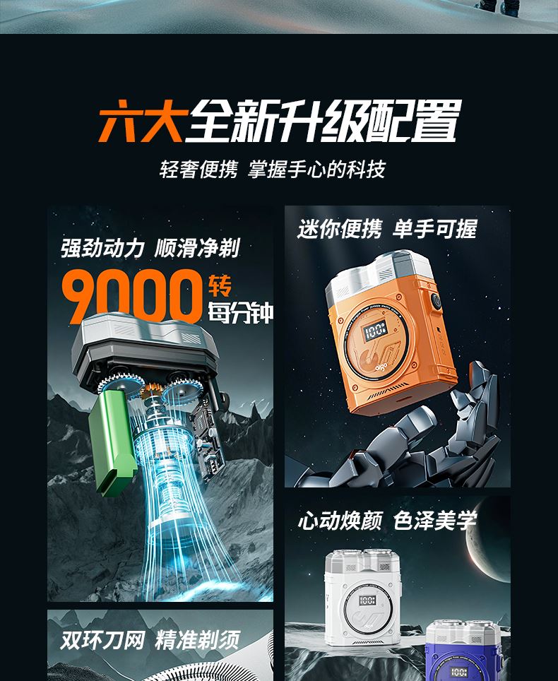 8500 转的 FF-131 电机动力充沛,运转平稳,噪音小 采用使用寿命长,安全性能高,内阻小的聚合物 400aMh 锂电池 方便快捷的 Type-C 充电接口 双刀头设计,更高效应对各部位的长短毛发 美观简约的结构外观设计 实时电量显示 大容量锂电池,电量无忧 一键开关,使用方便、简洁 IPX6防水标准,全身水洗,方便清洁 材 质:ABS 尺 寸:56*28*69mm 重 量:0.15Kg 电池容 量:400mAh 功 率:5W 防 水:IPX6