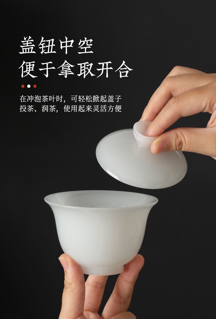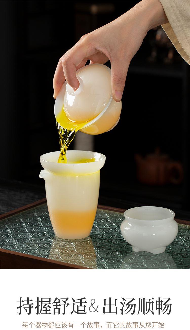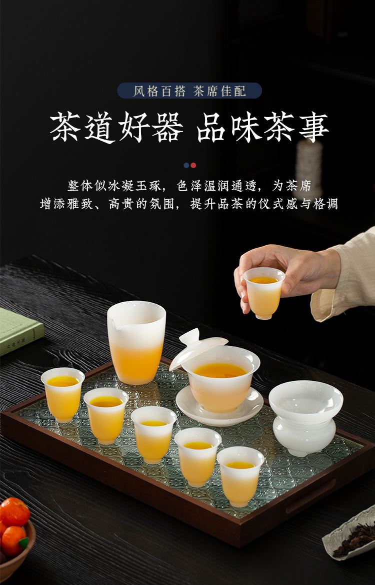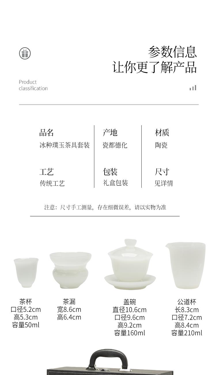 配置:品茗杯*6 公道杯*1 盖碗*1 茶漏*1 皮包*1 材质:璞玉 礼盒尺寸:38.7cm*13.6cm*26.5cm 产品尺寸:盖碗:容量160ml 品茗杯: 容量50ml 公道杯:容量210ml