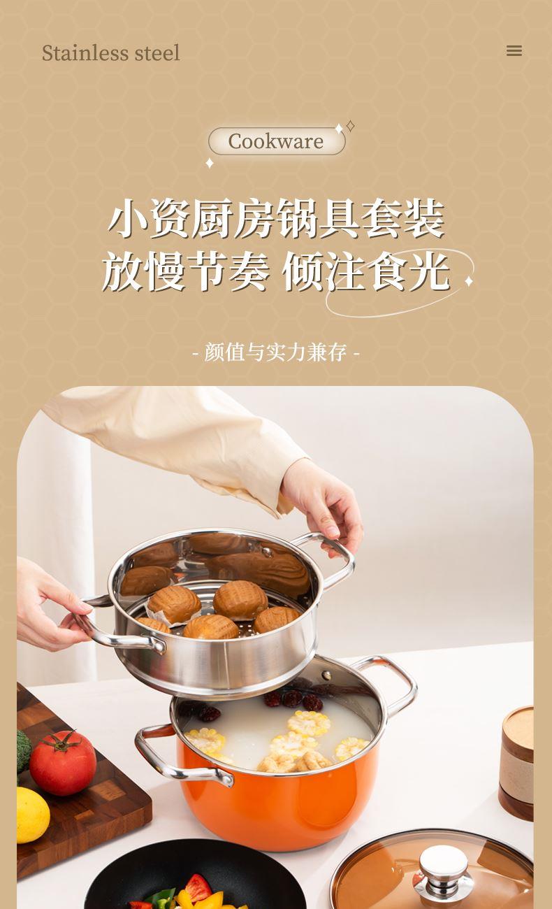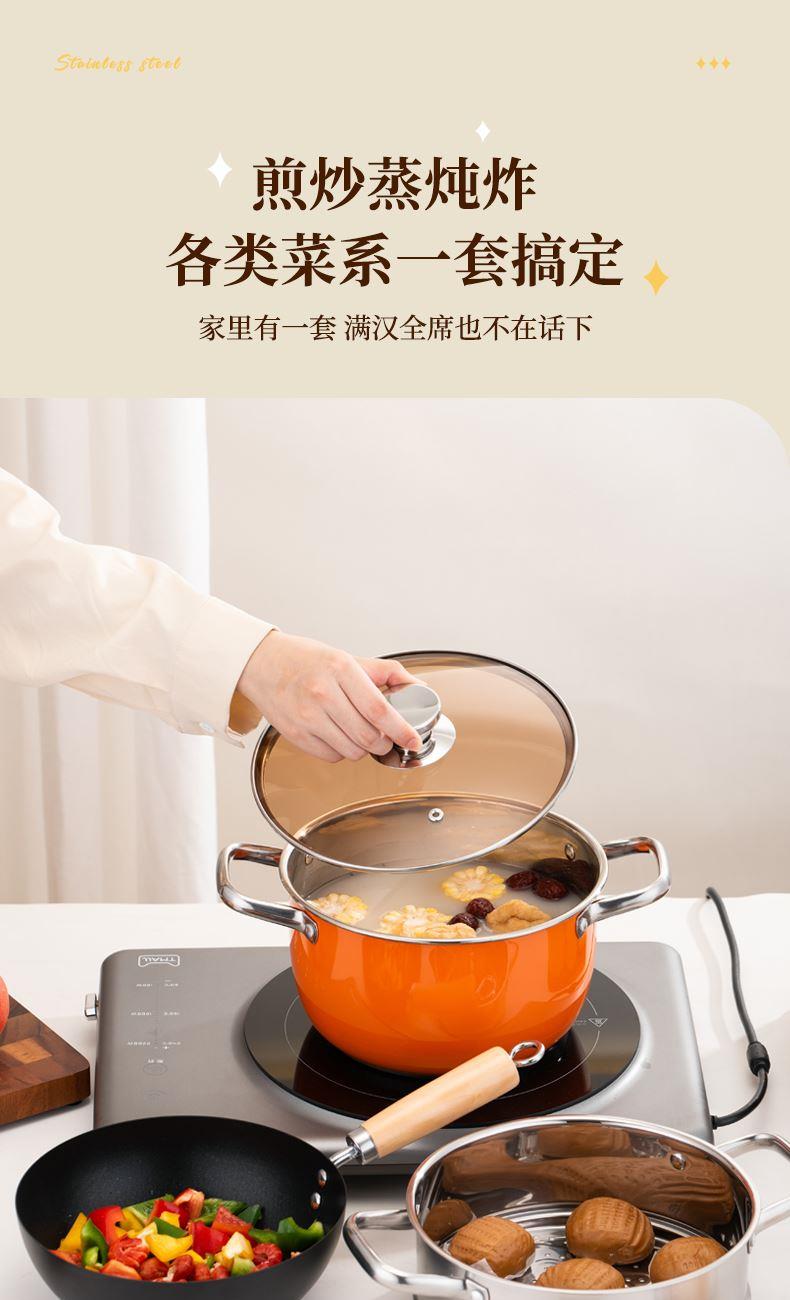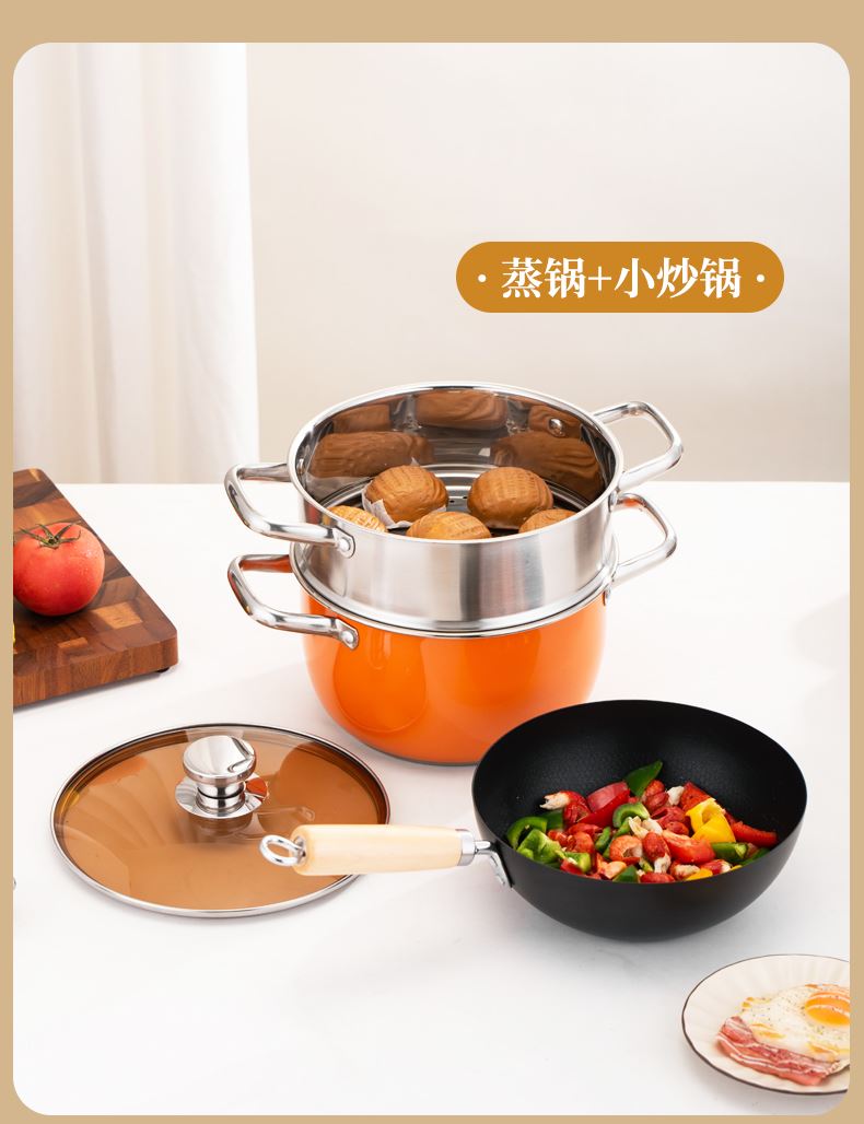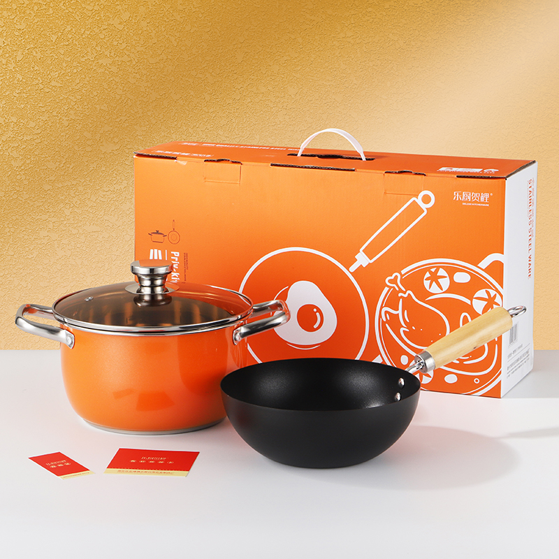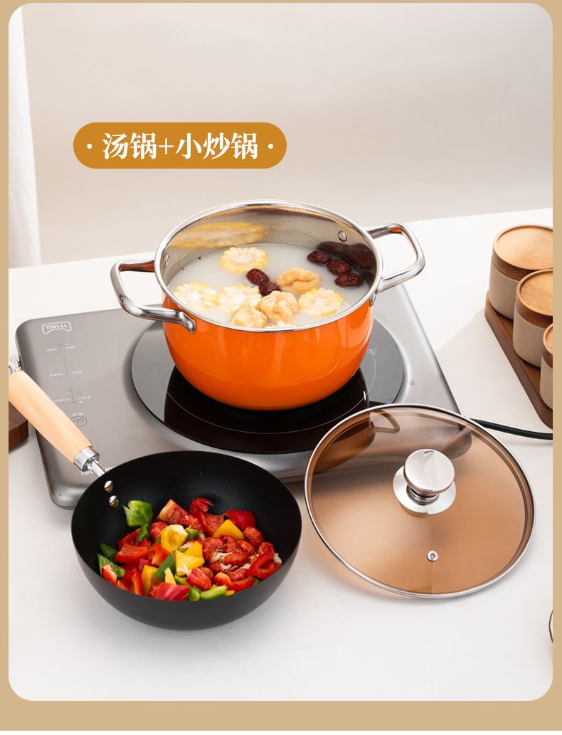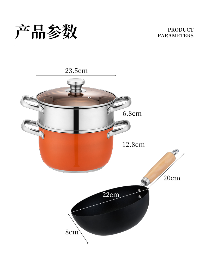 产品规格:22cm炒锅+24cm汤锅 产品材质:201不锈钢 包装方式:opp透明袋+手提彩盒 彩盒尺寸:49*13.6*27cm 外箱尺寸:86*50*56 cm 条 码:6959460800566 小资锅具套装,加厚蒸锅+炒锅 家里有一套,满汉全席也不在话下 煎炒蒸炖炸各类菜系一套搞定 高颜值小炒锅,爆炒无压力 温馨提示:橙色锅为了保持锅身美观不建议明火使用