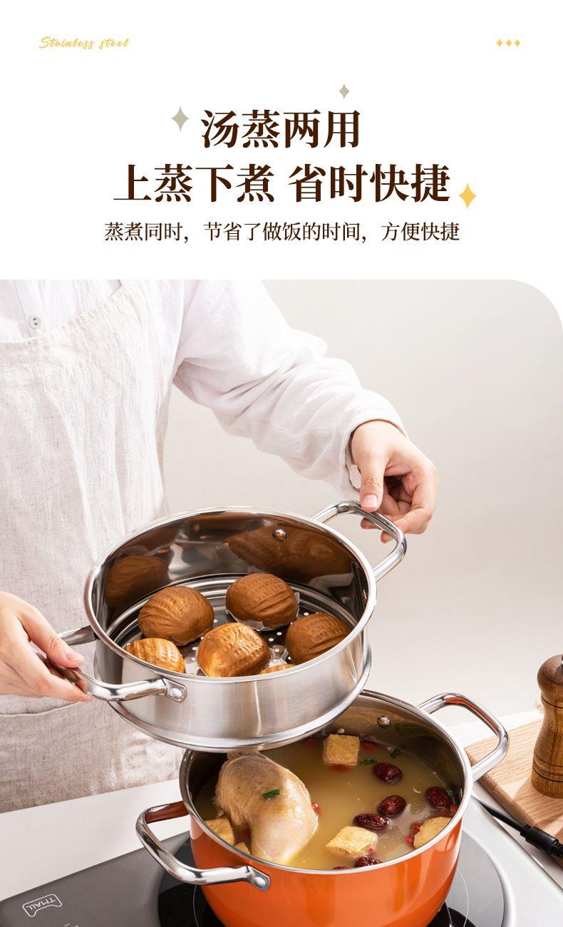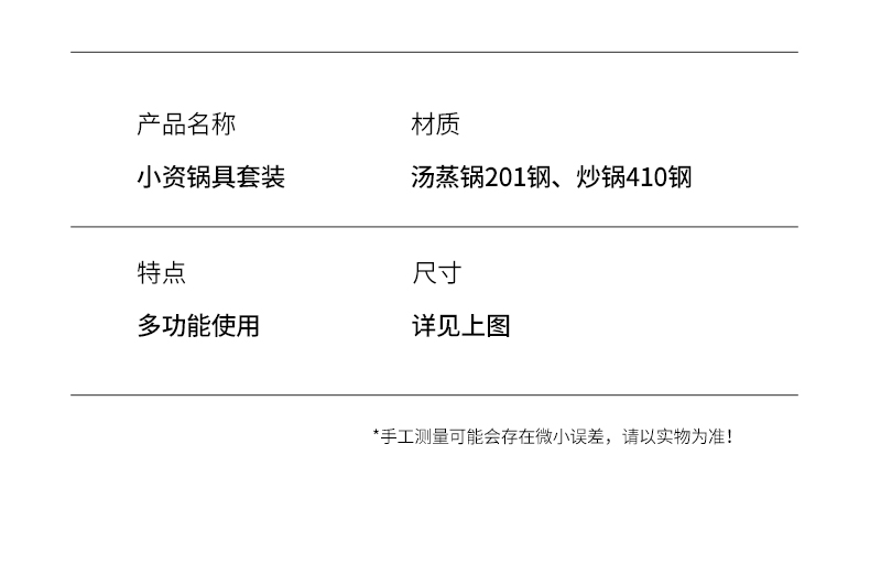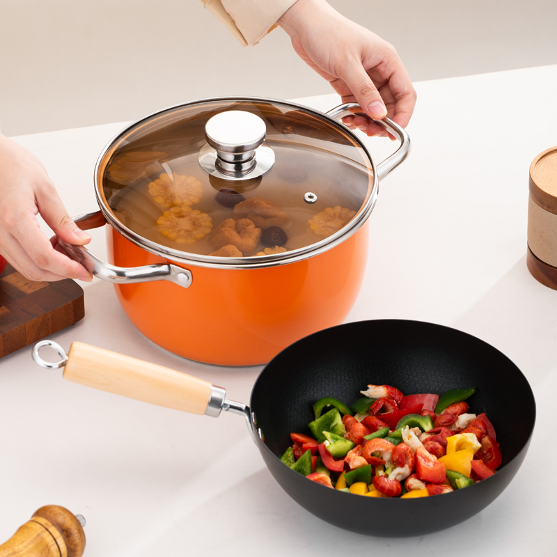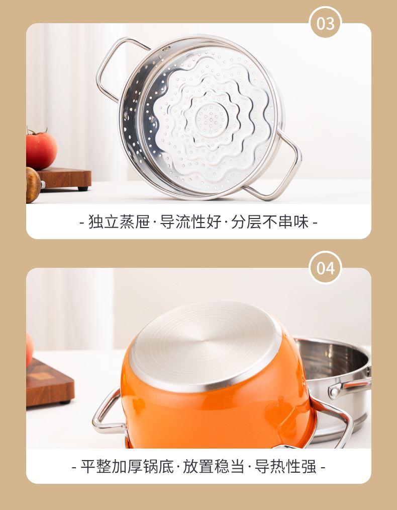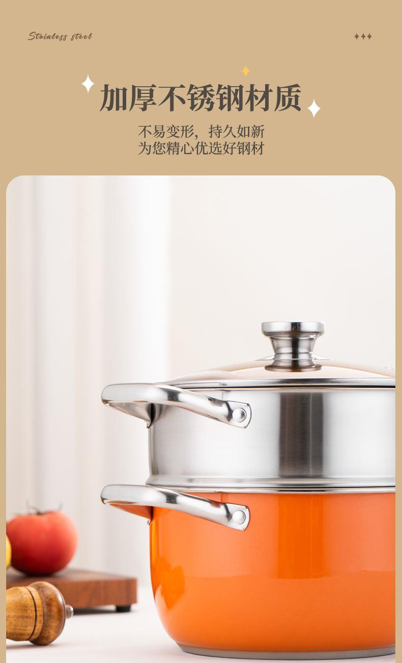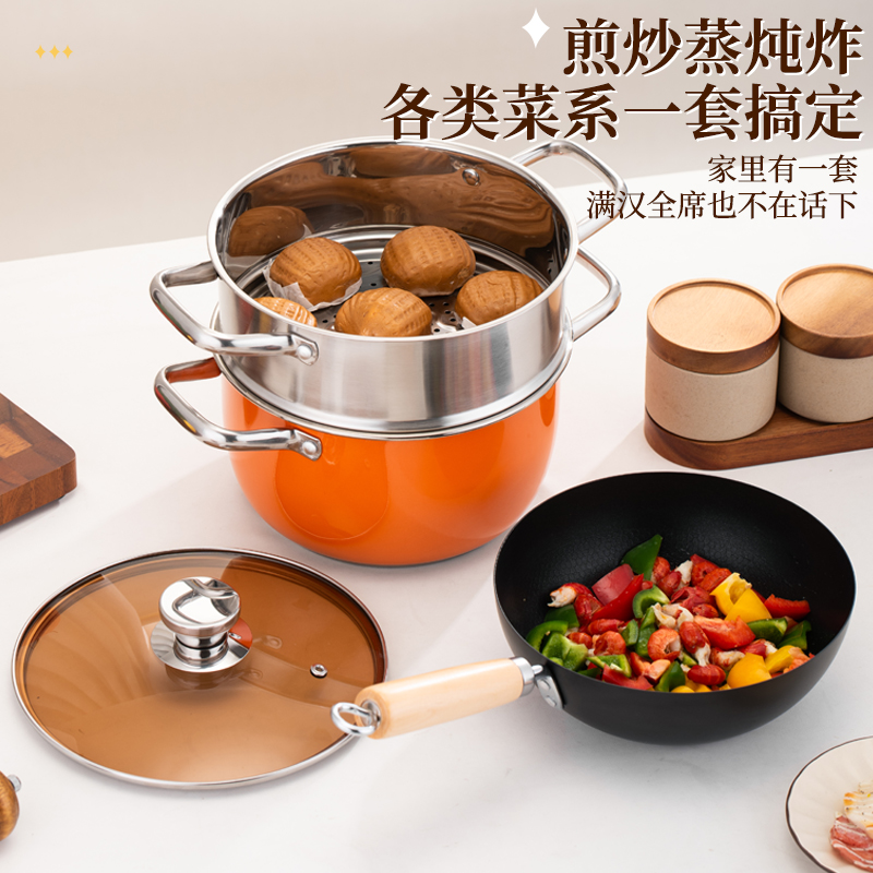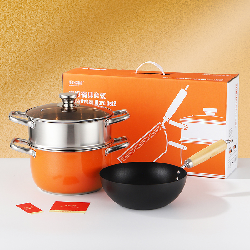 产品规格:22cm炒锅+24cm汤锅 产品材质:201不锈钢 包装方式:opp透明袋+手提彩盒 彩盒尺寸:49*13.6*27cm 外箱尺寸:86*50*56 cm 条 码:6959460800566 小资锅具套装,加厚蒸锅+炒锅 家里有一套,满汉全席也不在话下 煎炒蒸炖炸各类菜系一套搞定 高颜值小炒锅,爆炒无压力 温馨提示:橙色锅为了保持锅身美观不建议明火使用