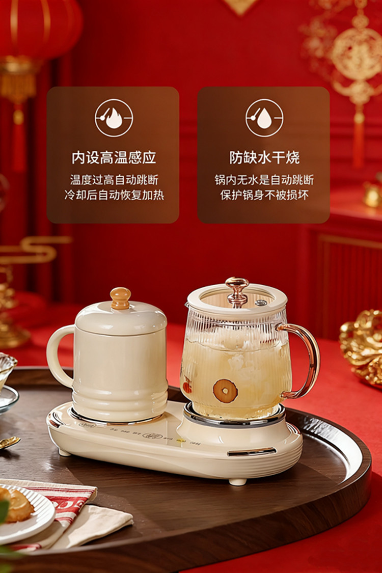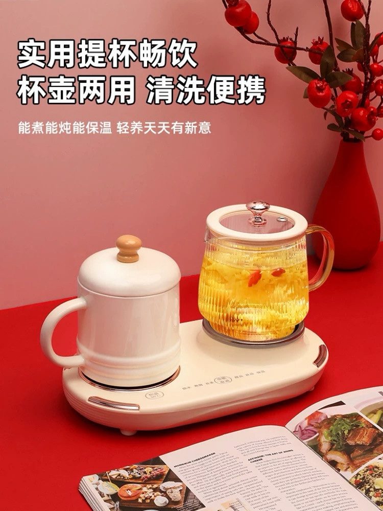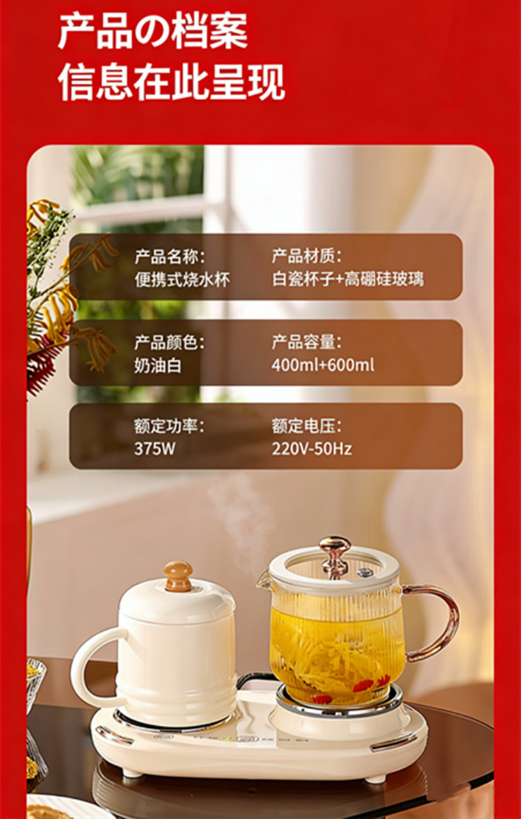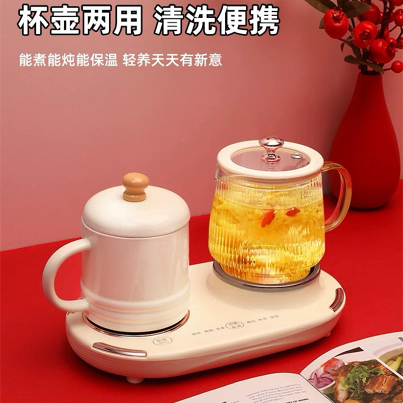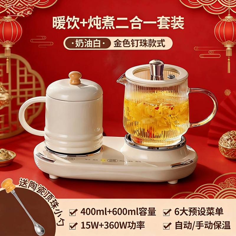 额定功率:375W 额定电压:220V 产品颜色:奶油白 主机容量:400ML+600ML 产品款式:微电脑轻触操作 产品规格:二合一养生壶套装 包装清单:白瓷水杯+高硼硅玻璃壶+勺子+底座 特色功能 1、双底座养生壶炖煮二合一,左边保温,右边炖煮同享; 2、1壶1杯一套装,6大预设功能,15W暖饮,375W; 3、600ML炖煮养生杯+400ML恒温杯二合一; 4、分体式养生壶杯壶,清洗方便,提壶即饮; 5、高硼硅玻璃壶+白瓷饮水杯,高温防干烧自动断电; 6、自动断电,防干烧功能;一机多用,可用于婴儿暖奶及保温;
