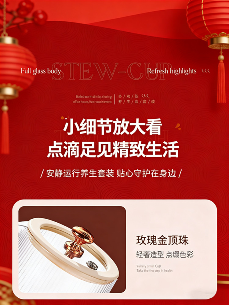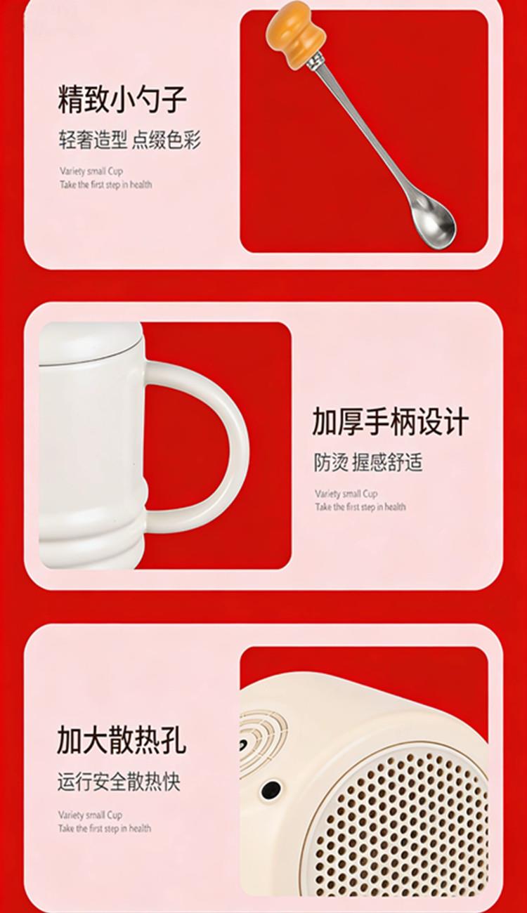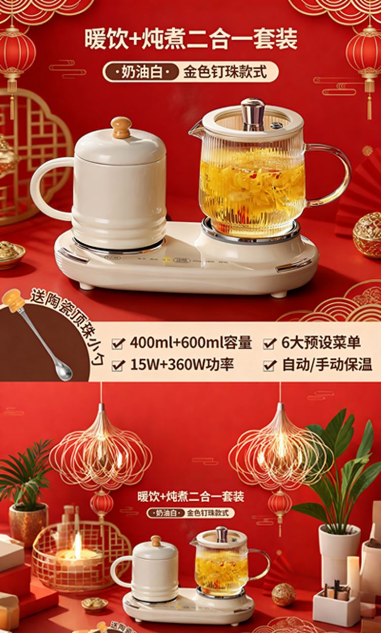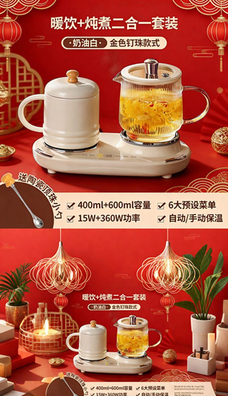 额定功率:375W 额定电压:220V 产品颜色:奶油白 主机容量:400ML+600ML 产品款式:微电脑轻触操作 产品规格:二合一养生壶套装 包装清单:白瓷水杯+高硼硅玻璃壶+勺子+底座 特色功能 1、双底座养生壶炖煮二合一,左边保温,右边炖煮同享; 2、1壶1杯一套装,6大预设功能,15W暖饮,375W; 3、600ML炖煮养生杯+400ML恒温杯二合一; 4、分体式养生壶杯壶,清洗方便,提壶即饮; 5、高硼硅玻璃壶+白瓷饮水杯,高温防干烧自动断电; 6、自动断电,防干烧功能;一机多用,可用于婴儿暖奶及保温;