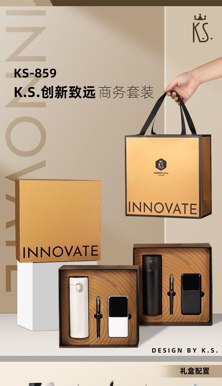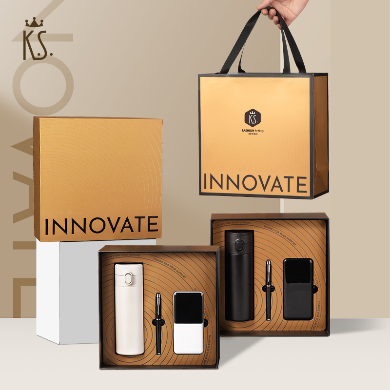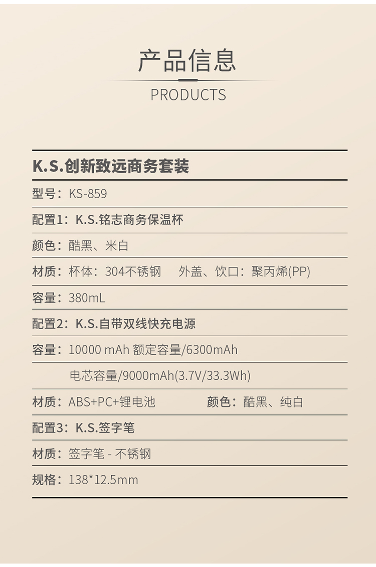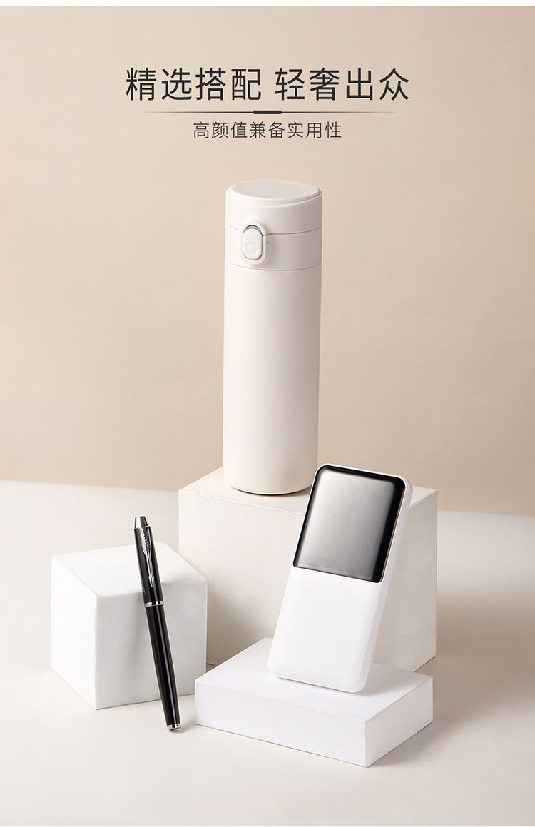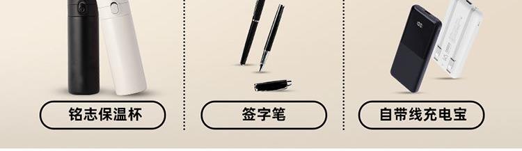 •材质:1.充电宝:ABS+PC+锂电池 2.保温杯:304不锈钢 食品级PP 3.签字笔:银色金属笔夹+金属珠光烤漆外壳 •规格:1.充电宝:容量/10000mAh+22.5W快充 2.142*68*20MM(3C认证) 3.保温杯:380ML 4.签字笔:140*150MM •包装:礼盒(配礼袋) 商务经典礼盒套装,以金色和黑色为配色主调,凸显其轻奢高雅、商务端庄的产品属性。是作为商务往来伴手礼、周年庆典、会议、节日慰问、活动营销礼的佳选礼品。 套盒配有自带双线1万毫安快充移动电源一只、304不锈钢商务保温杯一只、烤漆金属签字笔一只,做工精致、品质上乘,时尚简约。 礼盒、礼袋、内容物件上均可实现中小批量成品订制,全套订制方案输出,为企业宣传添砖助力。