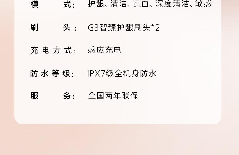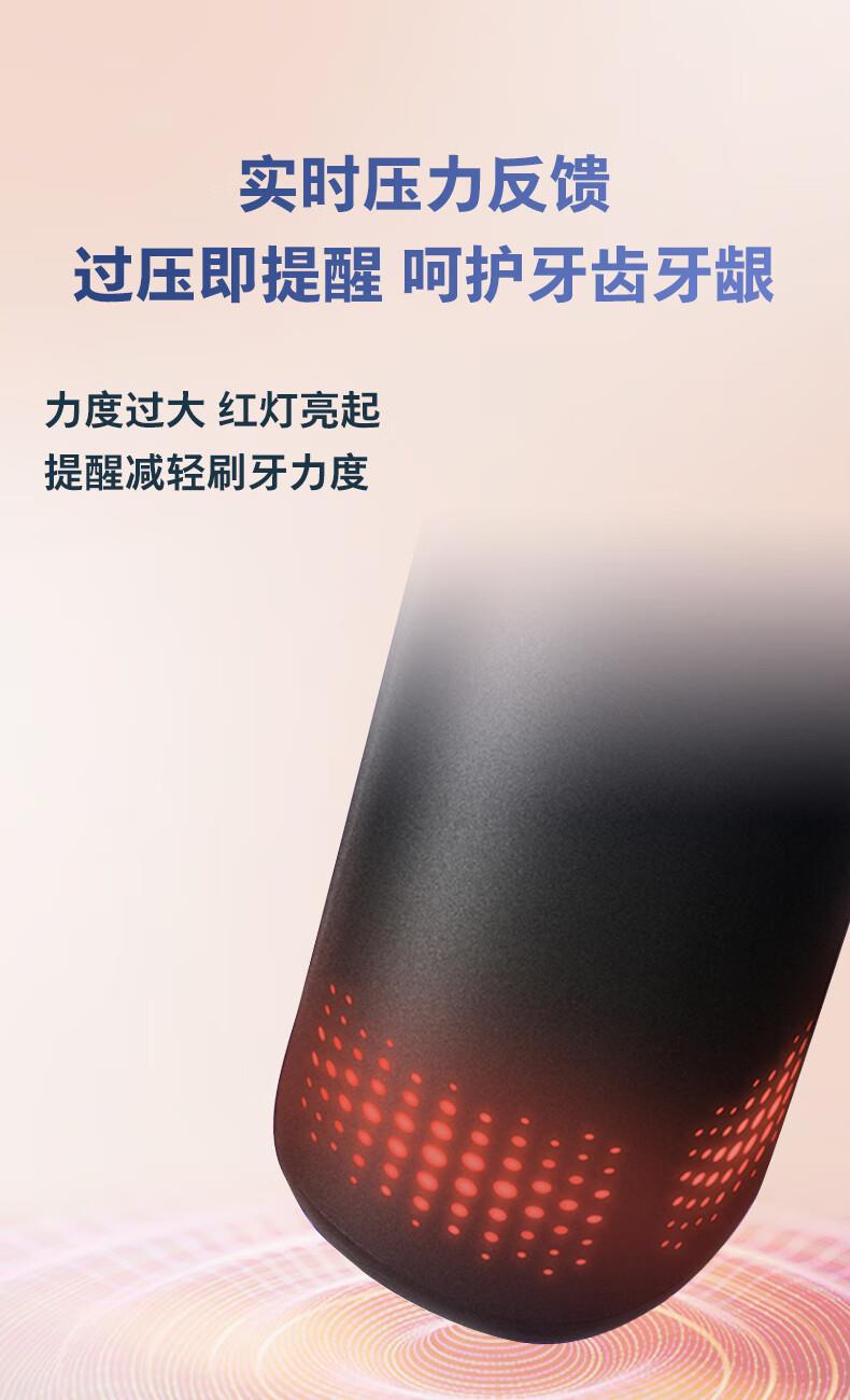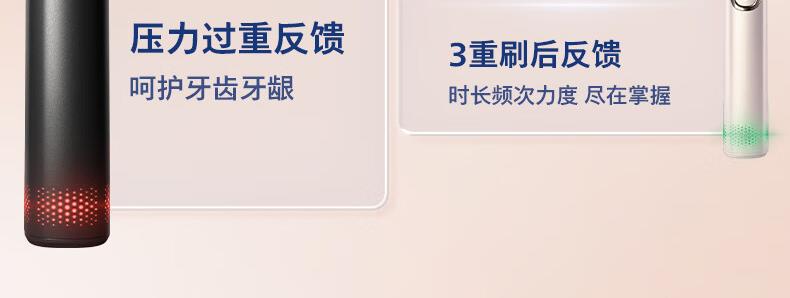 • SmarTimer 2 分钟智能计时器和 QuadPacer 30 秒时段定时器实现佳刷牙效果 • 5 种模式:清洁、专业护龈、深层清洁、敏感、亮白,口腔周到护理 • G3护龈刷头,凝胶全包裹,能够吸收施加在牙龈上的多余压力 • 内置智能互动彩屏可就您的刷牙力度、刷牙时间、电池寿命提供即时反馈,同时提醒您应更换刷头 • 智能压力感应灯环,通过刷柄内置的压力传感器实时感应,刷牙力度尽掌控。