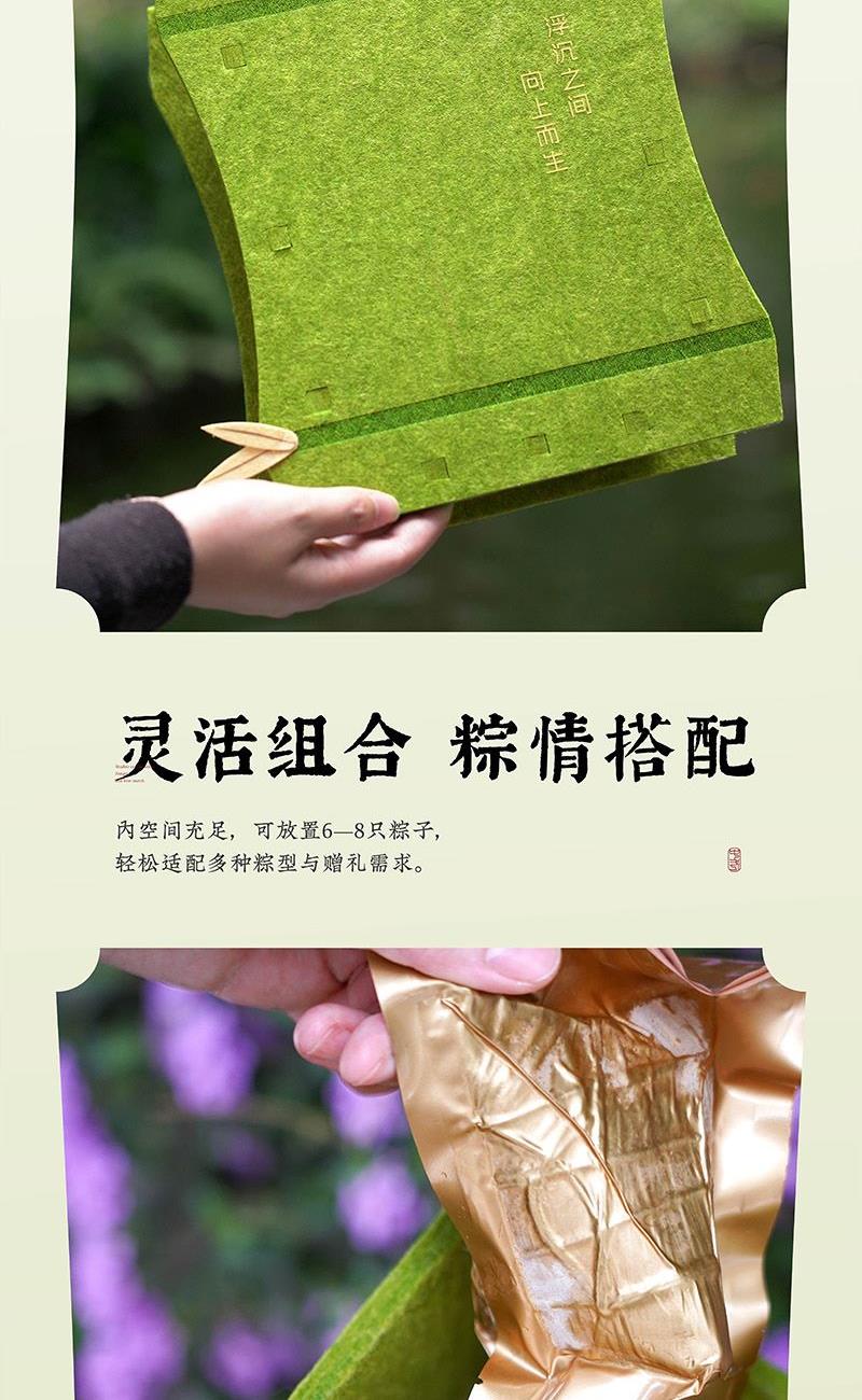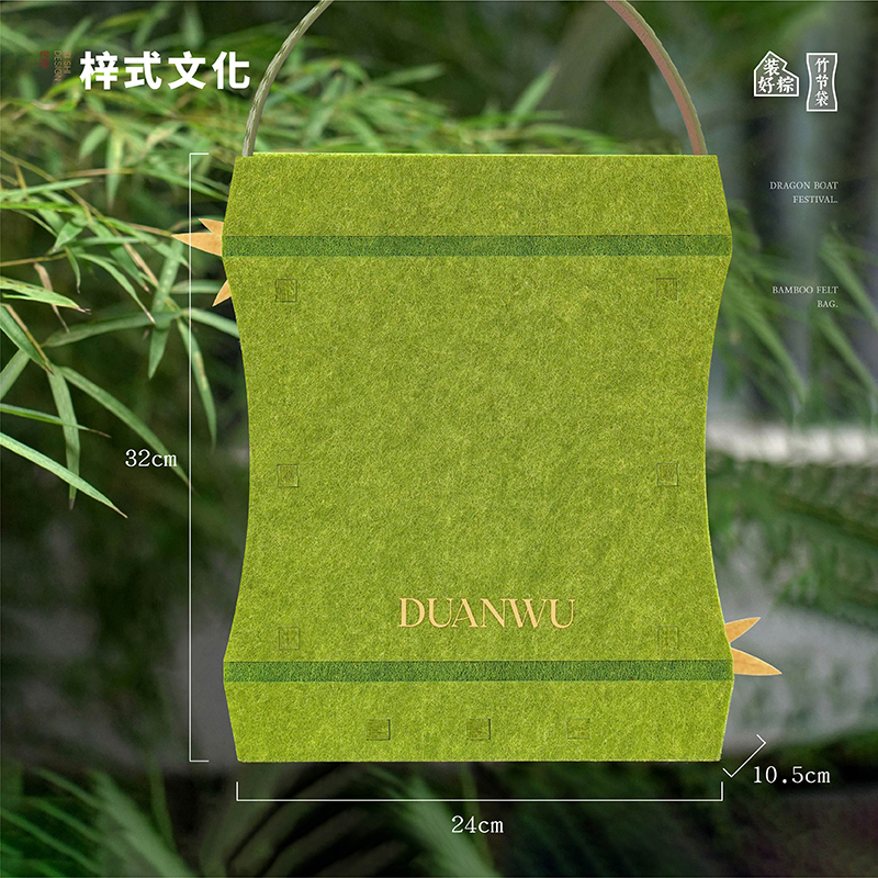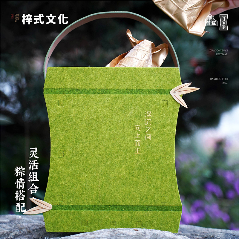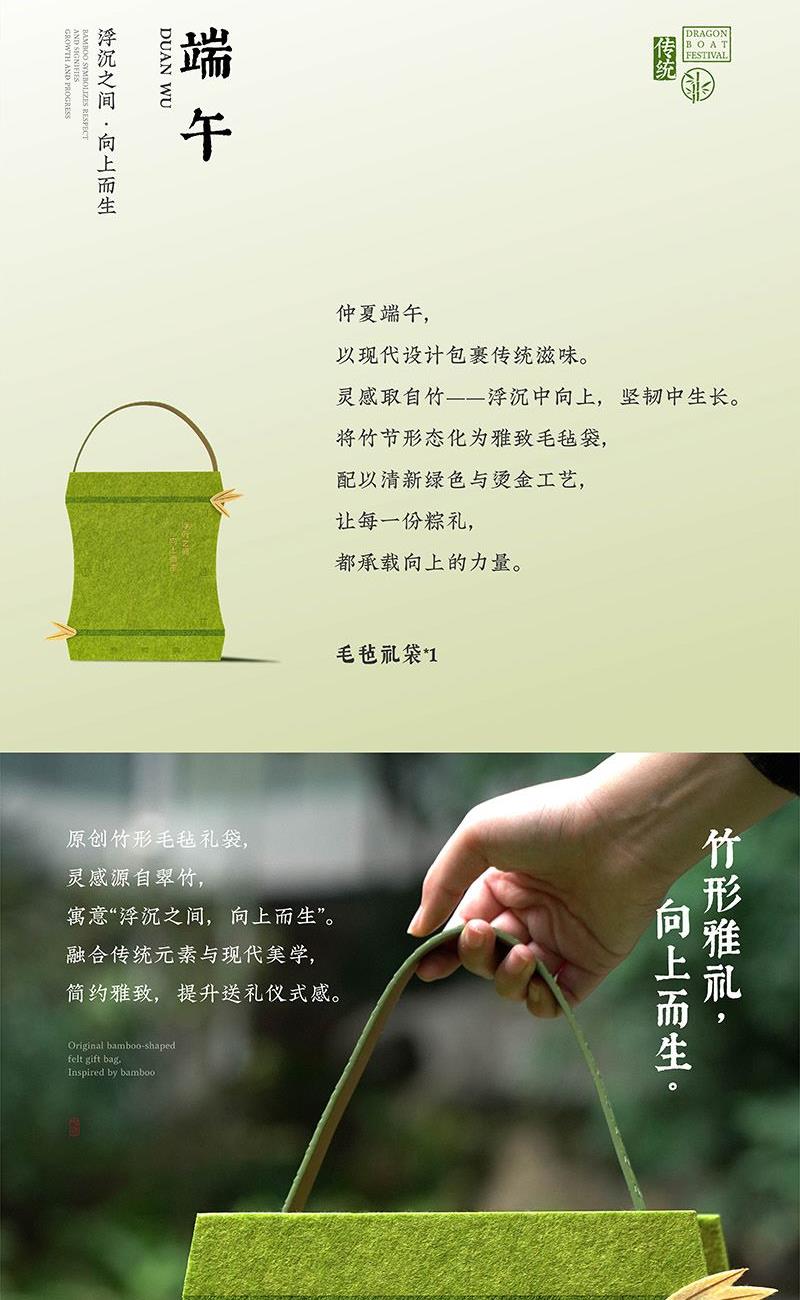 仲夏端午,以现代设计包裹传统滋味。 灵感取自竹——浮沉中向上,坚韧中生长。 将竹节形态化为雅致毛毡袋,配以清新绿色与烫金工艺, 让每一份粽礼,都承载向上的力量。 产品 / Product Mini 粽子毛毡袋 材质 / Material 毛毡 规格 / Size 礼盒:27*22.7*10.3cm 产品容量:可放6—8个粽子