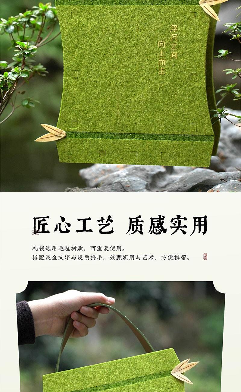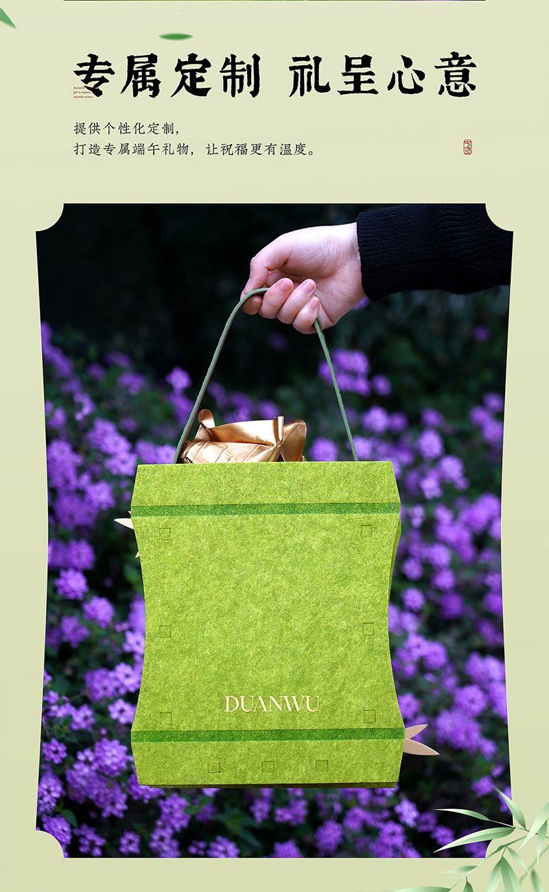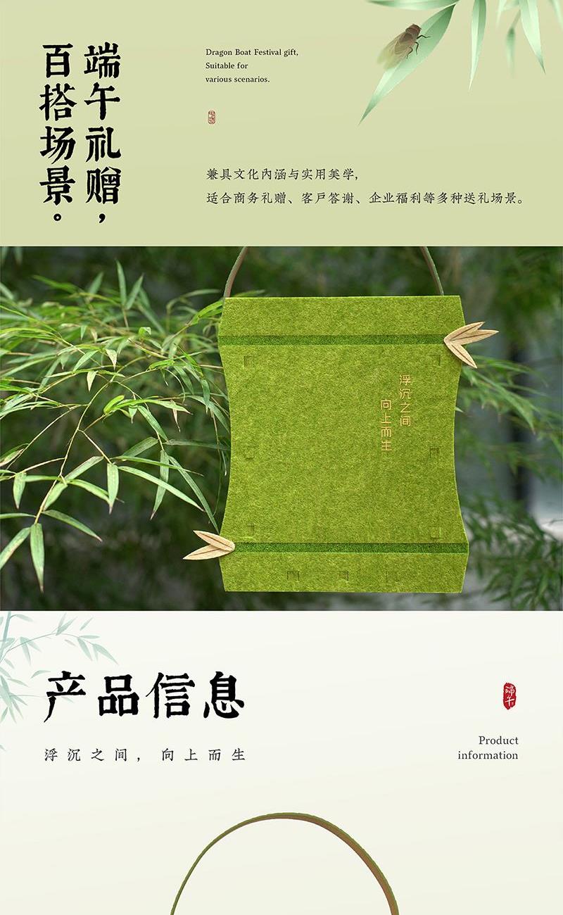 仲夏端午,以现代设计包裹传统滋味。 灵感取自竹——浮沉中向上,坚韧中生长。 将竹节形态化为雅致毛毡袋,配以清新绿色与烫金工艺, 让每一份粽礼,都承载向上的力量。 产品 / Product Mini 粽子毛毡袋 材质 / Material 毛毡 规格 / Size 礼盒:27*22.7*10.3cm 产品容量:可放6—8个粽子