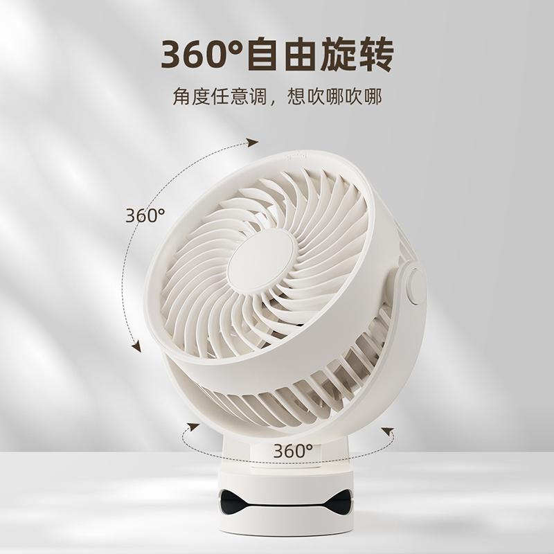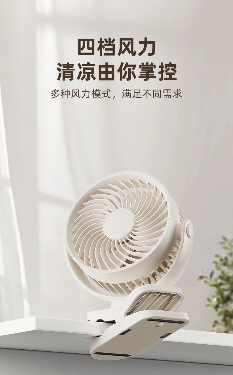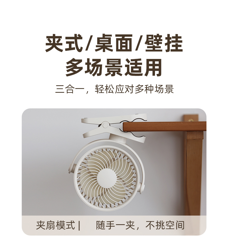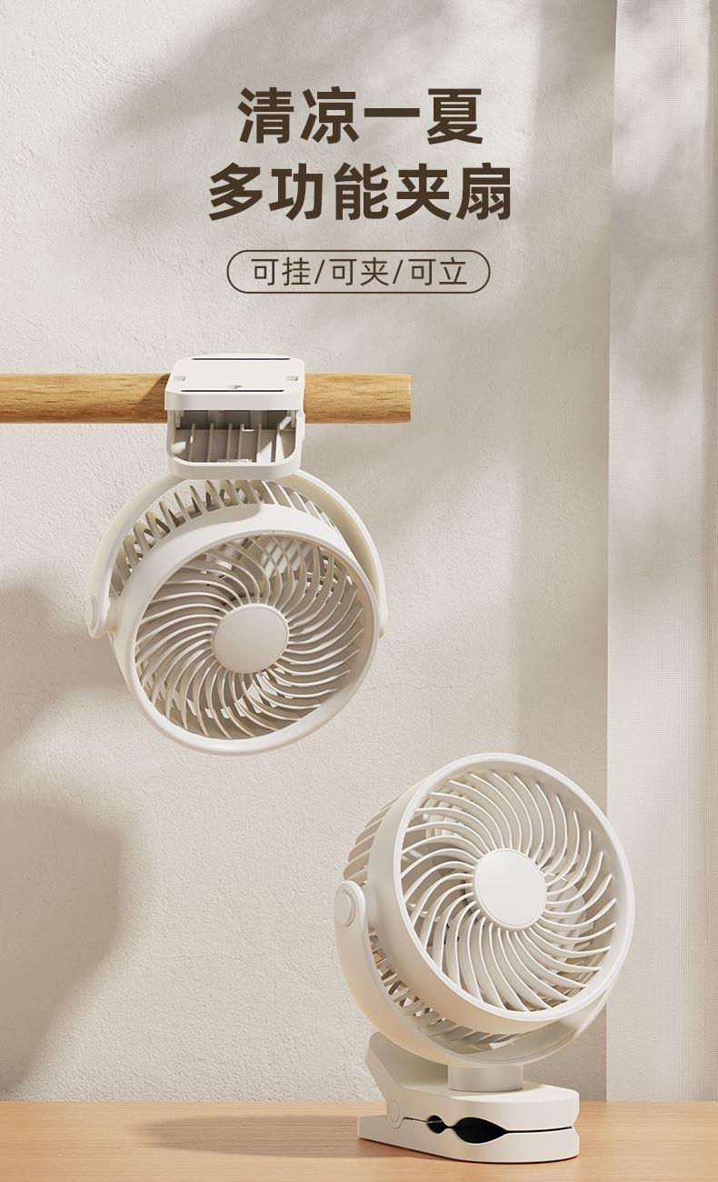 *三合一场景适用桌面/夹式/壁挂 *四档风力调节 *360°自由旋转调节角度 *材质:ABS+PP+电子元器件 *产品尺寸:151.6x128.4x177.5mm *彩盒尺寸:150*75*190mm *外箱尺寸:7.5X47X39cm *单个净重/毛重:387g/500g *整箱净重/毛重:17.2kg/18kg
