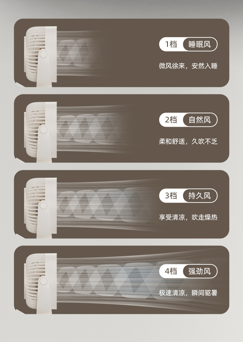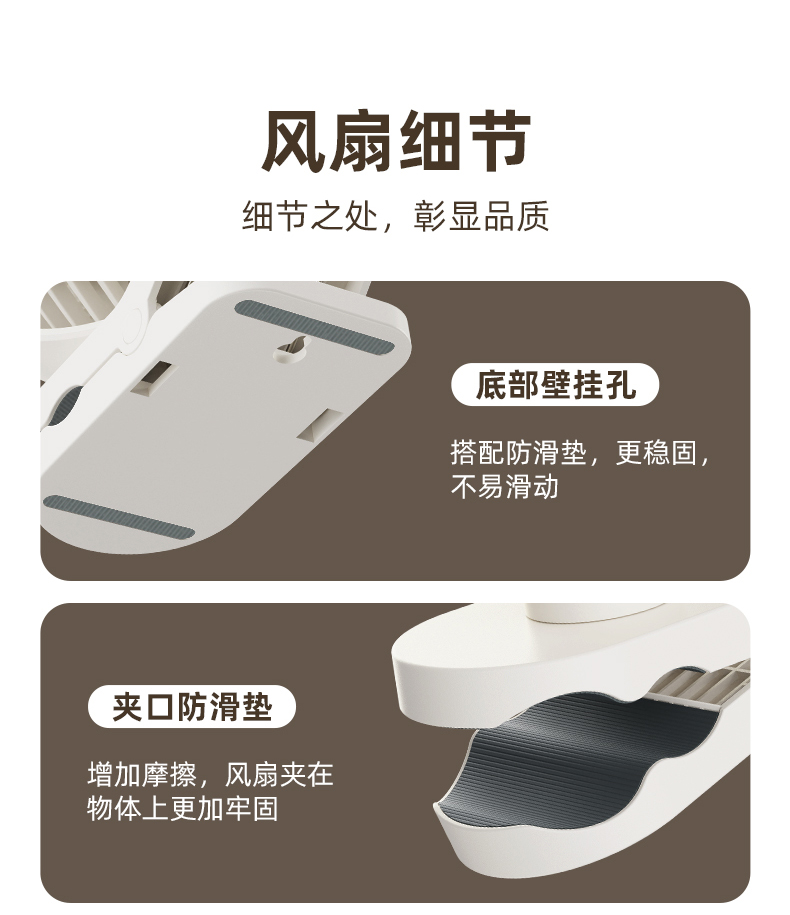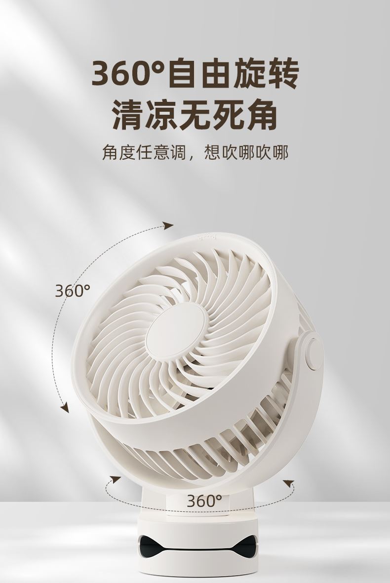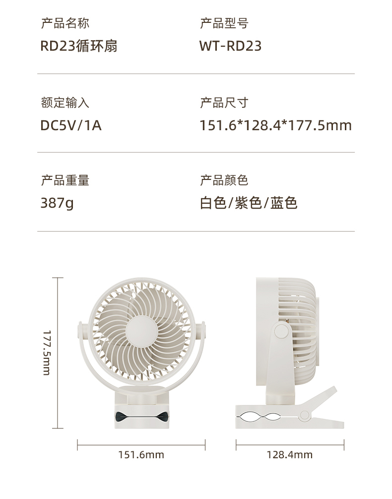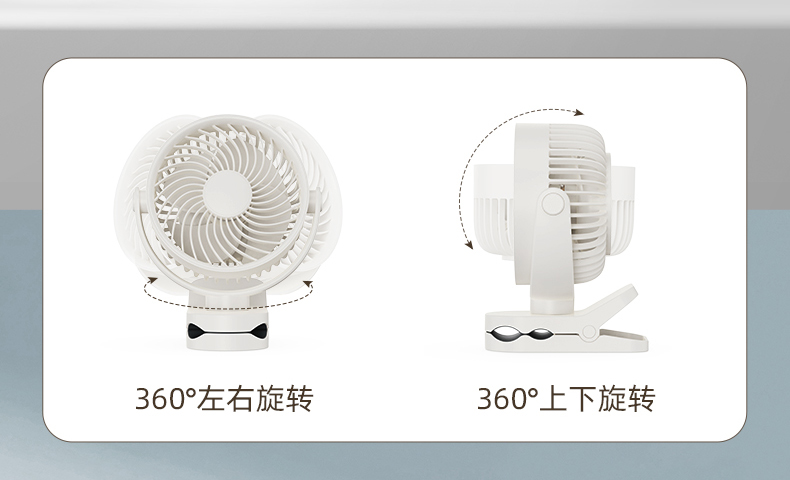 *三合一场景适用桌面/夹式/壁挂 *四档风力调节 *360°自由旋转调节角度 *材质:ABS+PP+电子元器件 *产品尺寸:151.6x128.4x177.5mm *彩盒尺寸:150*75*190mm *外箱尺寸:7.5X47X39cm *单个净重/毛重:387g/500g *整箱净重/毛重:17.2kg/18kg