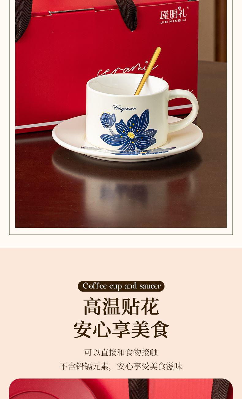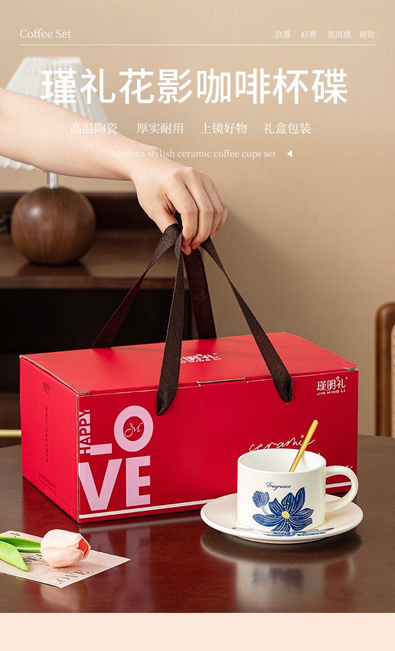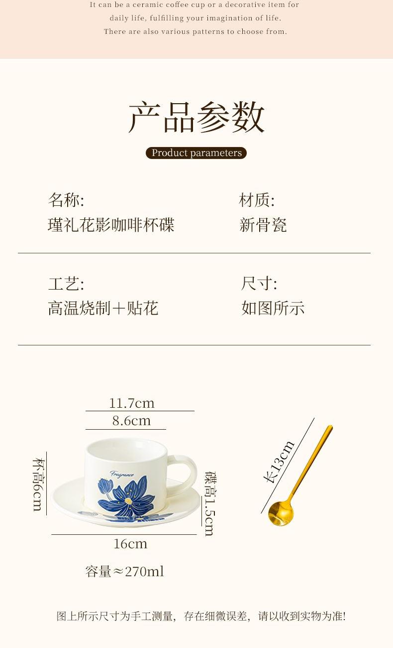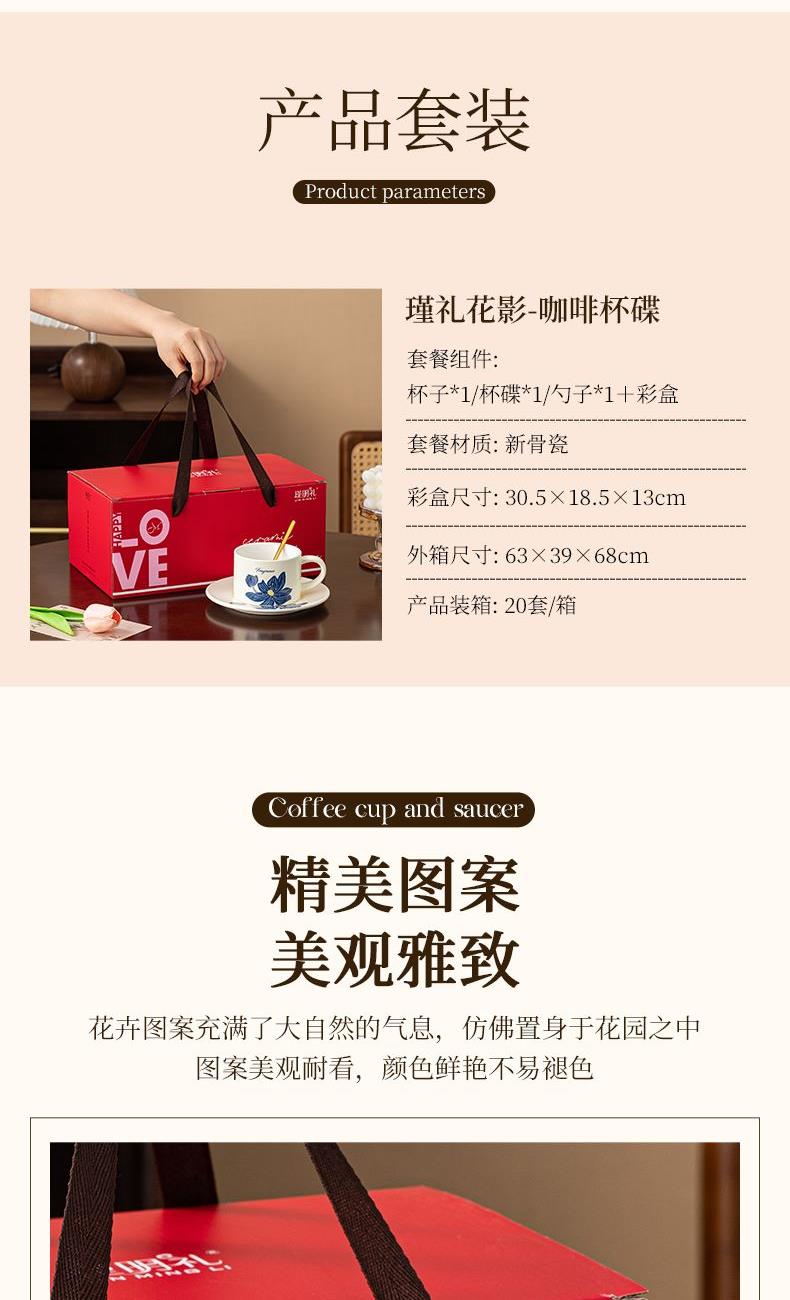 瑾礼花影-咖啡杯碟-1杯1碟1勺 - 产品组成:整套=1杯1碟1勺+彩盒 产品材质:新骨瓷 容量:270ml 产品规格:杯=口径8.6cm,高度=6cm;碟=长度16cm, 金勺=长13cm; 彩盒尺寸:30.5*18.5*13cm 产品毛重:0.8kg 整箱毛重:17.2kg 外箱尺寸:63*39*68cm - 花朵和植物图案能够让消费者在使用咖啡杯碟时感受到大自然的气息,仿佛置身于花园或森林之中。这种亲近自然的感觉能够缓解压力,带来内心的宁静和放松。消费者可以根据自己的喜好和需求选择具有特定寓意的图案,赋予咖啡杯碟更深层次的情感价值。