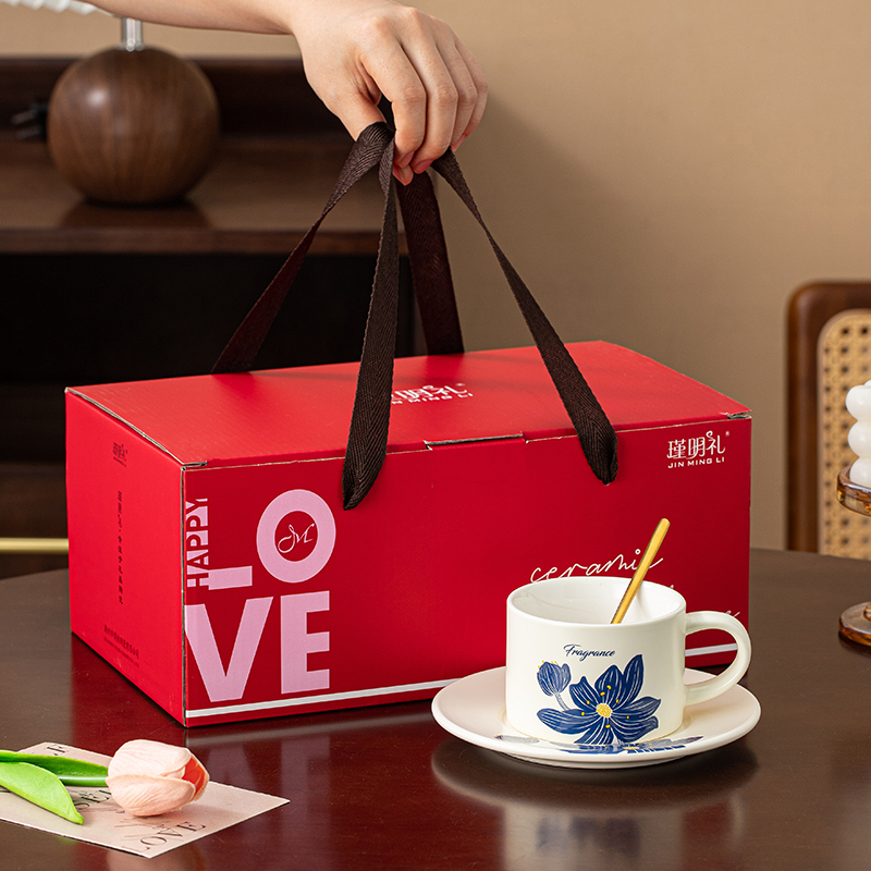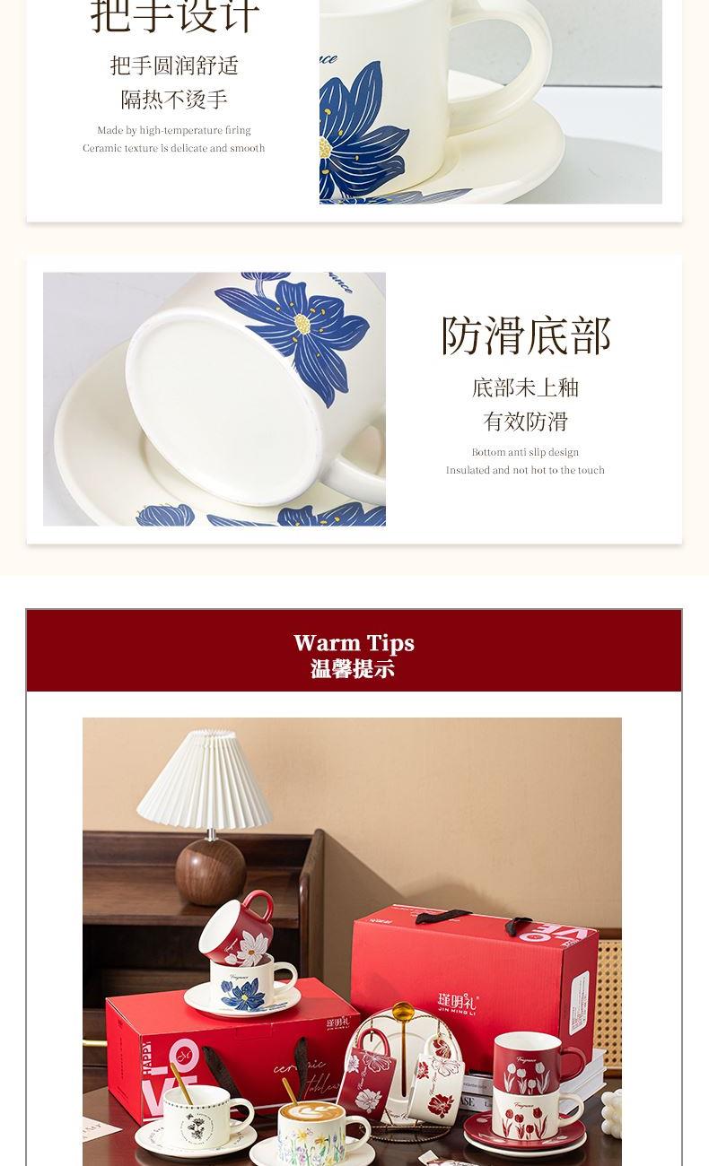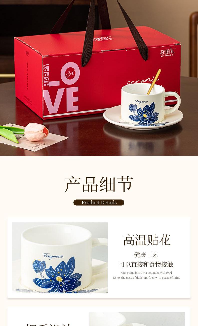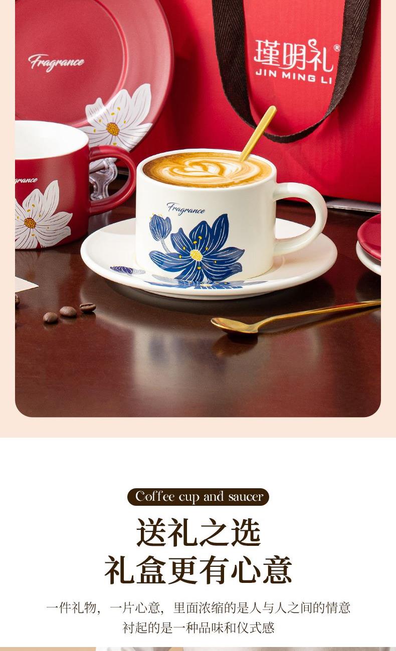 瑾礼花影-咖啡杯碟-1杯1碟1勺 - 产品组成:整套=1杯1碟1勺+彩盒 产品材质:新骨瓷 容量:270ml 产品规格:杯=口径8.6cm,高度=6cm;碟=长度16cm, 金勺=长13cm; 彩盒尺寸:30.5*18.5*13cm 产品毛重:0.8kg 整箱毛重:17.2kg 外箱尺寸:63*39*68cm - 花朵和植物图案能够让消费者在使用咖啡杯碟时感受到大自然的气息,仿佛置身于花园或森林之中。这种亲近自然的感觉能够缓解压力,带来内心的宁静和放松。消费者可以根据自己的喜好和需求选择具有特定寓意的图案,赋予咖啡杯碟更深层次的情感价值。