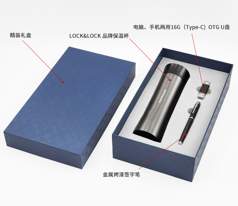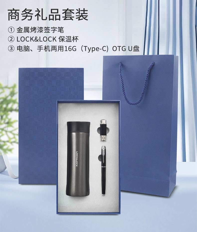 礼盒配置 : 1、型号:LHC4028 400ML LOCK&LOCK 保温杯 2、电脑、手机双用16G(Type-c) OTG优盘 3、金属烤漆签字笔 4、包装盒尺寸 : 182x326x75mm 5、手提袋尺寸:192x346x85mm 6、重量:约25kg/箱
